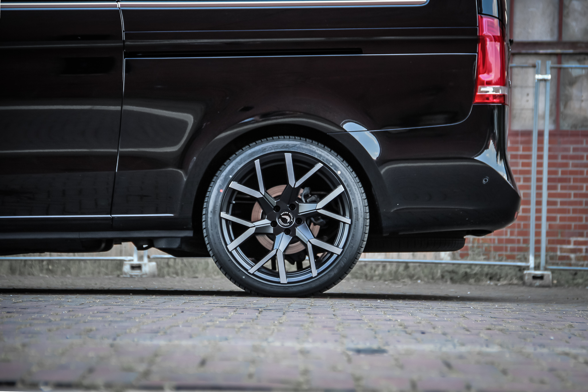 The V 250 d is fitted with 9x20" rims with 245/40R20 tires all around. Matching the deep black paintwork of the spacious minibus, the dark gunmetal brushed finish was chosen. While in this example a dark gray-black coloring characterizes the rim, bright accents are brilliantly set by the V-shaped end of each of the six spokes because their fronts were brushed subsequently.