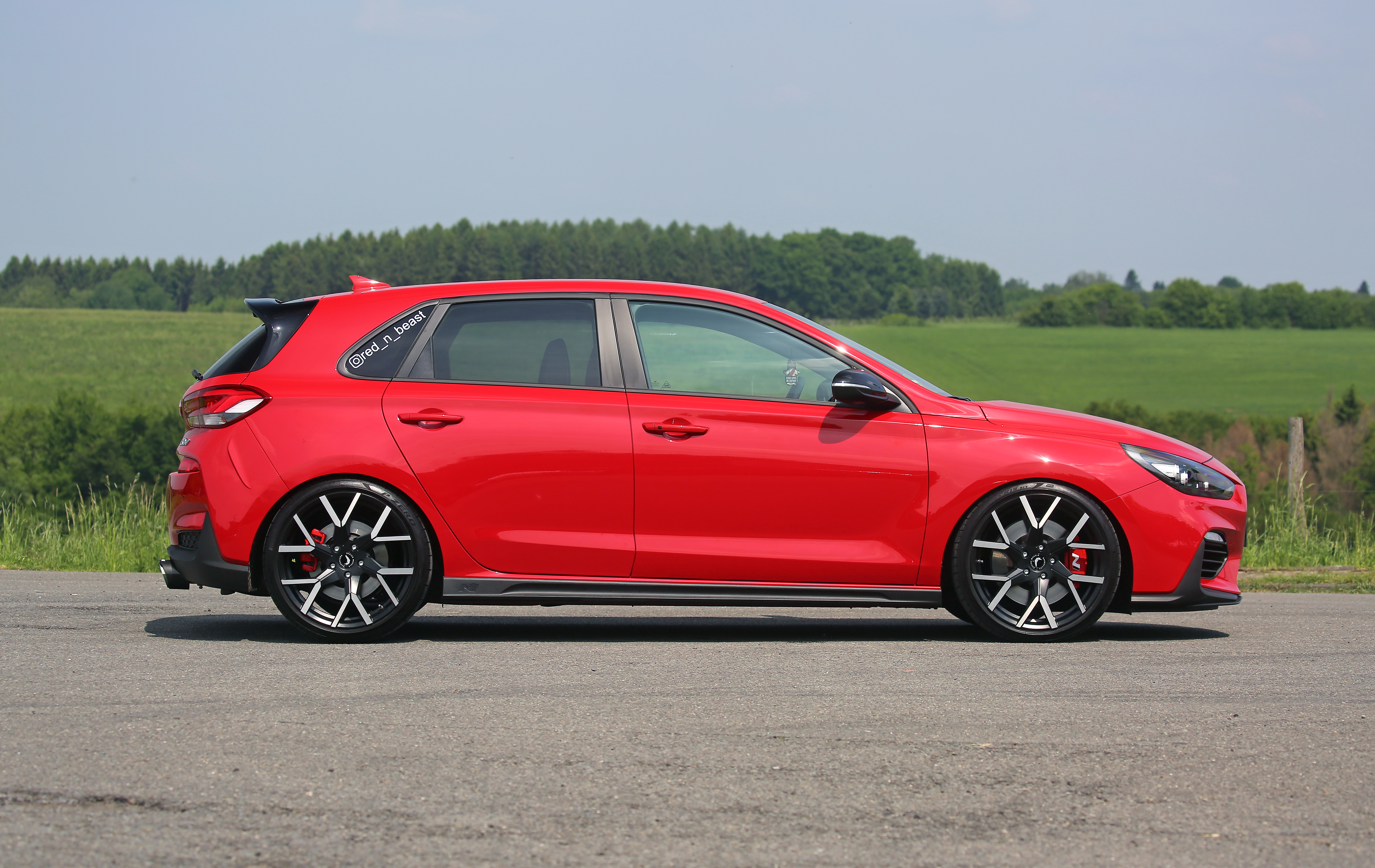 The Tzunamee EVO rims with their striking, asymmetrical Y-spoke design are fitted on the axles of this compact, red Hyundai sports car, measuring in at 8.5x19" with a rim offset of 40 and a 5x114.3 bolt circle. Finished in dark gunmetal, they provide a stark, dark contrast to the vibrant paintwork of the 275 hp i30 N Performance.