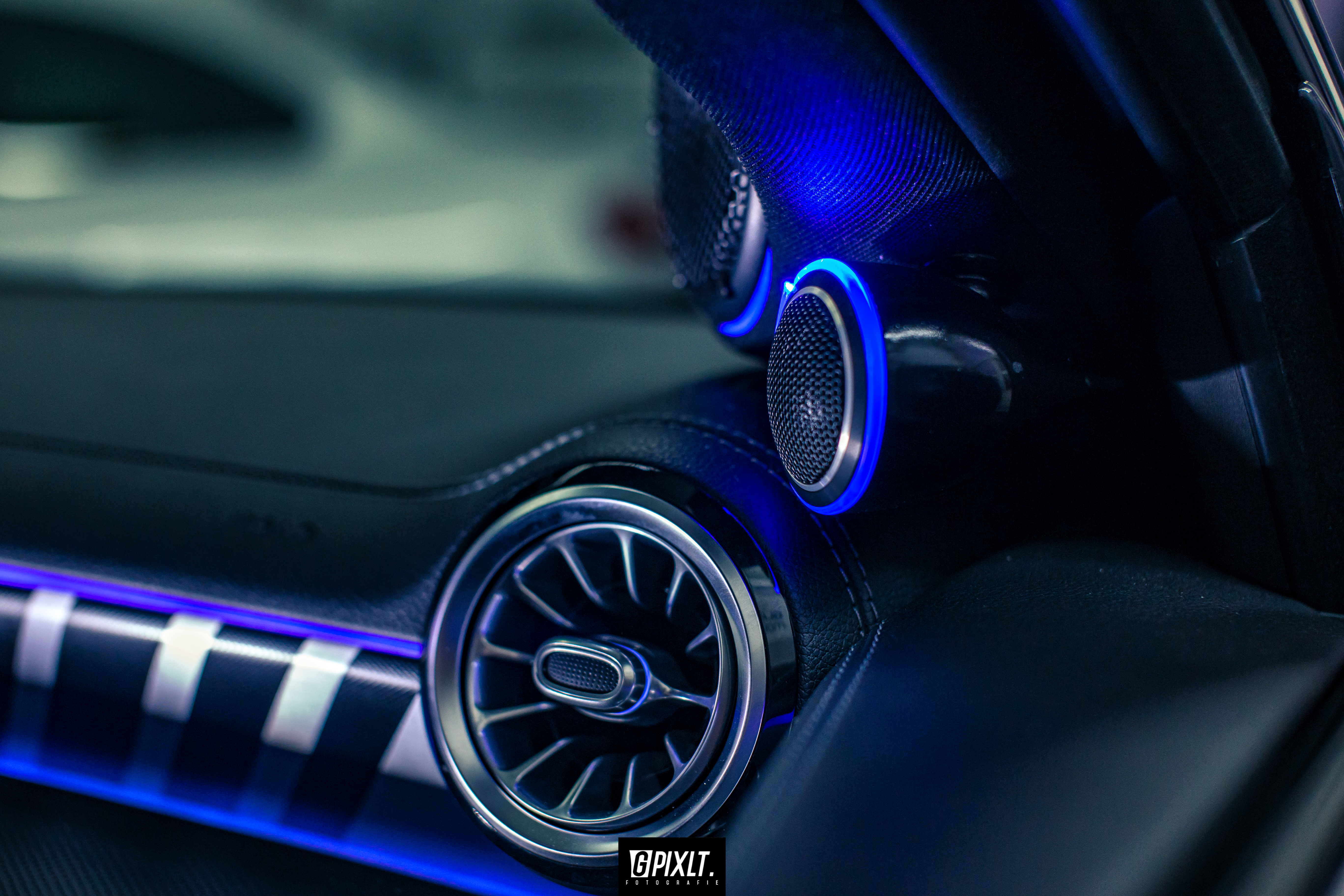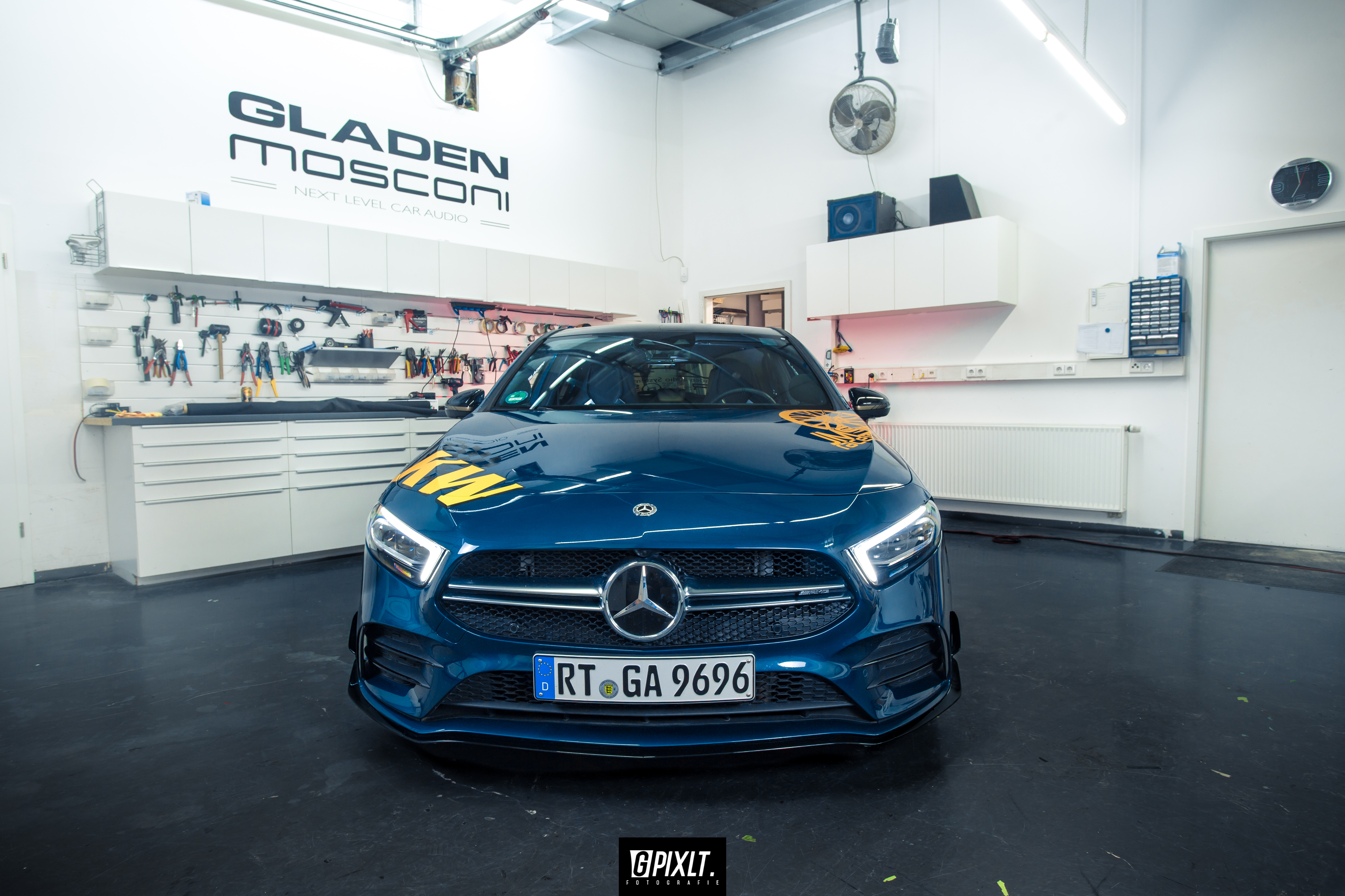 Für den Einbau der Soundanlage zeichneten die Spezialisten von Gladen verantwortlich: Das aktive Gladen Pro 165.3-Frontsystem wird von zwei Mosconi PRO 5|30-Verstärkern angetrieben, während im Heck ein aktives Gladen Pro 165.2-System in Verbindung mit einer Mosconi PRO 4|10-Endstufe arbeitet. Die Center-Lautsprecher und jene in der C-Säule blieben Mercedes-Originalteile, welche jetzt durch einen digitalen Mosconi Pico 4-Verstärker angetrieben werden. Abrundend gibt es im Heck drei 10 Zoll durchmessende Gladen Aerospace-Subwoofer, deren Antrieb wiederum drei Mosconi 1|10-Verstärfer übernehmen. Gesteuert wird die Anlage durch zwei digitale Mosconi Aerospace 8/12-Soundprozessoren. Abrundend ist ein Rear Seat-Entertainmentsystem mit zwei per Android gesteuerten Ampire-Monitore mit 4K-Auflösung und Einspeisung ins MBUX-System an Bord. Last but not least bekam der grau lackierte Mercedes auch seine gelb-schwarze Folierung bei Gladen.