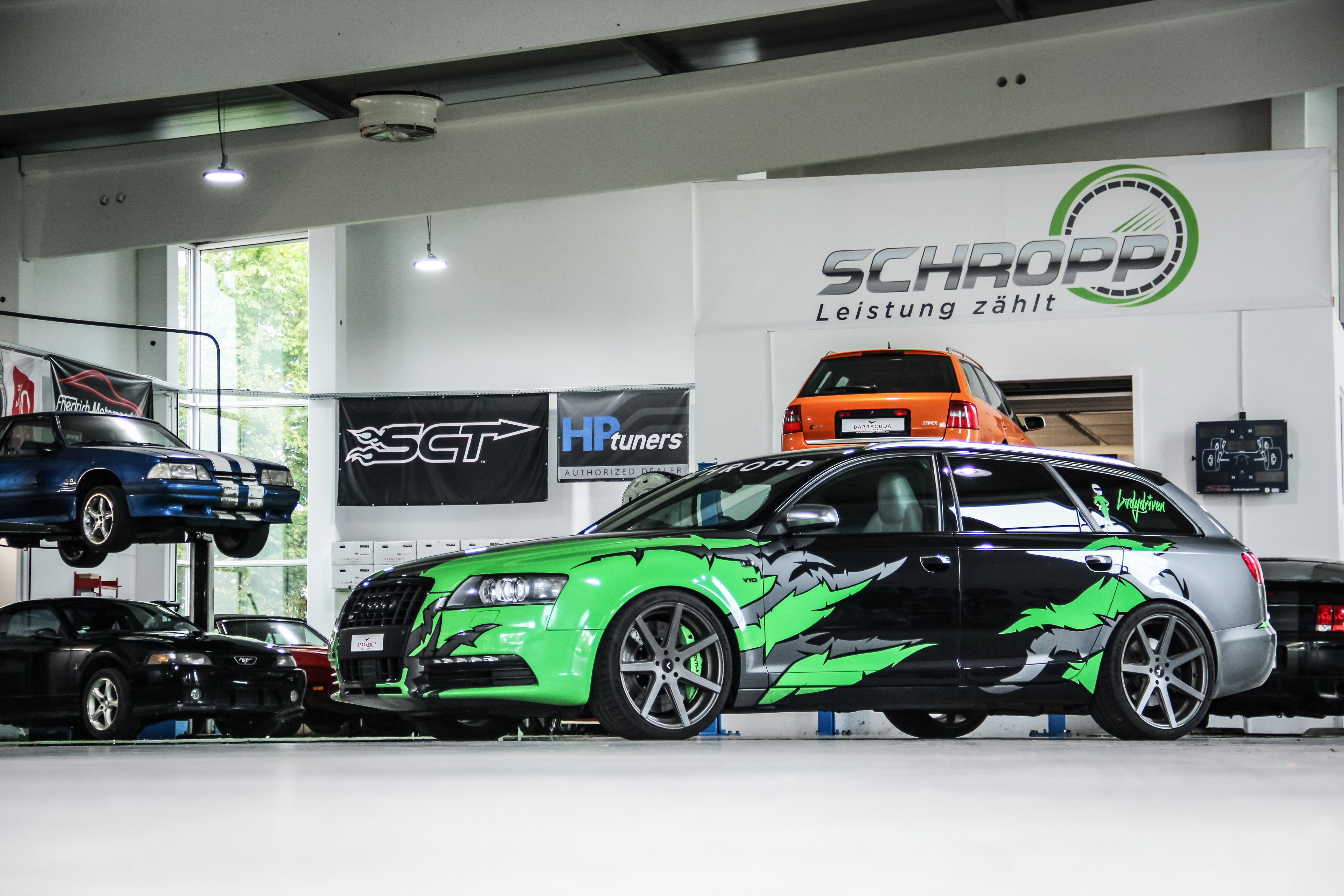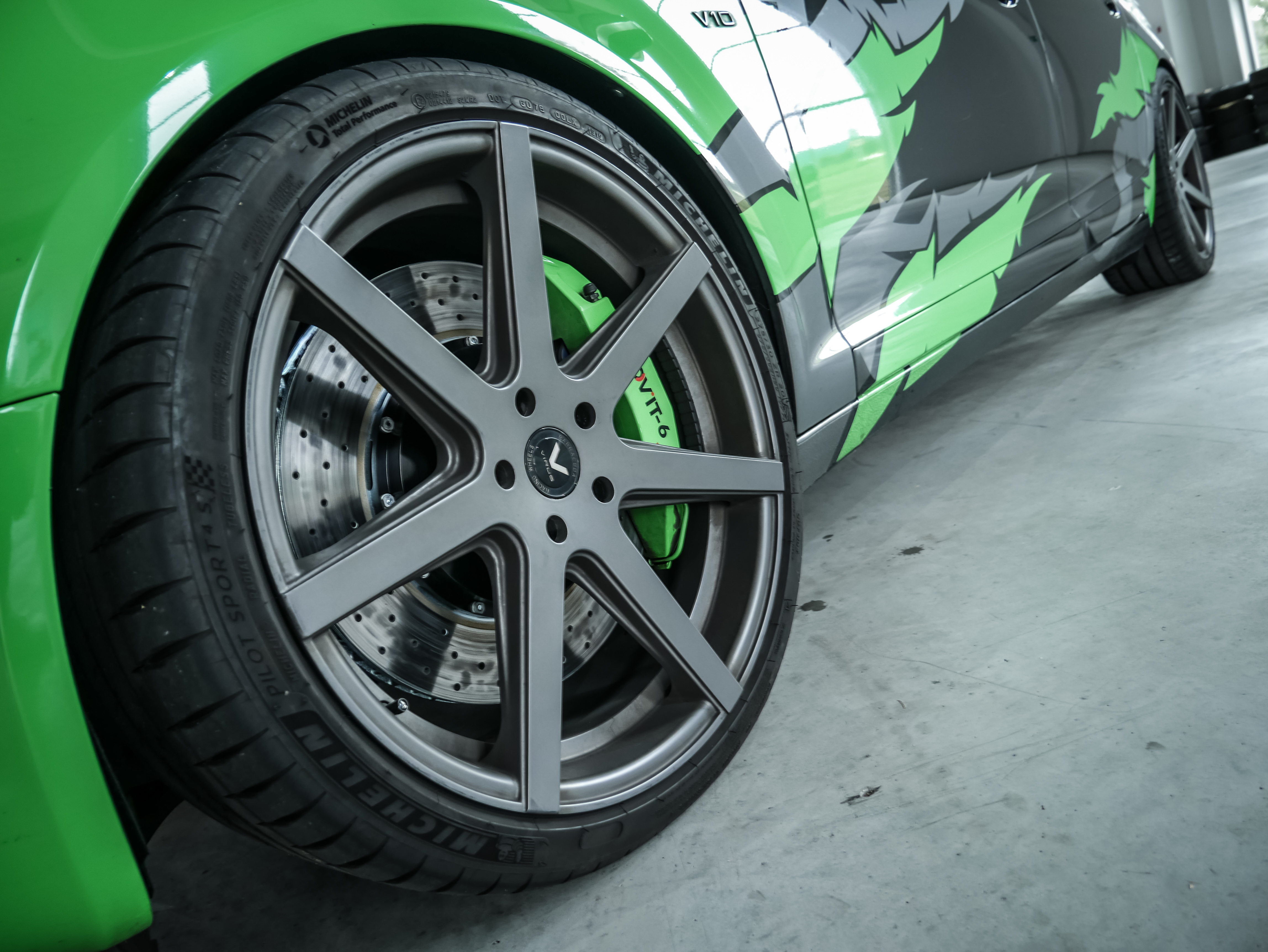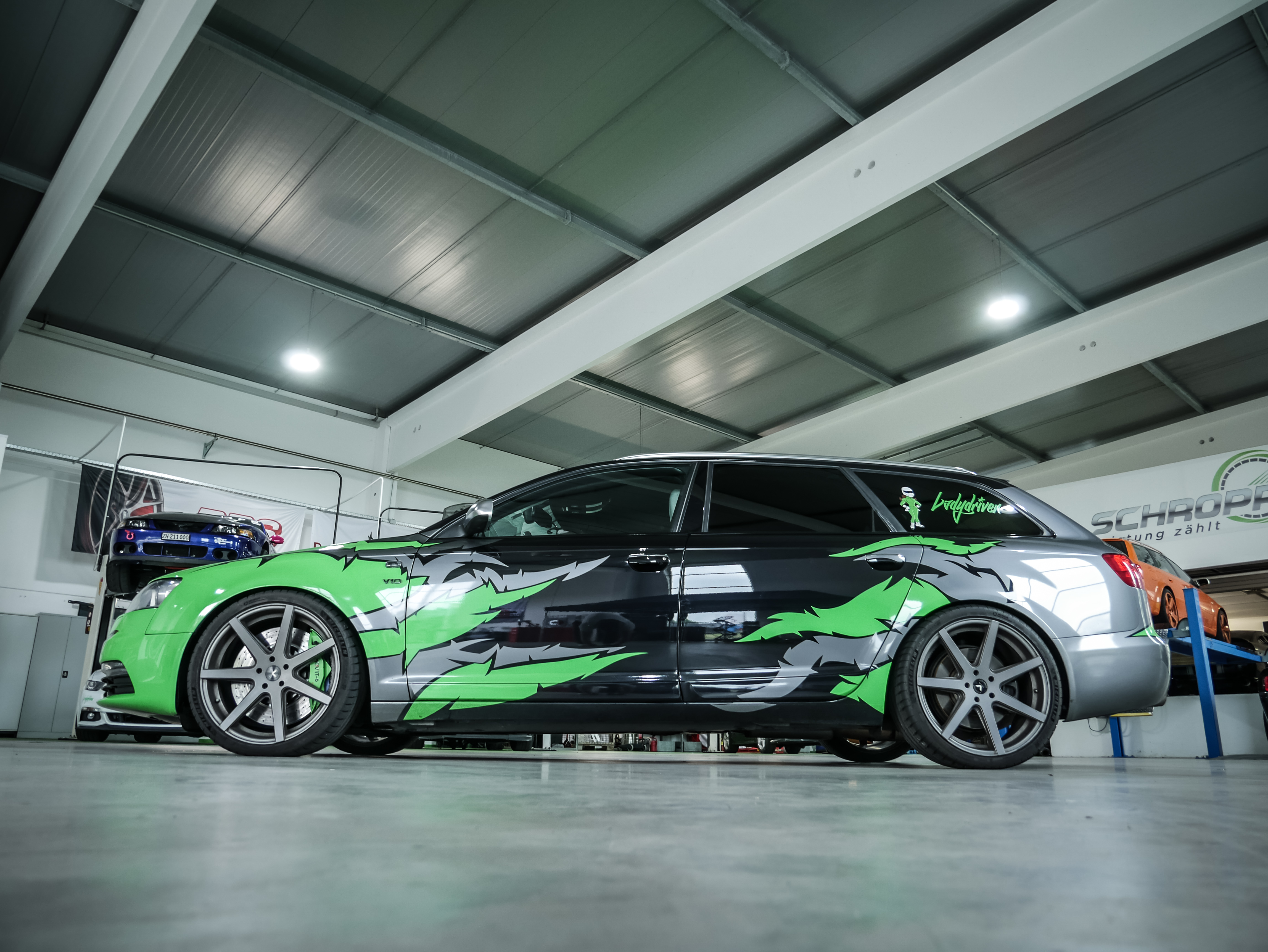 Der Wagen steht auf Barracuda Virus-Rädern 9x20 Zoll. Bezogen sind die im Finish Matt-Gunmetal lackierten Felgen mit Michelin Pilot Sport 4 S-Reifen in 275/30R20. Die passende Tieferlegung ermöglichte ein KW Variante 3-Gewindefahrwerk. An dessen Enden sorgt eine Mov'it-Anlage mit 396x36-mm-Scheiben und 6-Kolben-Sättel für hervorragende Bremswerte. Das ist auch durchaus sinnvoll, schließlich erhielt der S6 nicht nur eine Schropp-Abgasanlage, sondern zudem eine ebenfalls hauseigene Stage 1-Leistungssteigerung. Als weitere optische Anpassung bekam der Kombi bei TTStudio abrundend eine auffällige, mehrfarbige Designfolierung.