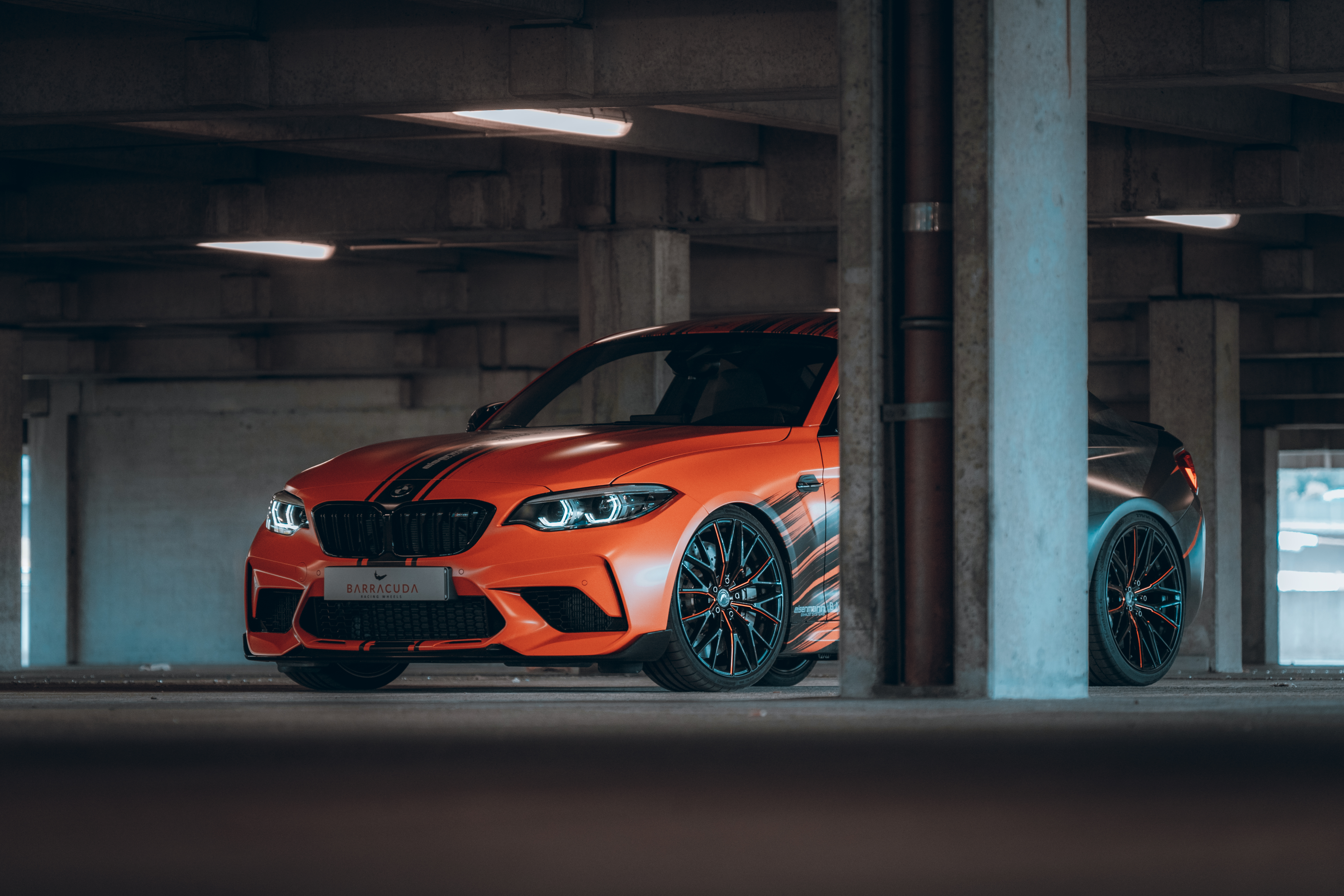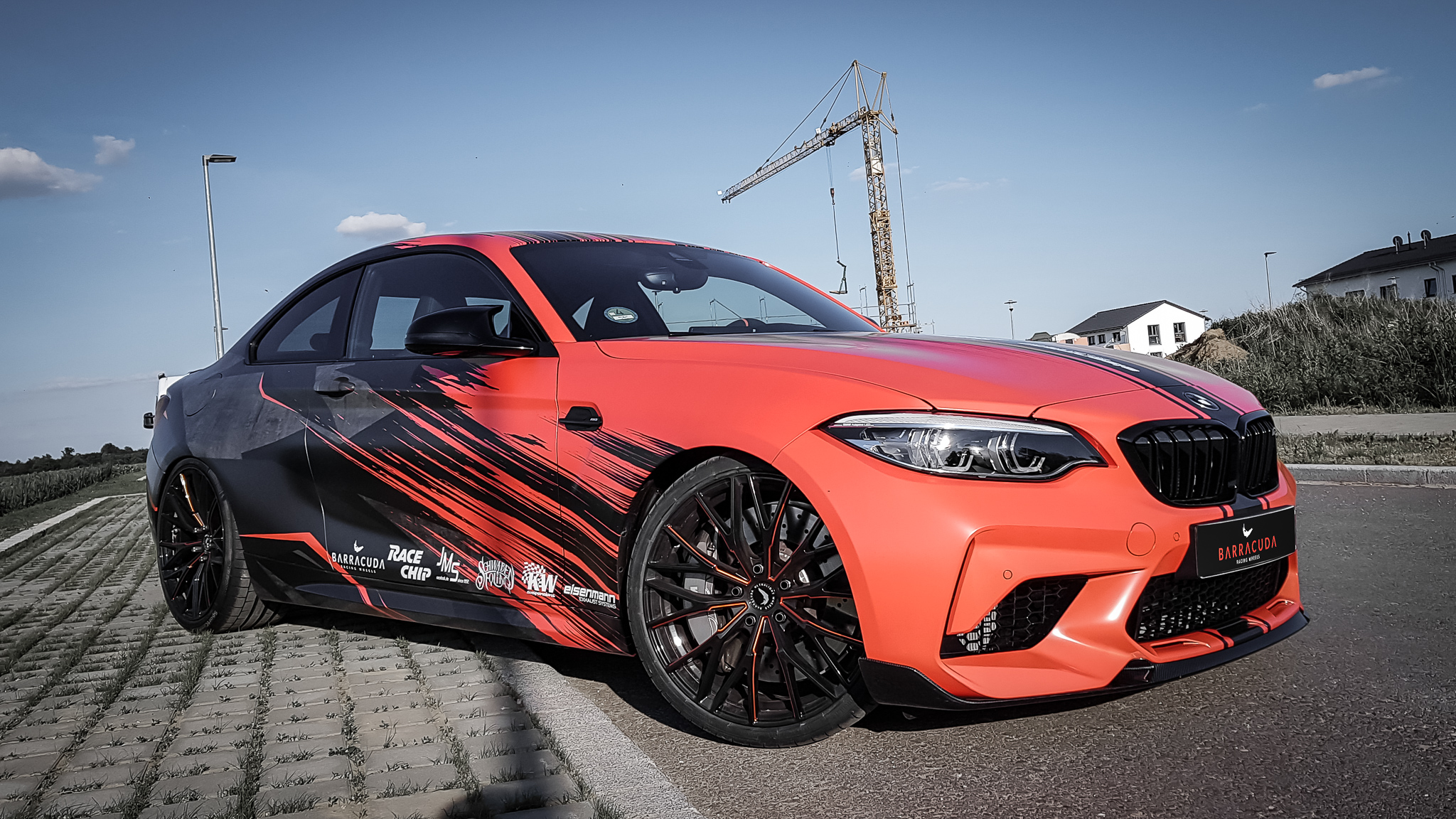 Zum absoluten Eyecatcher macht den kompakten Biturbo-Sportler zweifellos seine Digitaldruck-Designfolierung, welchen von den Spezialisten von Schwabenfolia in Bissingen/Teck aufgebracht wurde. Das sich aus Rotorange-Tönen und Schwarz zusammensetzende, seidenmatte Wrapping im Racing-Style verleiht den M2 bereits im Stand eine optische Dynamik.