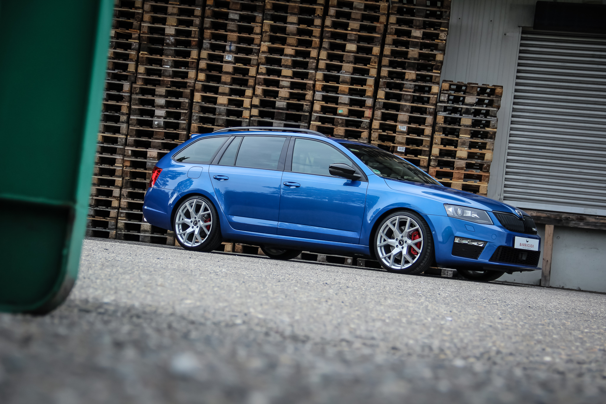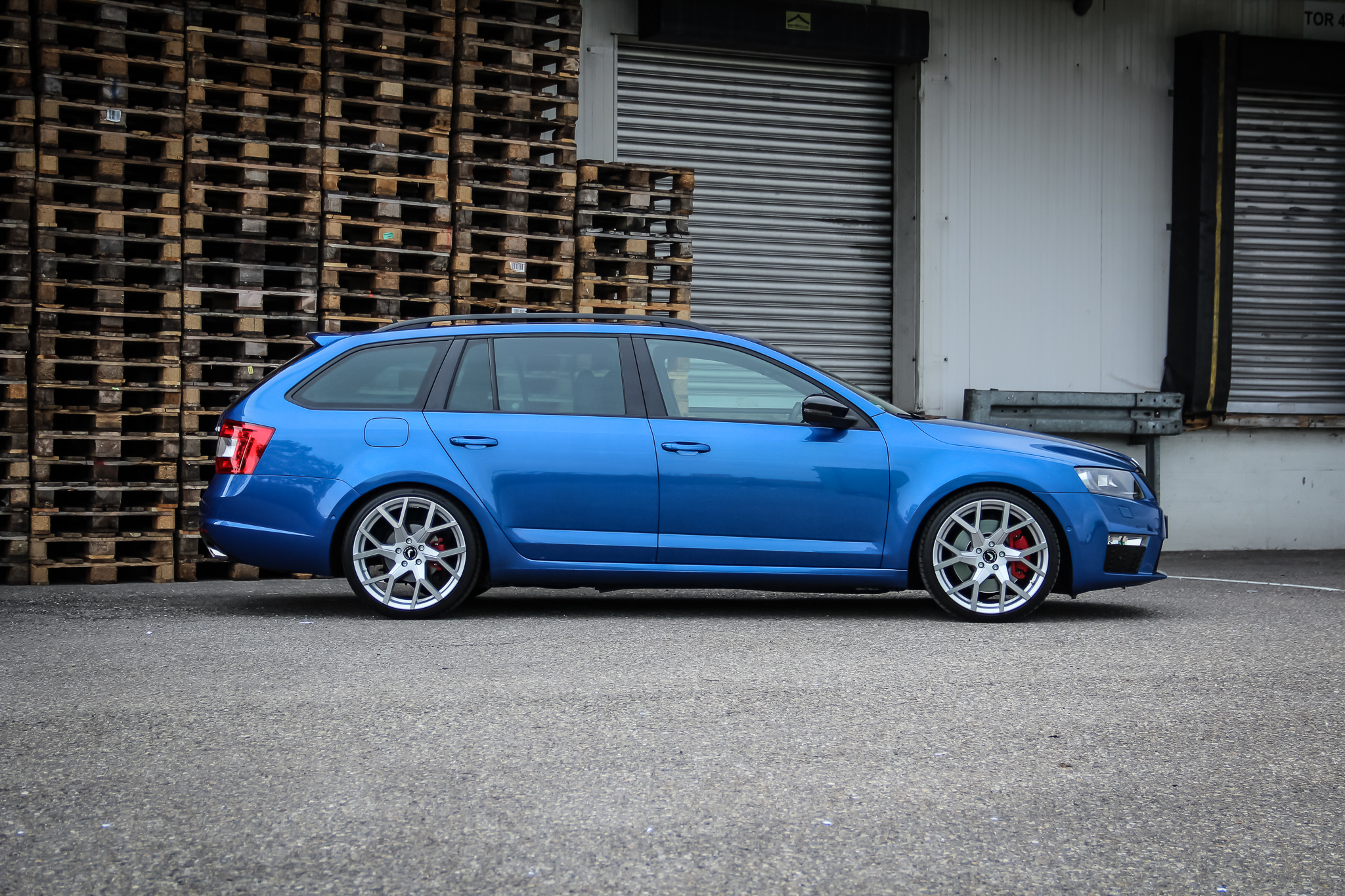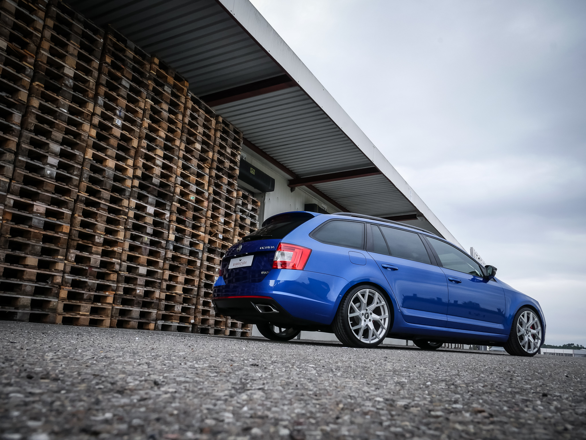 The trendy and successful Tzunamee EVO tuner wheels are mounted in 8.5x19 inches on the axles of the deep blue lacquered Czech in the popular station wagon version. The asymmetrically drawn Y-spoke wheels have a concavity of around six centimeters in this dimension and have the Silver Brushed finish. The mounted Hankook tires measure 225/35R19.