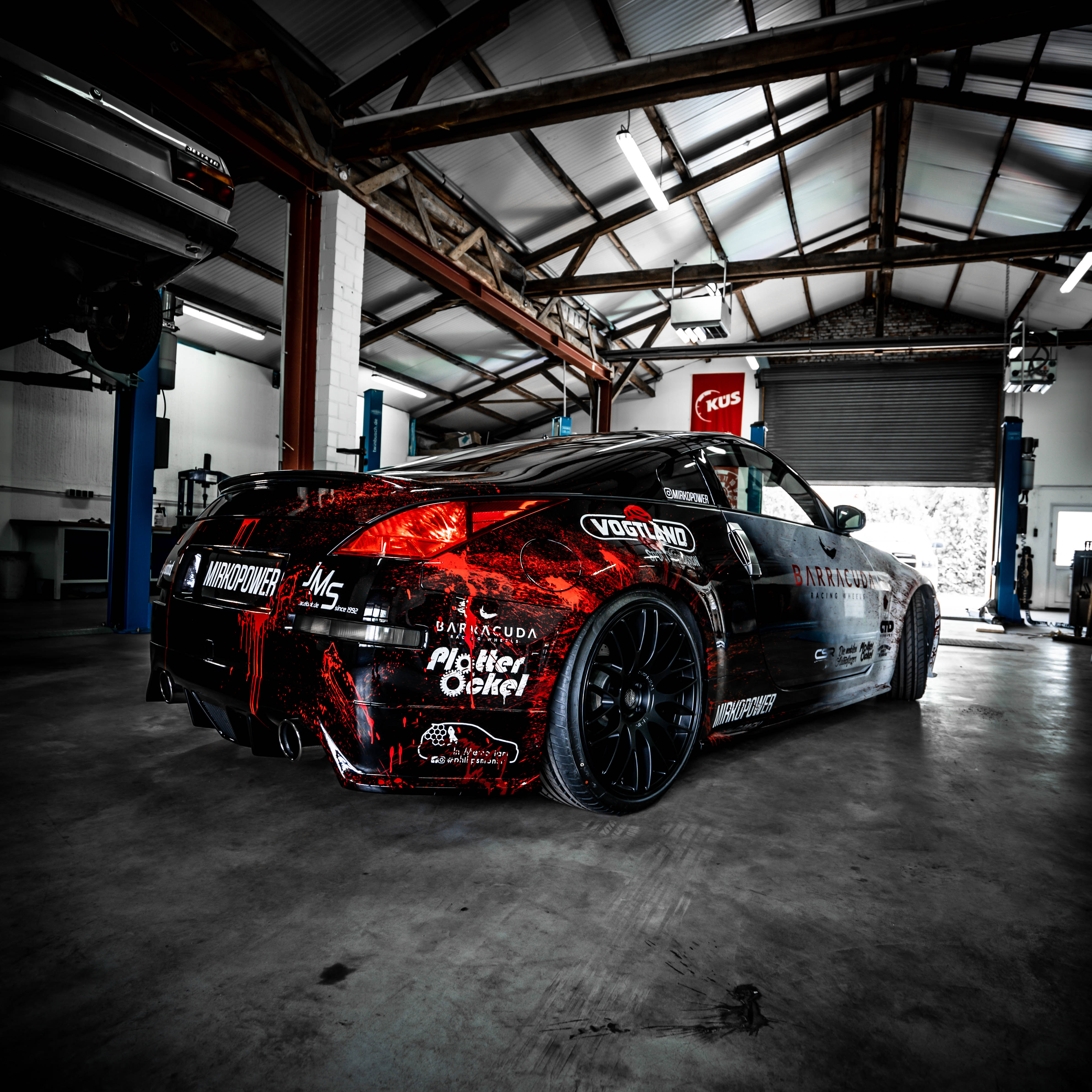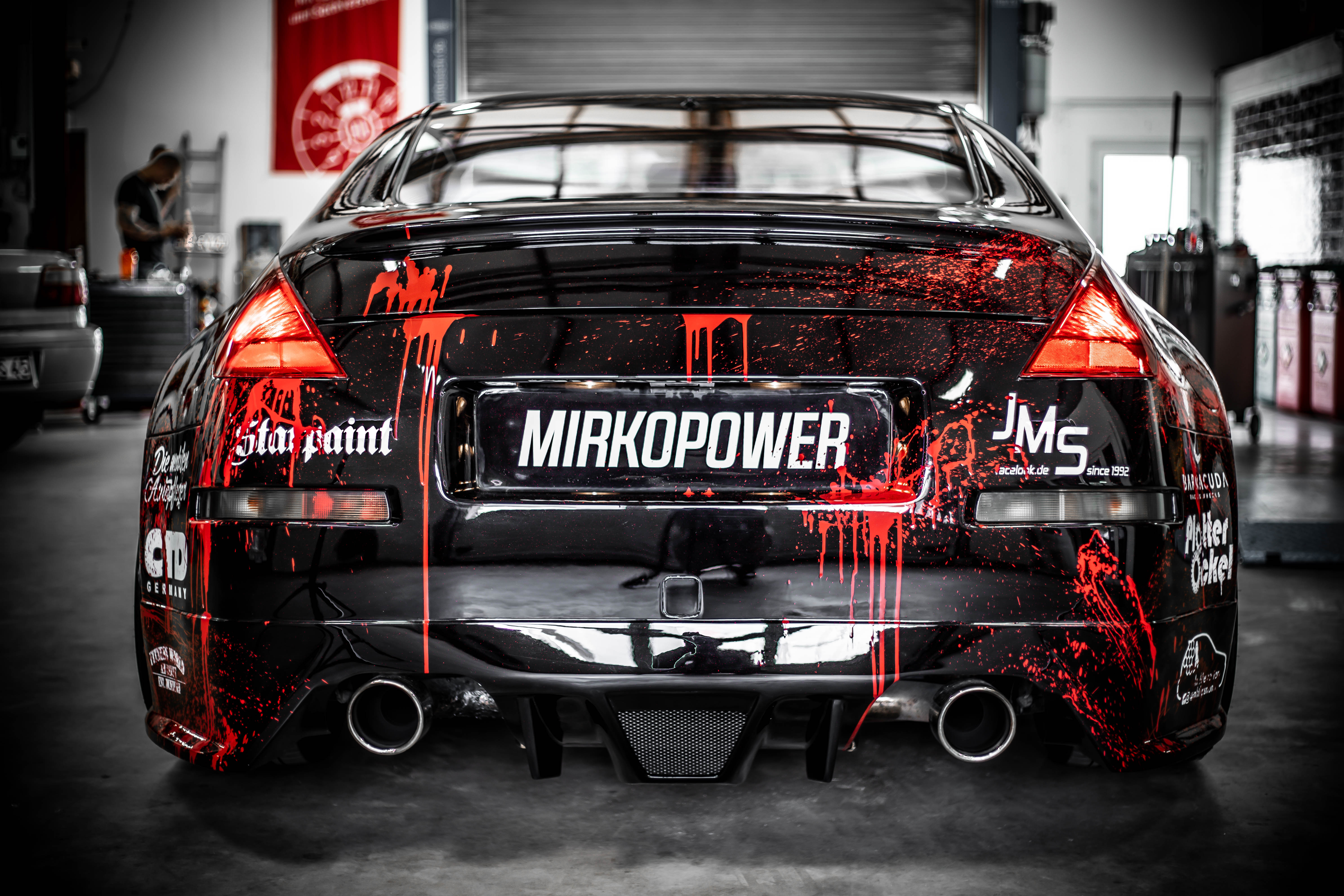 Together with other partners, the owner of the coupé, who is represented on Instagram under the name “Mirkopower”, made numerous other modifications to the car: the lowering by about 30 millimeters is thanks to Vogtland springs, the robust engine sound is made by an Invidia Gemini exhaust system. The absolute highlight, however, is the multicolored design of the body in black and white, realized by Philipsmonster e.V., with red flakes from Starpaint.eu as well as various sponsor lettering and red accents in the blood splatter look. This is actually painted and not foiled! The car also has a CSR automotive body kit and red underbody lighting. "Die mobilen Autopfleger", CTD Germany and PlotterOckel act as additional partners. The attached pictures were made by cinoartworks and thomas_hayen_photography.