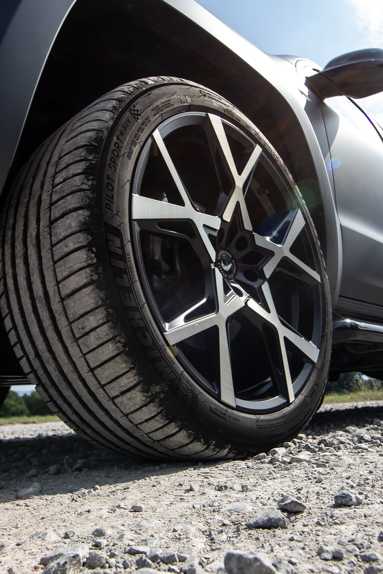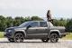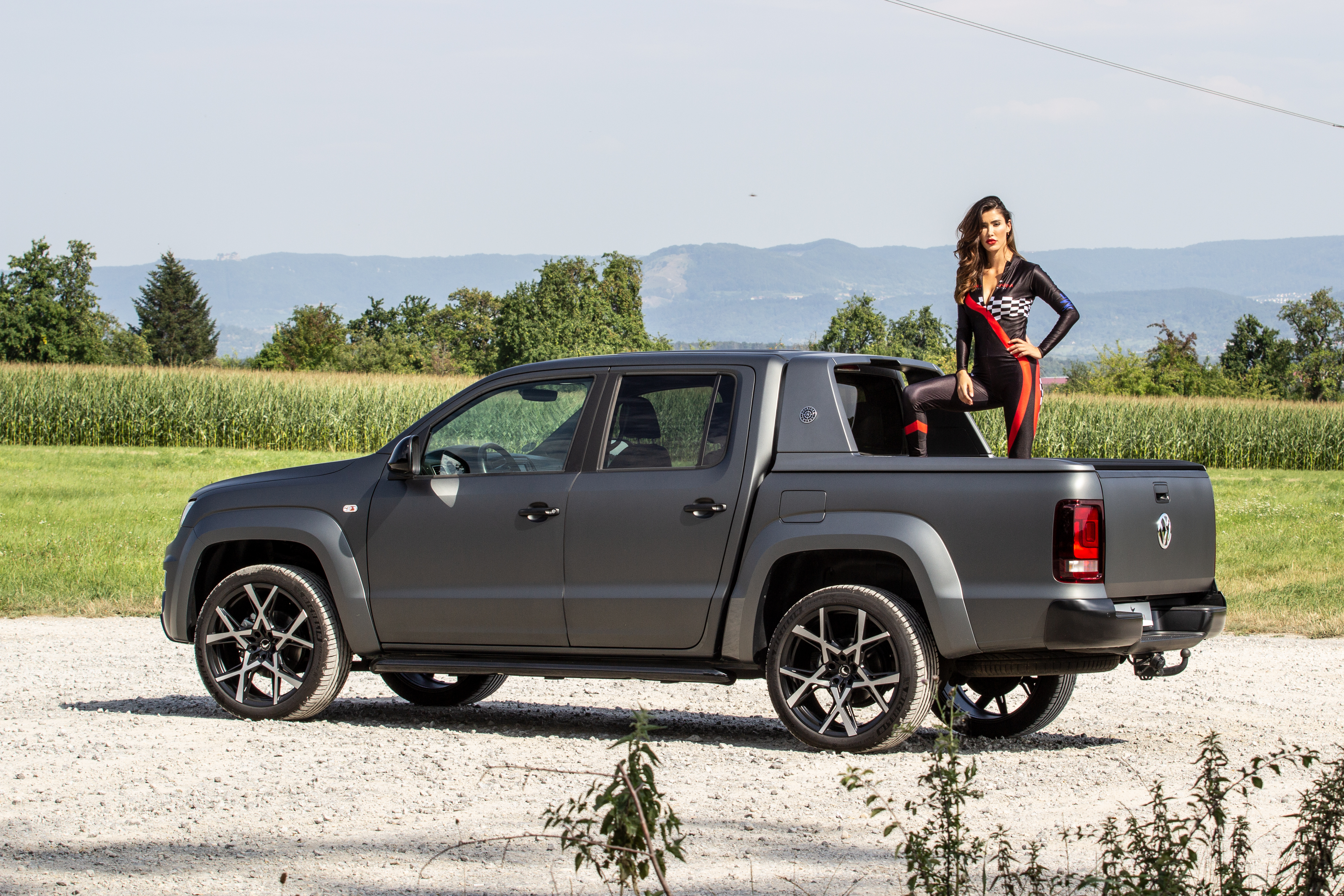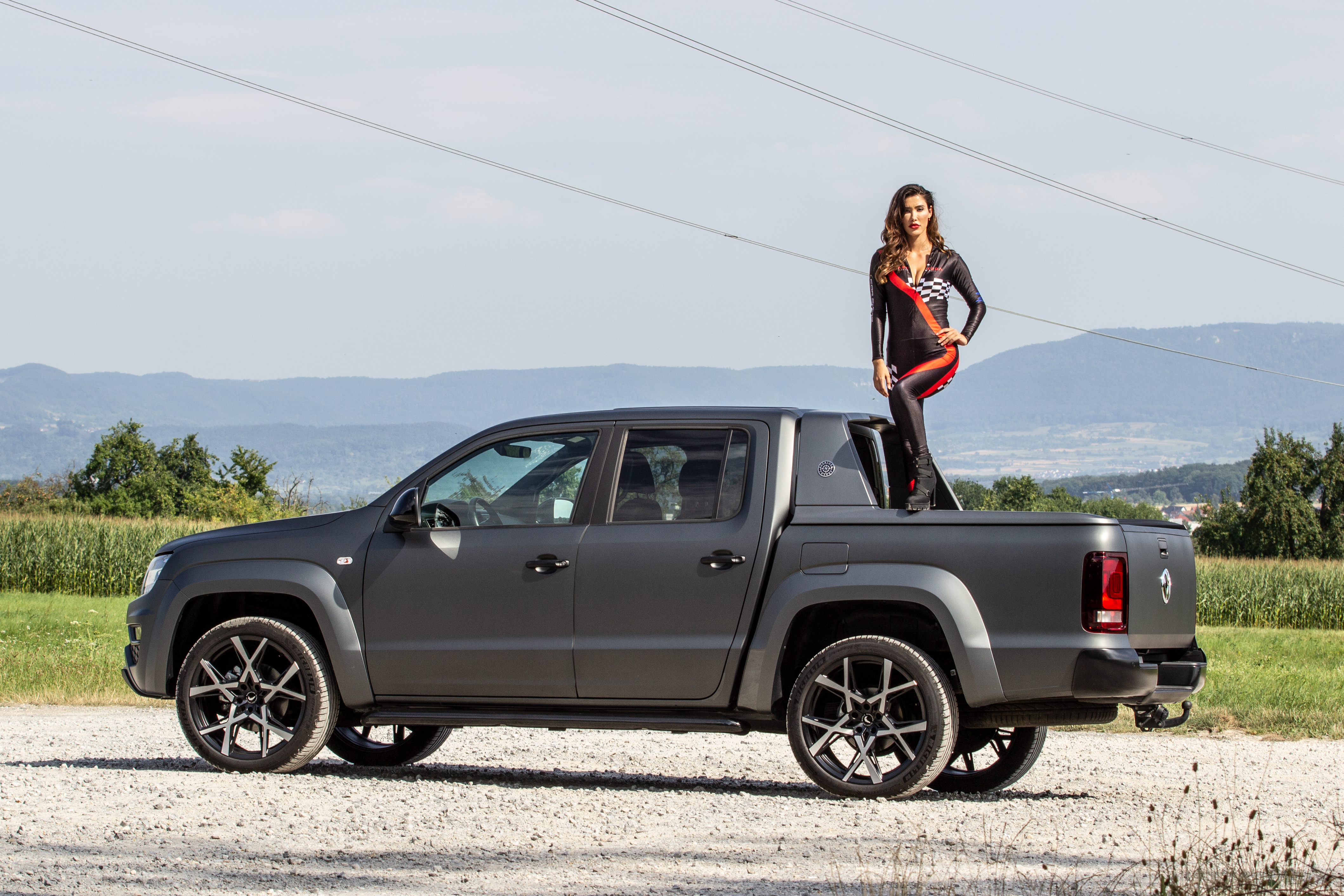 Project X light alloy rims from the Barracuda Ultralight Series were screwed onto the axles of the Wolfsburg pick-up, staged in the pictures together with model and Barracuda brand ambassador Sabrina Doberstein. Thanks to their production using the modern flow forming process, they are relatively lightweight despite their lush dimensions of 10x22 inches: They only weigh 16.3 kilograms each. The mounted Michelin tires measure 275 / 40R22. With their black finish including brushed areas on their unusual X-spokes, the wheels optically match the paintwork of the body in the VW special color indium gray matt.