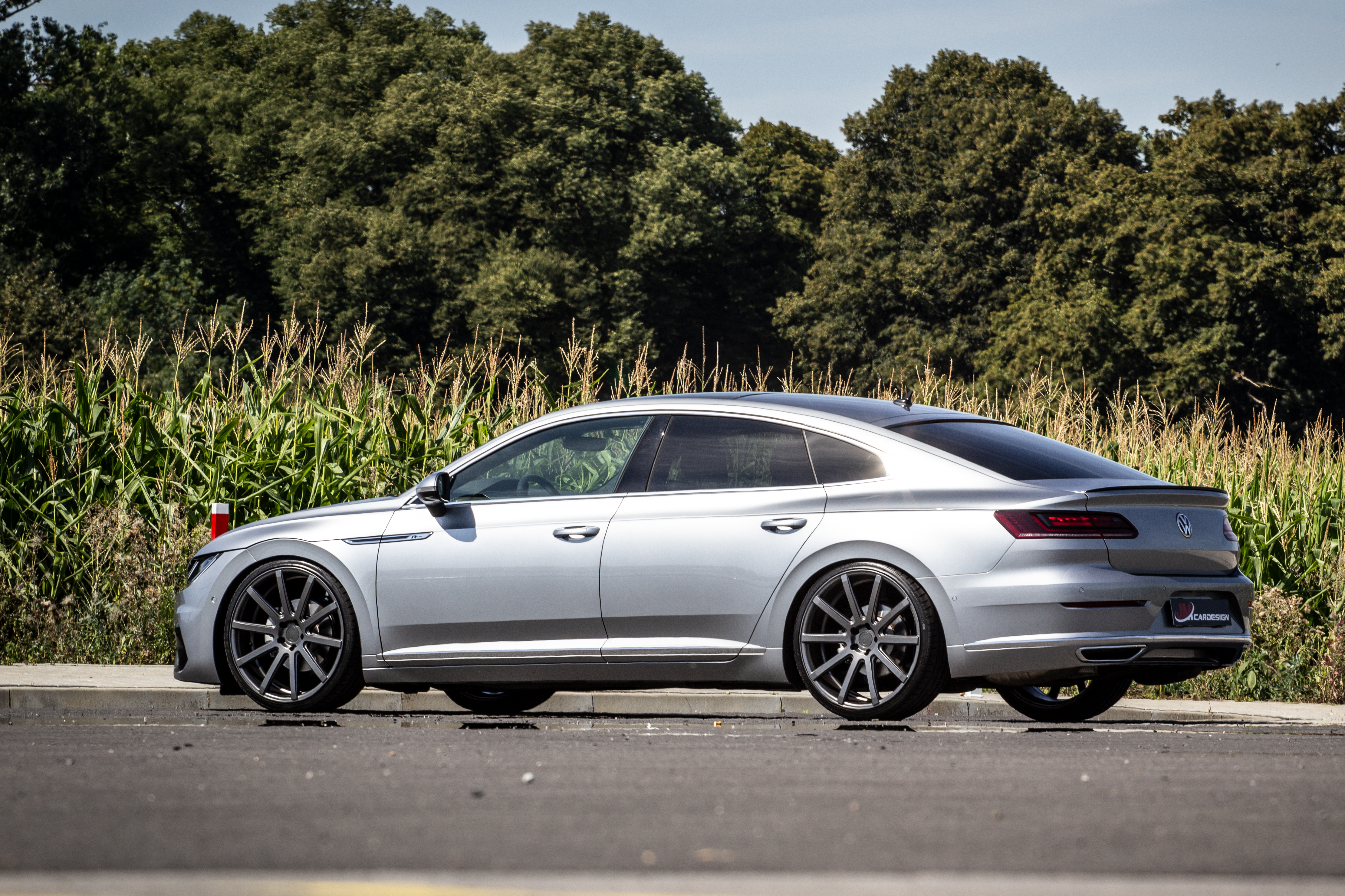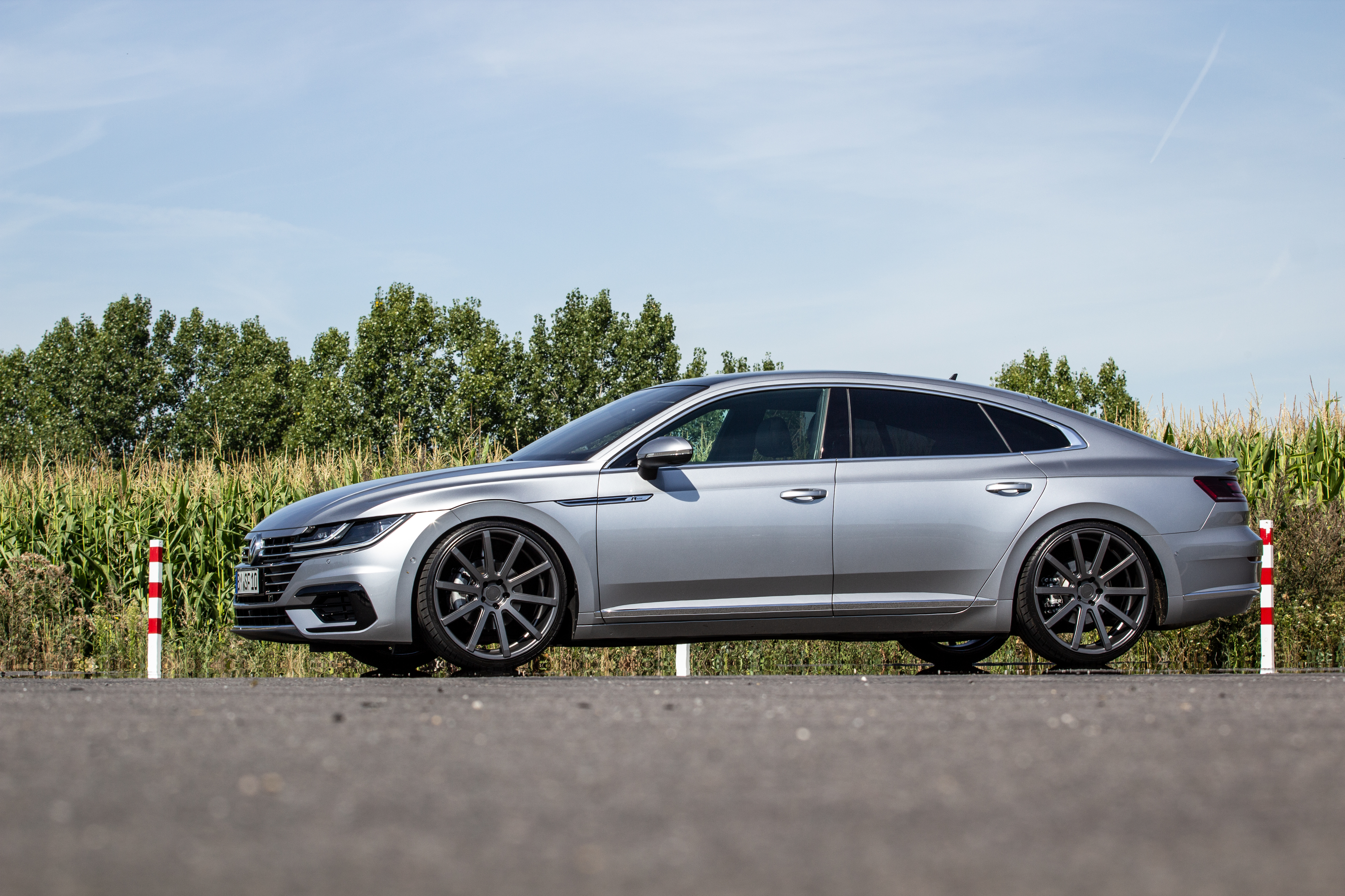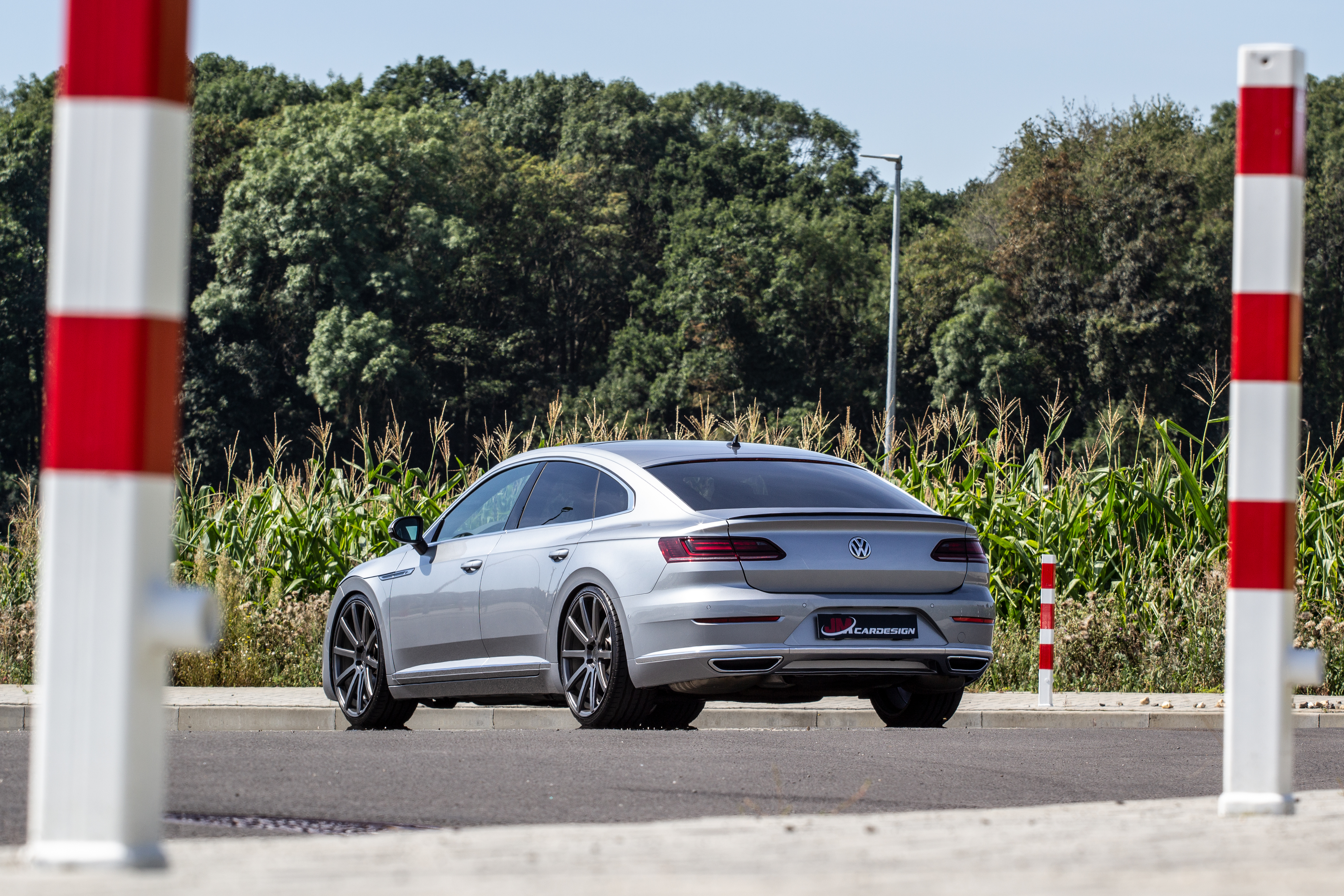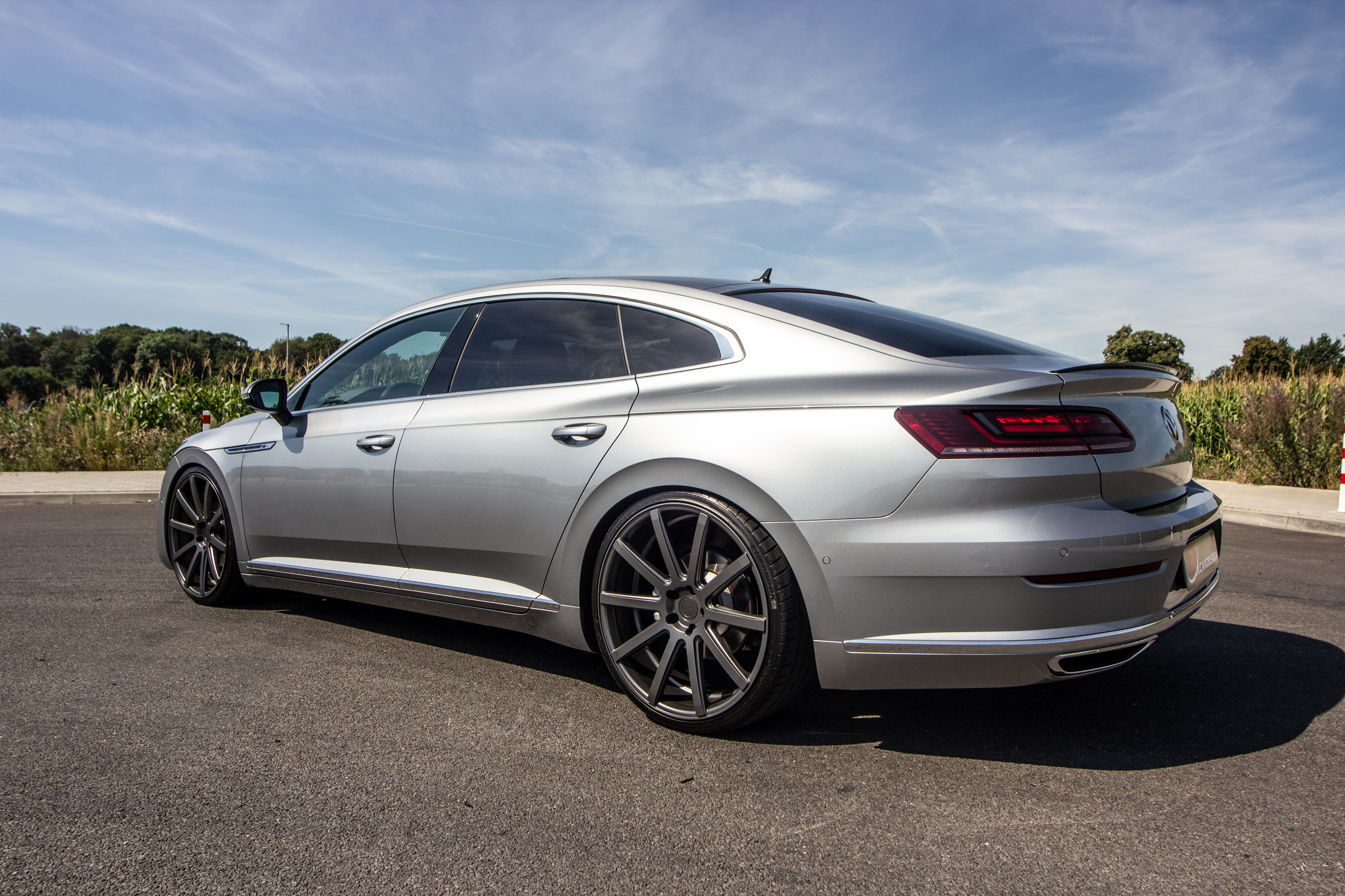 Ein Exemplar des viertürigen Coupés wurde nun mit einem Satz hochwertiger Räder aus dem Hause Cor.Speed Sports Wheels ausgerüstet. Verantwortlich für den Umbau waren dabei die Spezialisten von JM Car Design aus dem bei Köln gelegenen Bergheim, die als Cor.Speed-Stützpunkt fungieren. Die Wahl fiel auf die kraftvoll gezeichneten DeVille-Felgen in den Dimensionen 9x21 Zoll, welche mit 225/30er Reifen bezogen sind. Mit ihrem Finish in Gunmetal Matt passen sie optisch perfekt zu der silbergrauen Lackierung des VWs. Die Montage des Räder konnte ohne Anpassungsarbeiten an der Karosserie erfolgen – trotz des ergänzend verbauten KW Variante 3-Gewindefahrwerks, das eine Tieferlegung um vorne 45 sowie hinten 40 Millimeter bewirkt und somit für einen noch stimmigeren Auftritt sorgt.