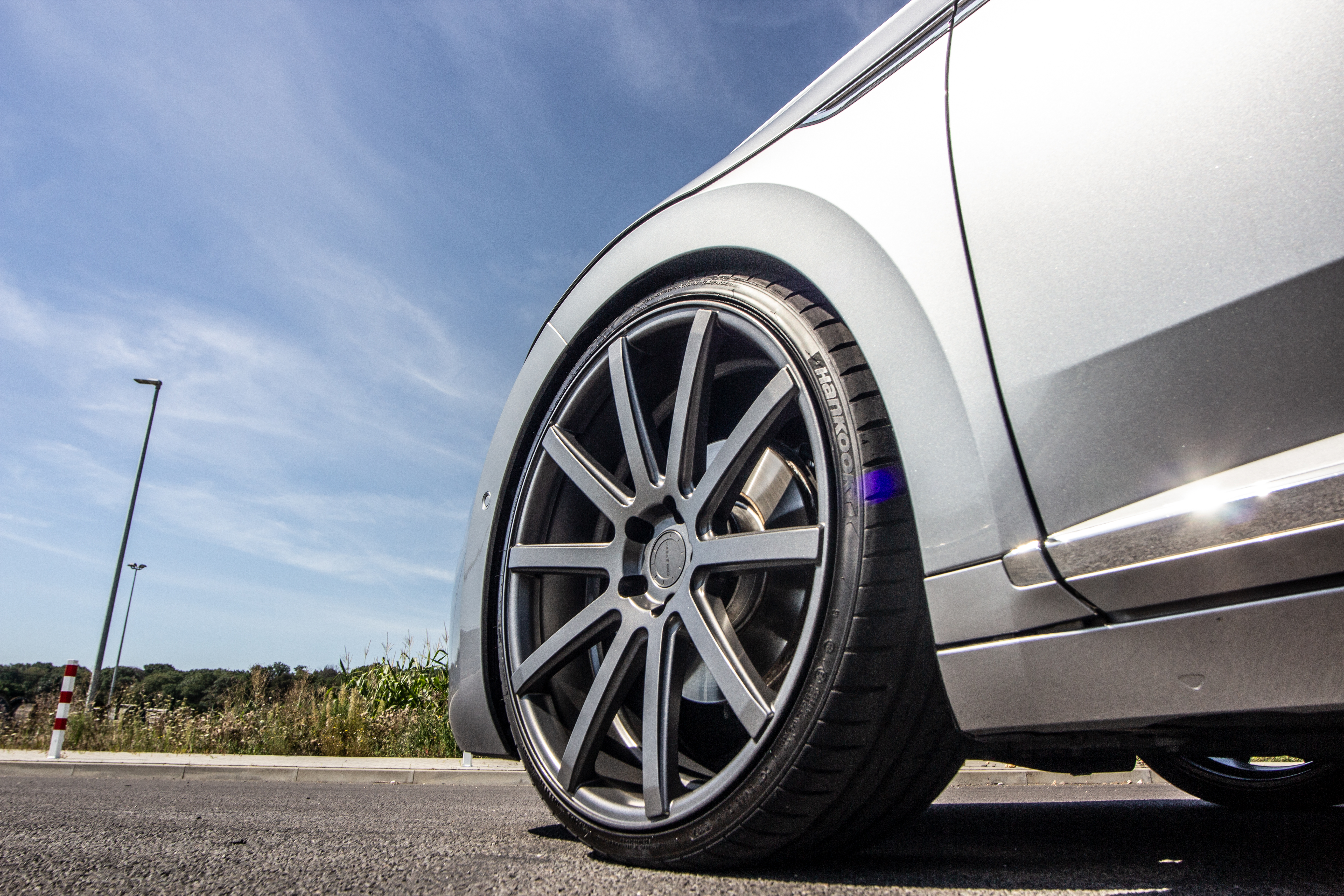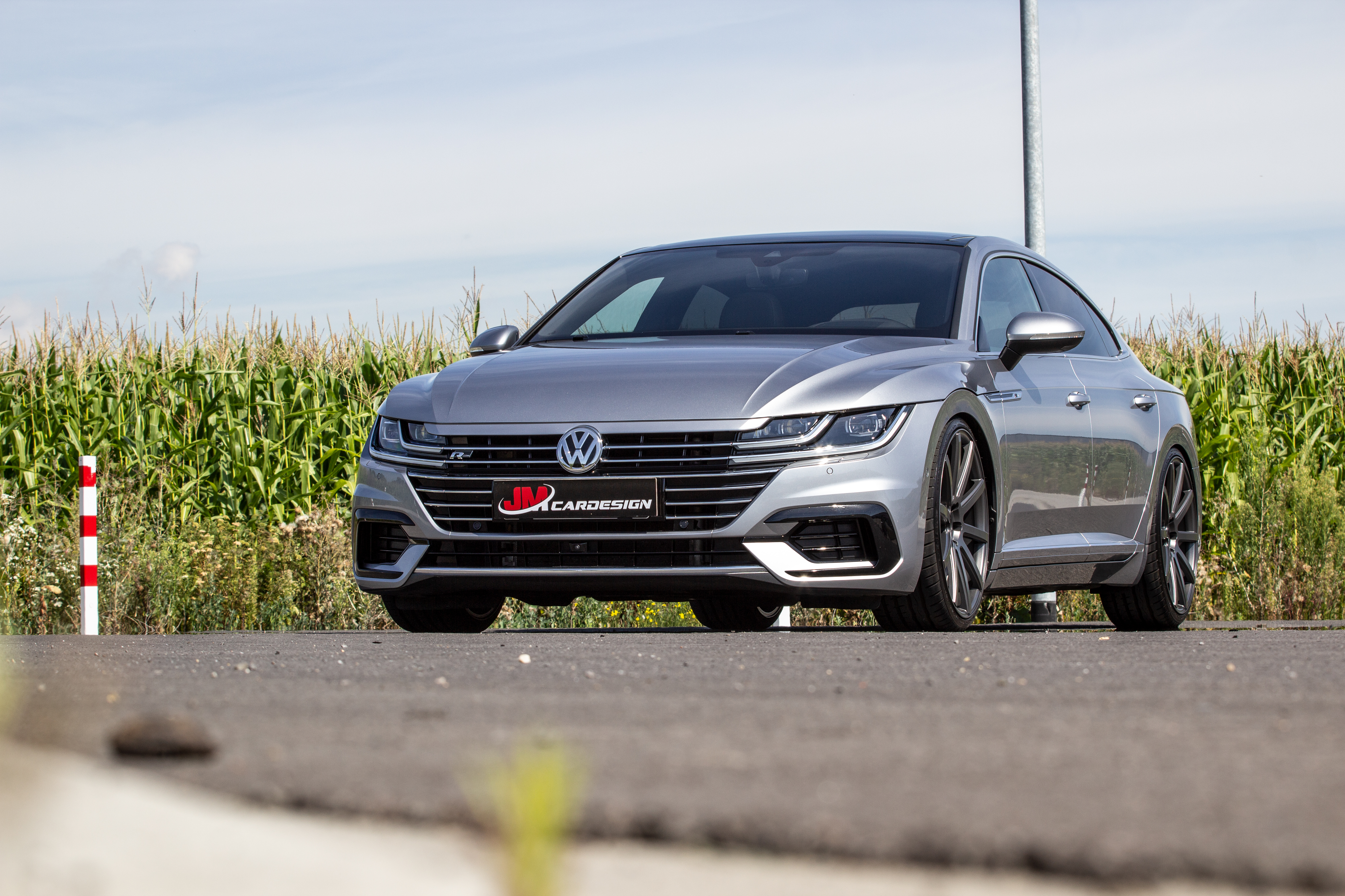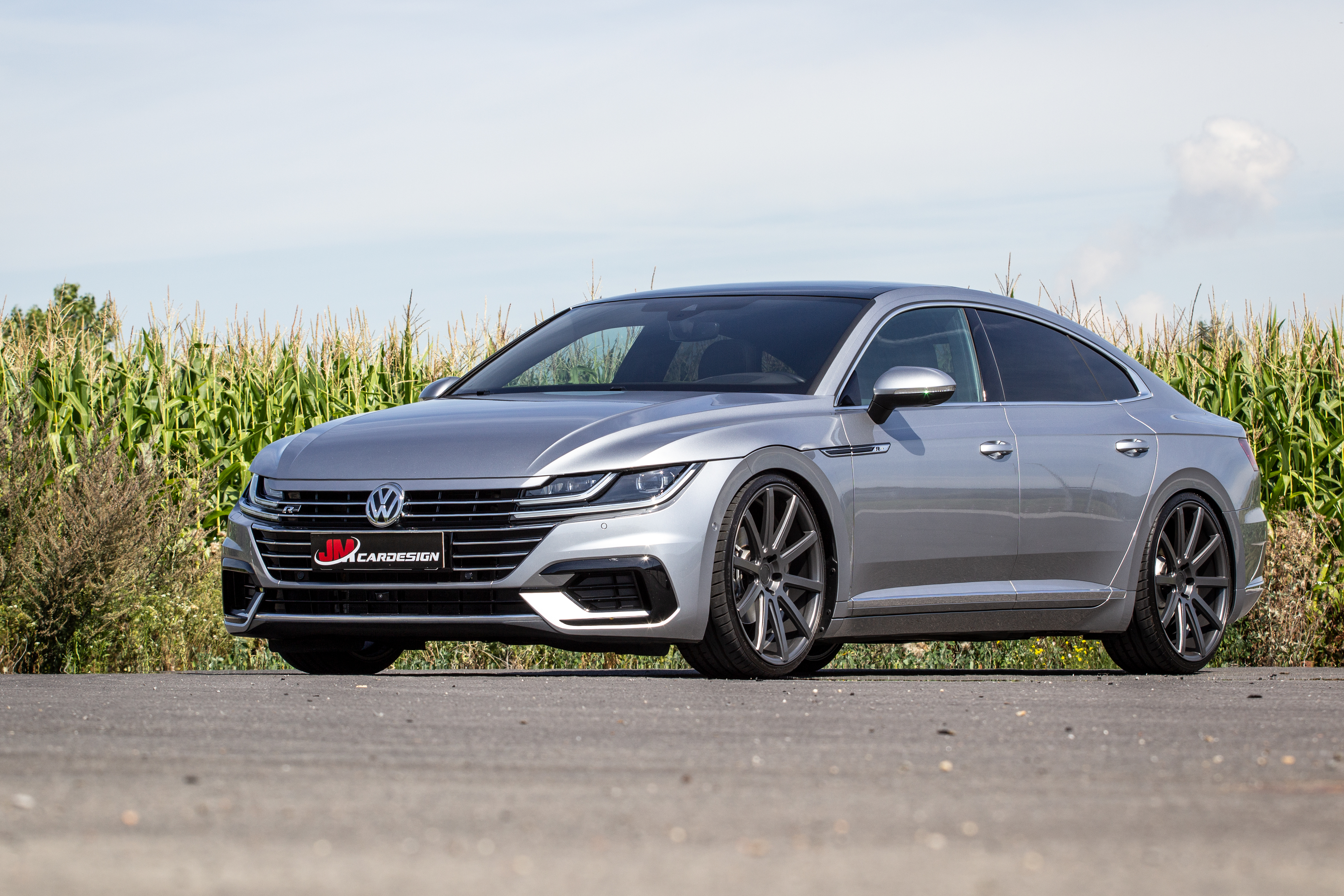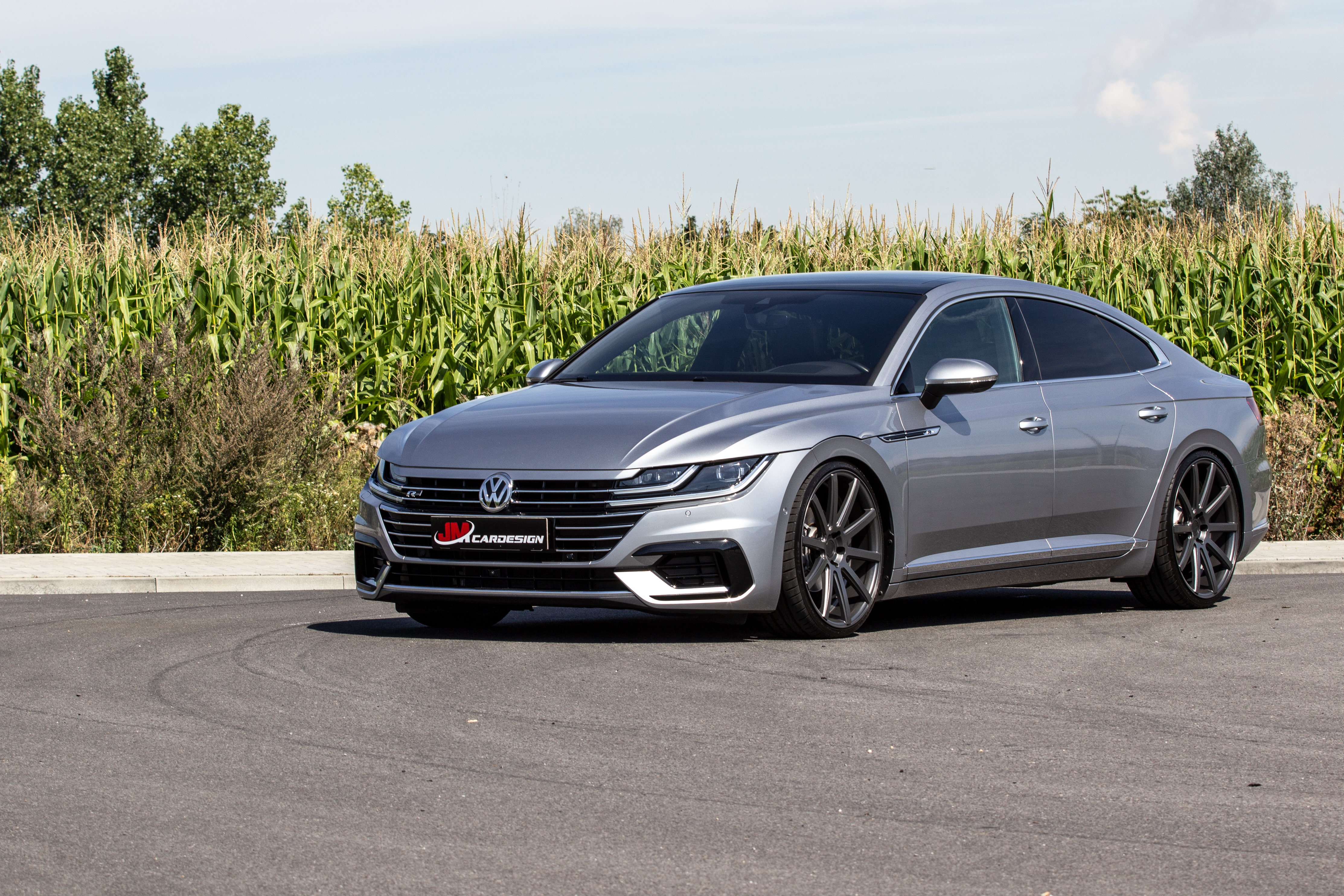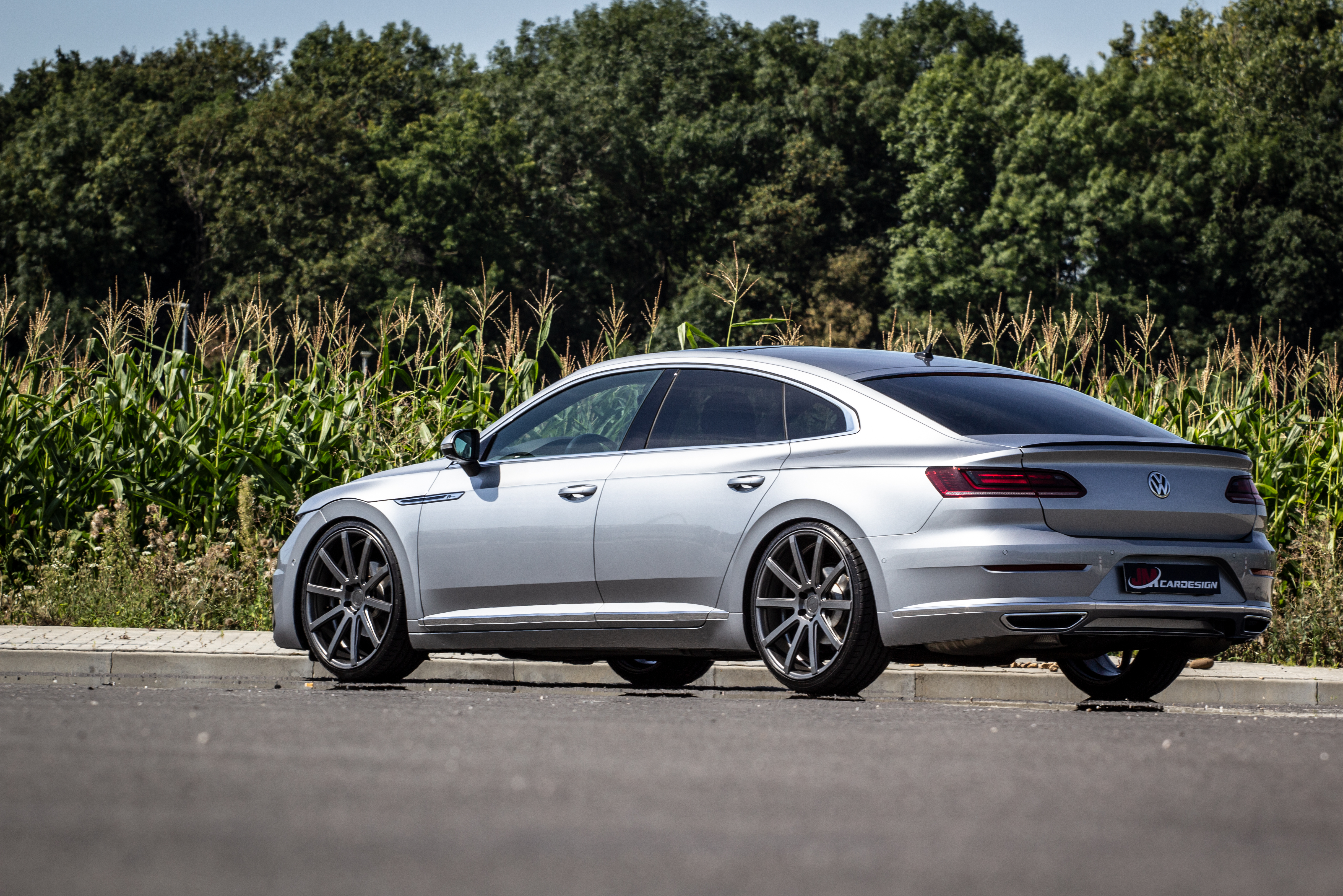 Ein Exemplar des viertürigen Coupés wurde nun mit einem Satz hochwertiger Räder aus dem Hause Cor.Speed Sports Wheels ausgerüstet. Verantwortlich für den Umbau waren dabei die Spezialisten von JM Car Design aus dem bei Köln gelegenen Bergheim, die als Cor.Speed-Stützpunkt fungieren. Die Wahl fiel auf die kraftvoll gezeichneten DeVille-Felgen in den Dimensionen 9x21 Zoll, welche mit 225/30er Reifen bezogen sind. Mit ihrem Finish in Gunmetal Matt passen sie optisch perfekt zu der silbergrauen Lackierung des VWs. Die Montage des Räder konnte ohne Anpassungsarbeiten an der Karosserie erfolgen – trotz des ergänzend verbauten KW Variante 3-Gewindefahrwerks, das eine Tieferlegung um vorne 45 sowie hinten 40 Millimeter bewirkt und somit für einen noch stimmigeren Auftritt sorgt.
