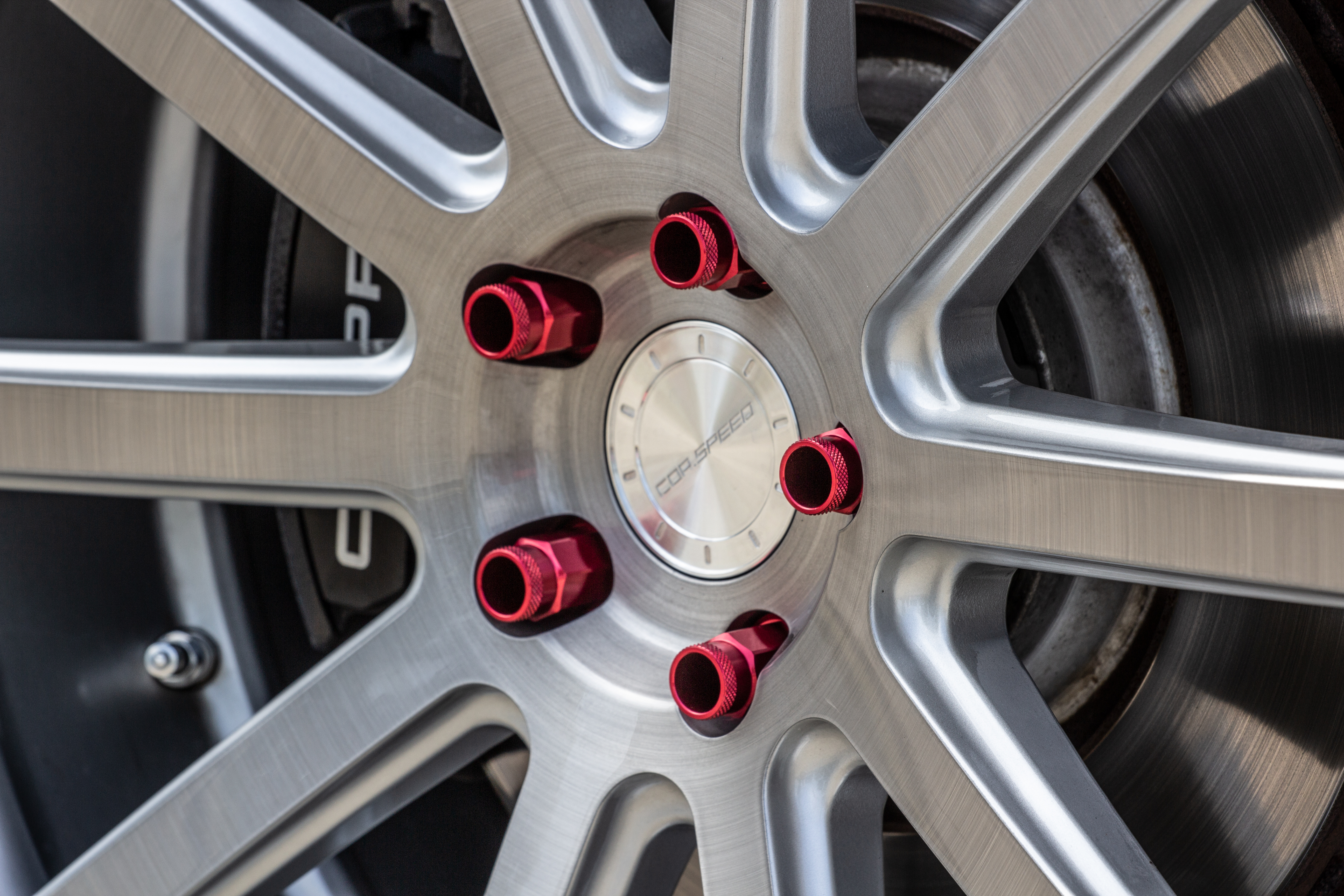 Die recht großen Radkästen bieten problemlos Platz für die sich durch zehn kraftvoll gezeichnete Speichen auszeichnenden DeVille-Leichtmetallfelgen in den üppigen Dimensionen 9x21 Zoll. Hinsichtlich des Finishs fiel die Wahl auf das klassische Silver Brushed, die aufgezogenen Bereifungen messen 245/30R21. Ferner kommen die mittlerweile bestens bewährten Racing Bolts der Cor.Speed-Schwestermarke Barracuda Racing Wheels zum Einsatz. Sie setzen gekonnt farbige Akzente, schließlich sind sie hier in Rot und Bronze ausgeführt. Die ergänzende Tieferlegung des Cupras, der auf den Bildern teilweise von der Cor.Speed-Botschafterin Sabrina Doberstein gekonnt in Szene gesetzt wird, wurde zu guter Letzt mit Hilfe von KW-Gewindefedern herbeigeführt.