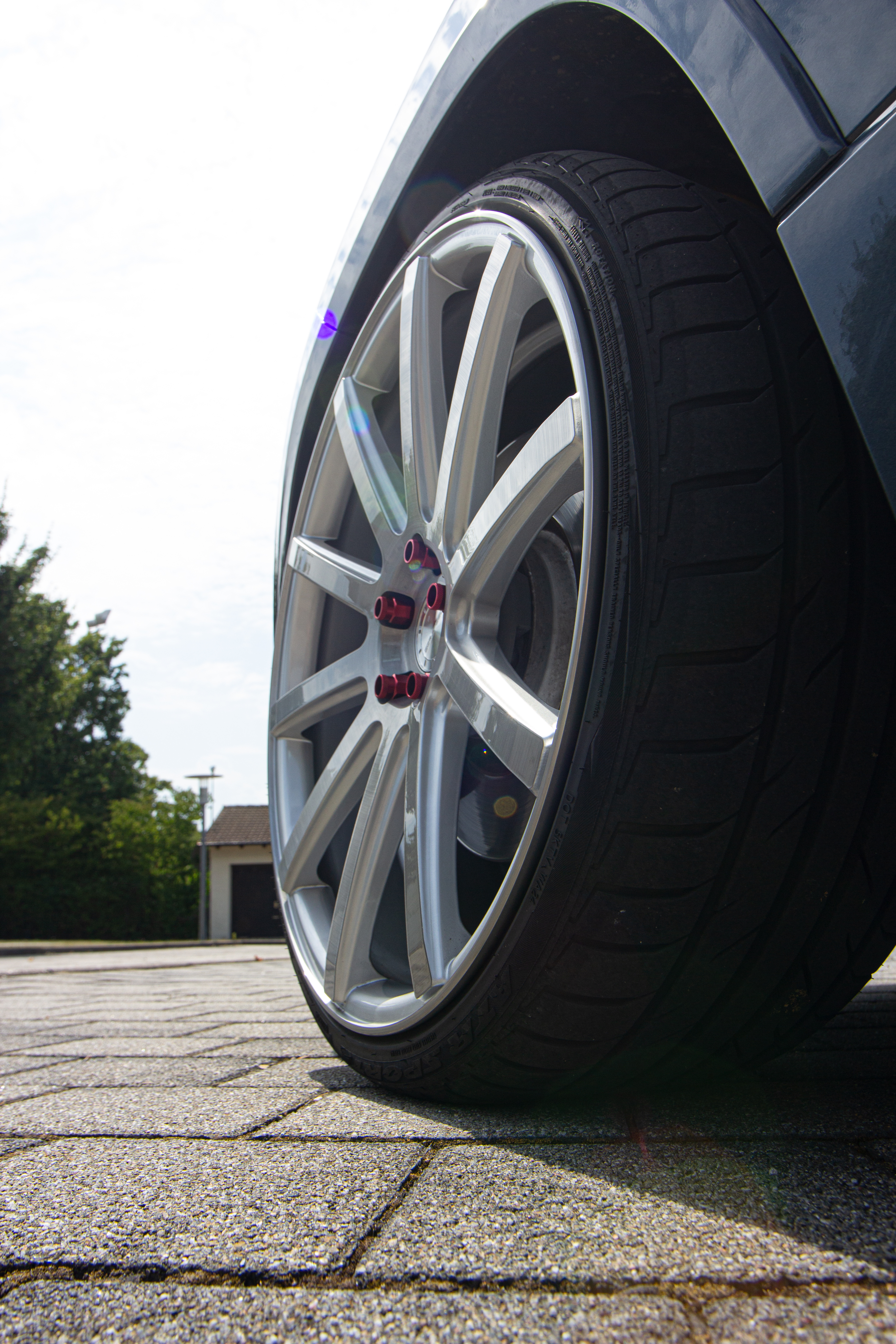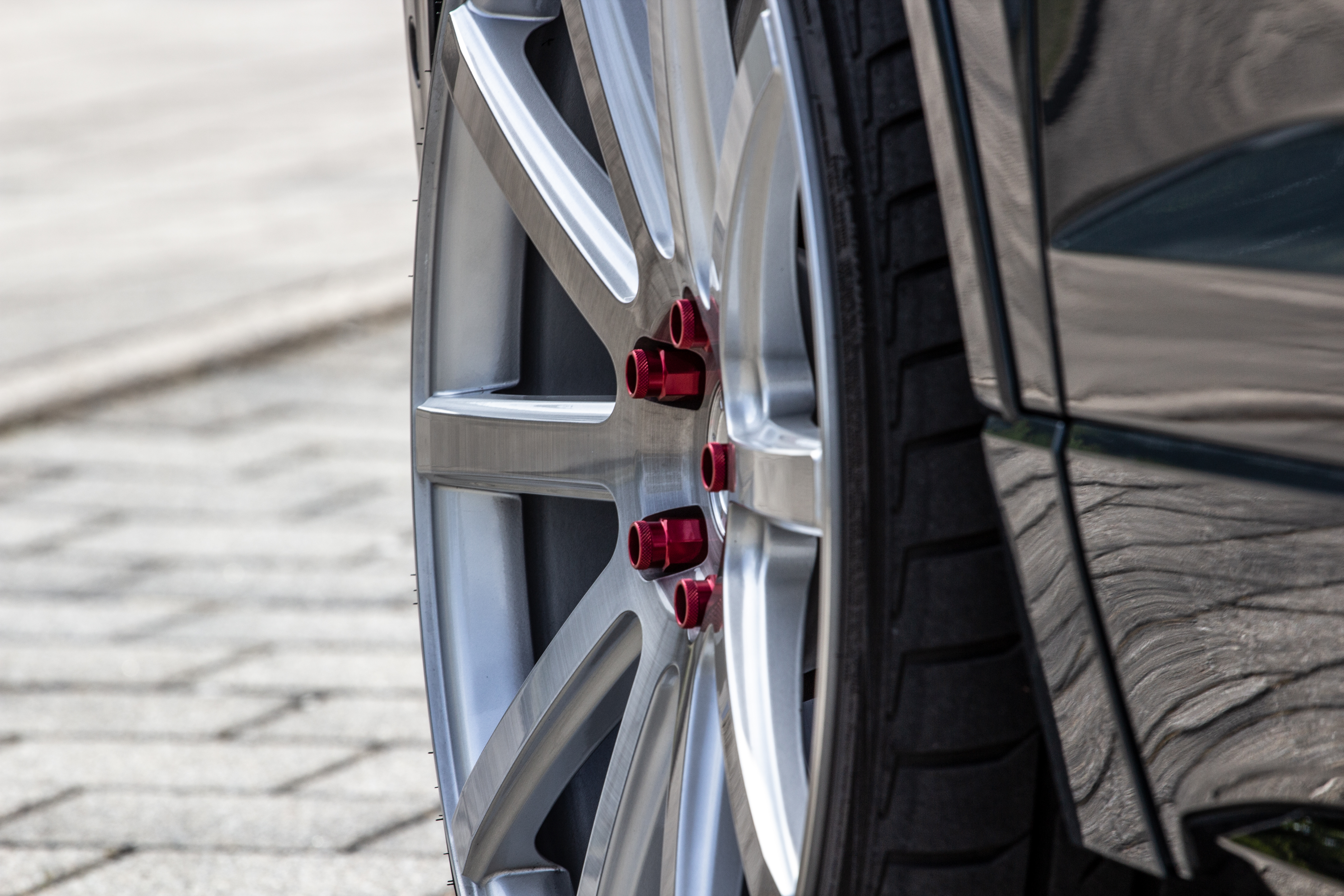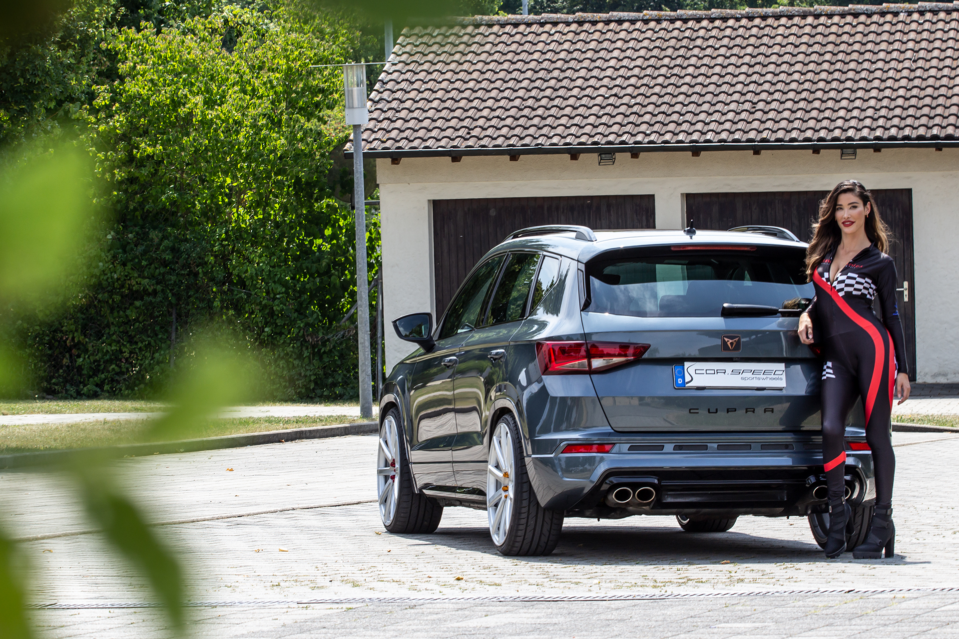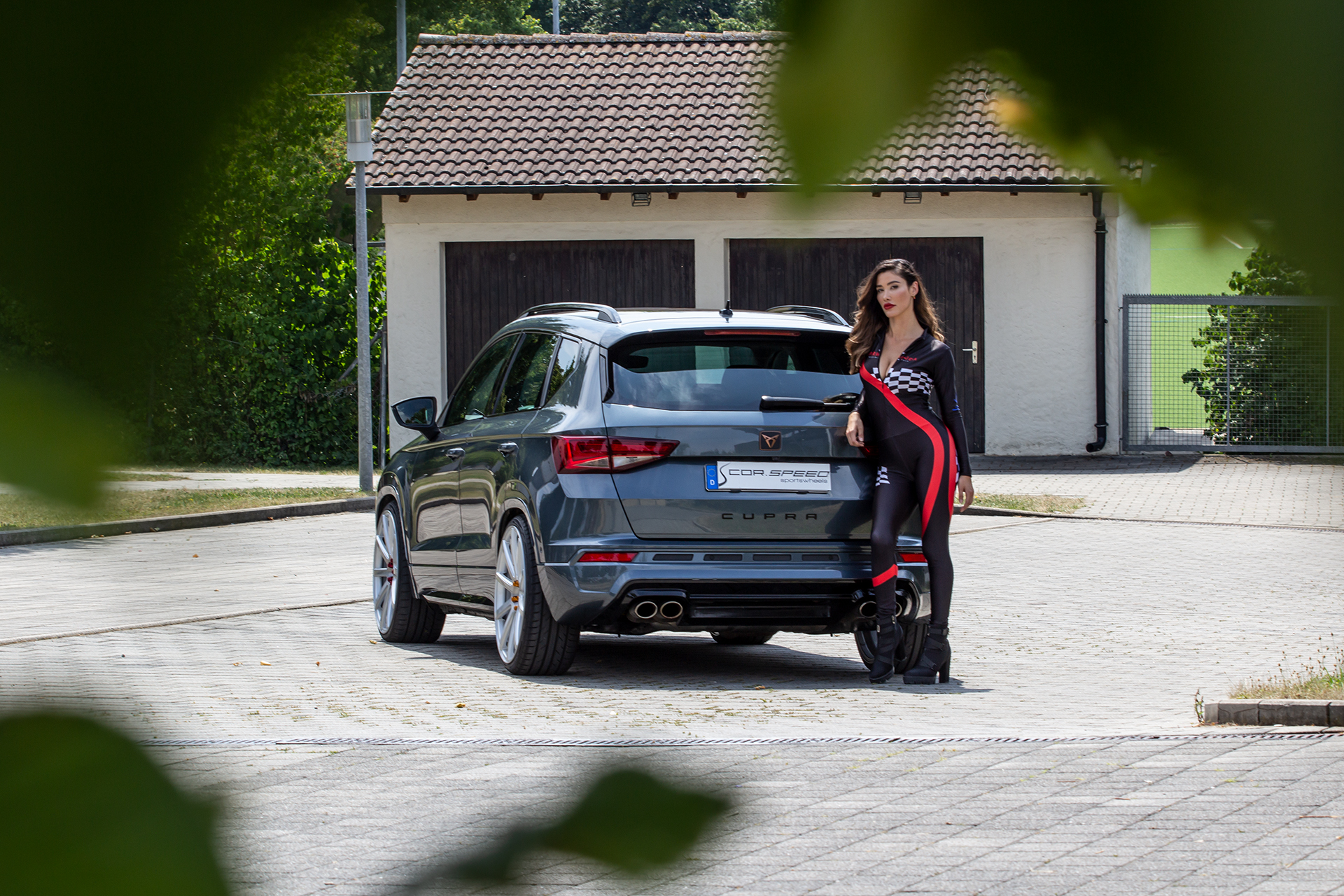 The rather large wheel arches offer enough space for the DeVille light alloy rims in the generous dimensions of 9x21 inches, which are characterized by ten powerfully drawn spokes. With regard to the finish, the choice fell on the classic silver brushed, the mounted tires measure 245/30R21. The well-proven racing bolts from the Cor.Speed sister brand Barracuda Racing Wheels are also used. They skillfully set colored accents, after all they are made here in red and bronze. The additional lowering of the Cupra, which is partly skilfully staged in the pictures by the Cor.Speed ambassador Sabrina Doberstein, was finally brought about with the help of KW coil springs.