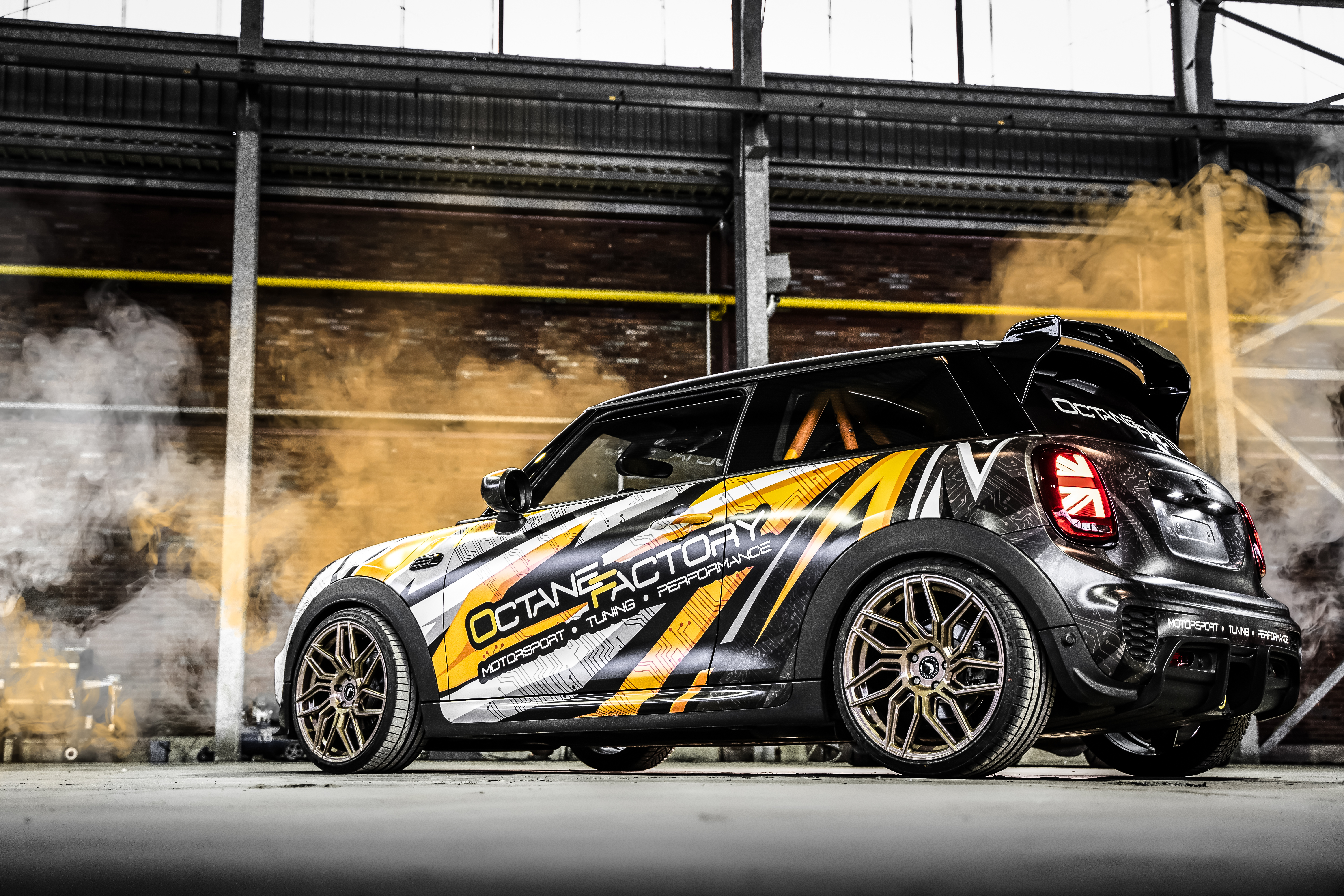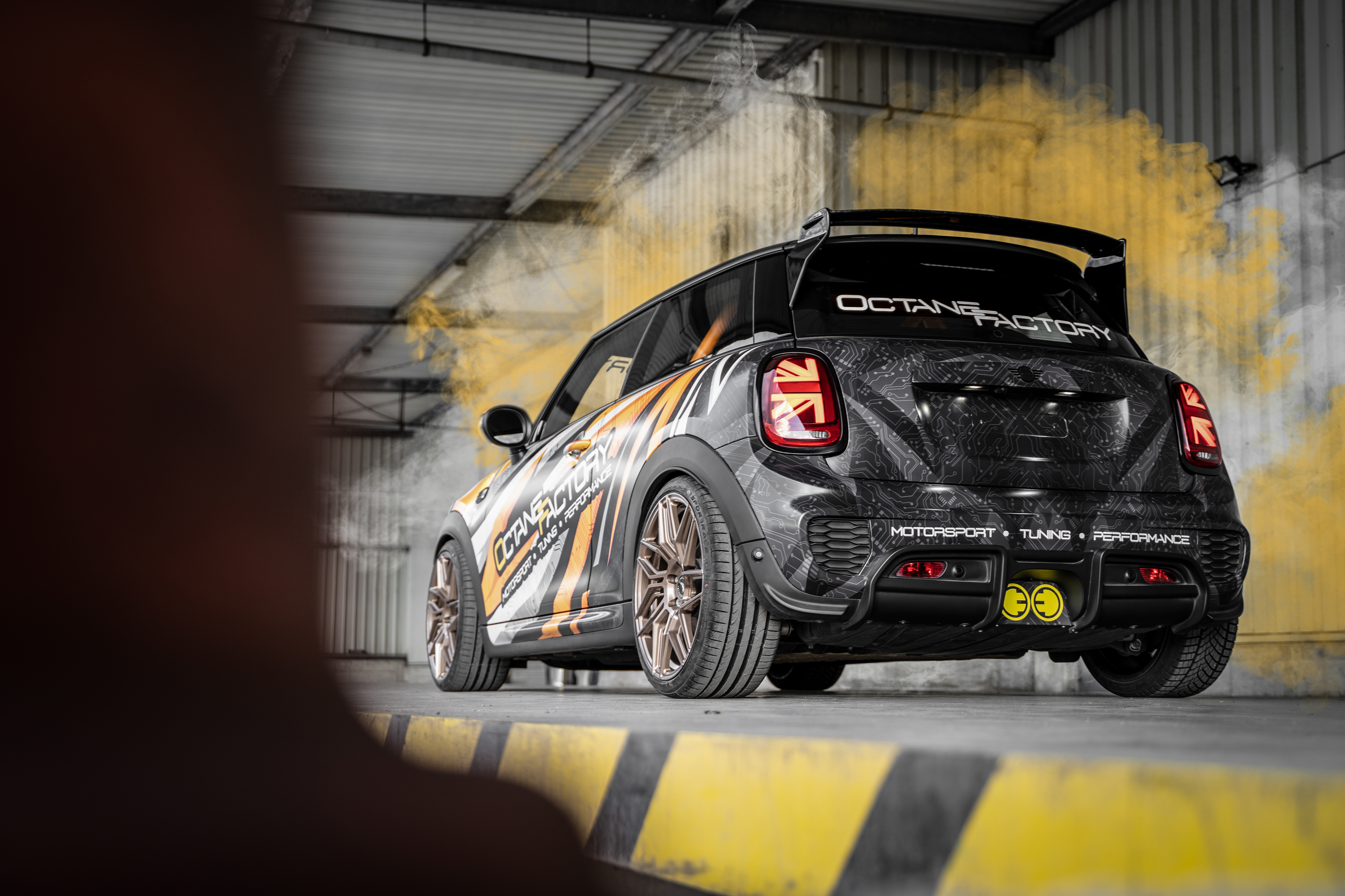 Darüber hinaus realisierte die OCTANEFACTORY einen umfangreichen Umbau der Karosserie, dank dessen der Wagen nun regelrecht das Antlitz des John Cooper Works-Topsportlers trägt. Die Front wird durch einen 3D-Design-Frontspoiler aufgewertet, am Heck finden sich ein JCW Pro-Diffusor, ein großer RSIc6-Spoiler und Union Jack-Rückleuchten vom JCW GP3. Abrundend wurden die Seitenblinker modifiziert. Ein absoluter Eyecatcher ist last but not least selbstverständlich die komplette Designfolierung samt dem Namen des Besitzers auf dem Dach.