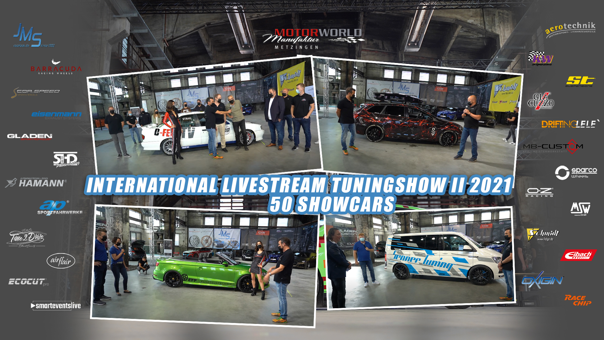(lifepr) (Walddorfhäslach, 13.09.2021) The second, breathtaking edition of the JMS tuning stream lasted seven hours and was a complete success. The livestream again offered a lot of technical information as well as the introduction of the managing directors or employees of numerous well-known partners such as Schmidt Felgen, Barracuda Racing Wheels, Cor.Speed Sports Wheels, OZ Racing, KW supensions, ST suspensions, Eisenmann Exhaust Systems, Gladen Mosconi Europe, JMS Fahrzeugteile, RaceChip, Schwabenfolia, Oxigin etc. In addition, various tuning companies from Germany were able to present themselves and their latest conversions. And with the team from the BSR company from Prague in the Czech Republic, there were even international guests.