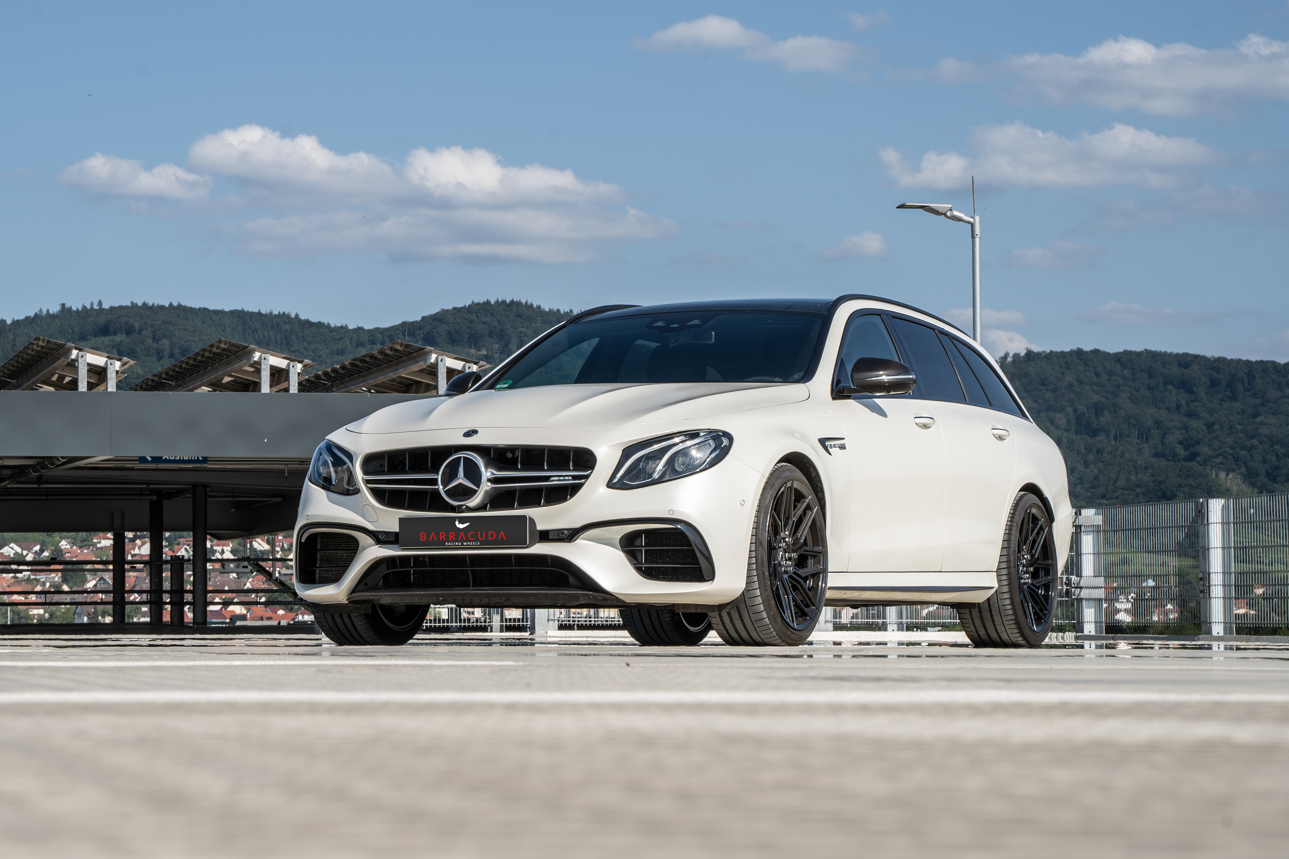 The modification was done by the tuning specialists from MB Custom from Heddesheim near Mannheim and Heidelberg. The team acts as a Barracuda base in the Rhine-Neckar region. It installed the new Barracuda Dragoon wheels in high-gloss black on the axles of the white T model, which really looks great on the AMG. The Dragoon is characterized by seven Y double spokes, but reinterprets this traditional rim design with its asymmetrical rotational dynamics. The concavity, which is particularly pronounced in the 10x20 inch (ET 20/40) dimension installed on the AMG E 63 S, has a powerful effect and the three-dimensional contouring of the pairs of spokes that extend into the rim edge and their fine openings are even reminiscent of the typical millings of forged wheels.