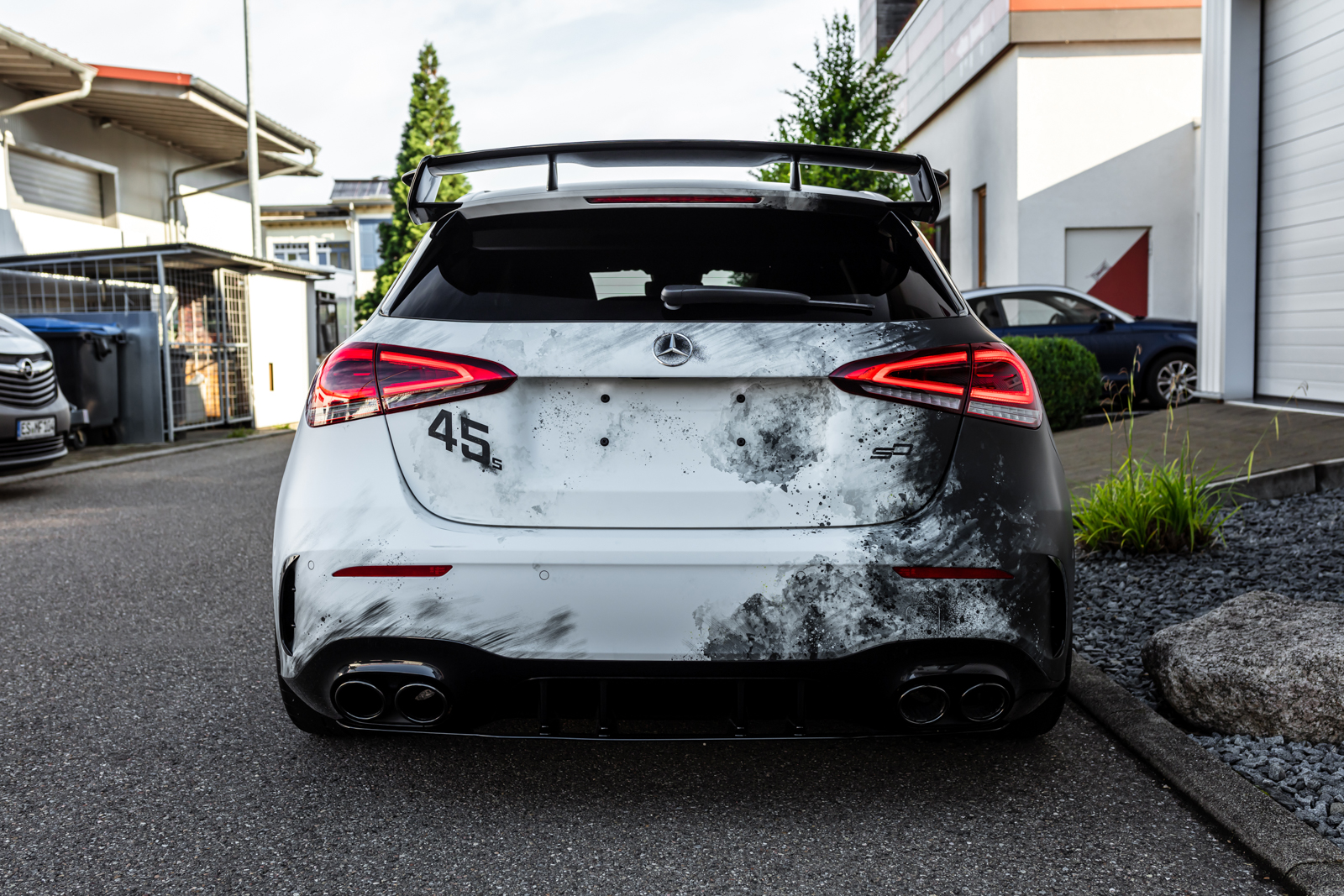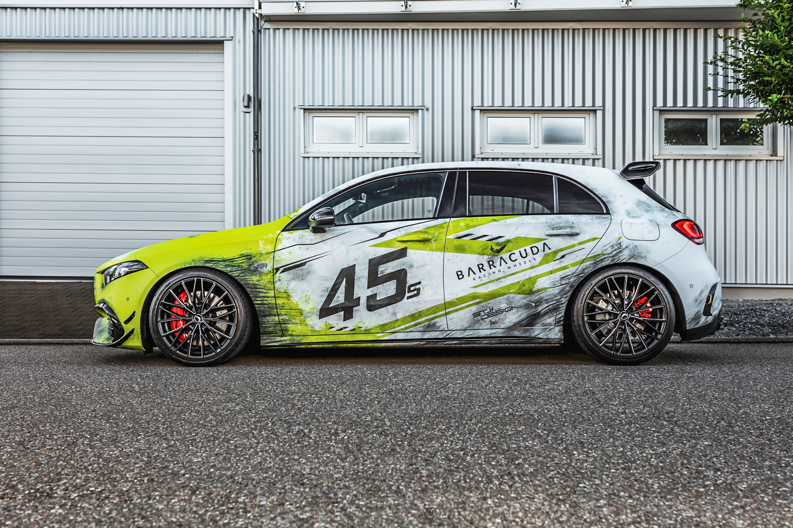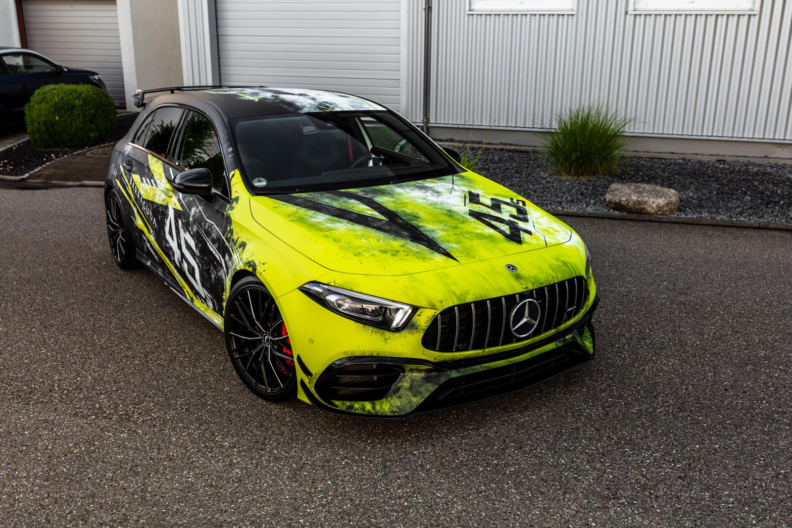 Als weiteres absolutes Highlight erhielt der A 45 S von Schwabenfolia eine aufsehenerregende Digitaldruck-Vollfolierung mit eine asymmetrischen Design in Weiß, Schwarz und Gelbgrün. Das Styling wurde durch Stuii Design entworfen.