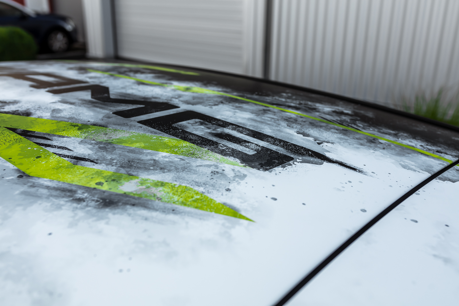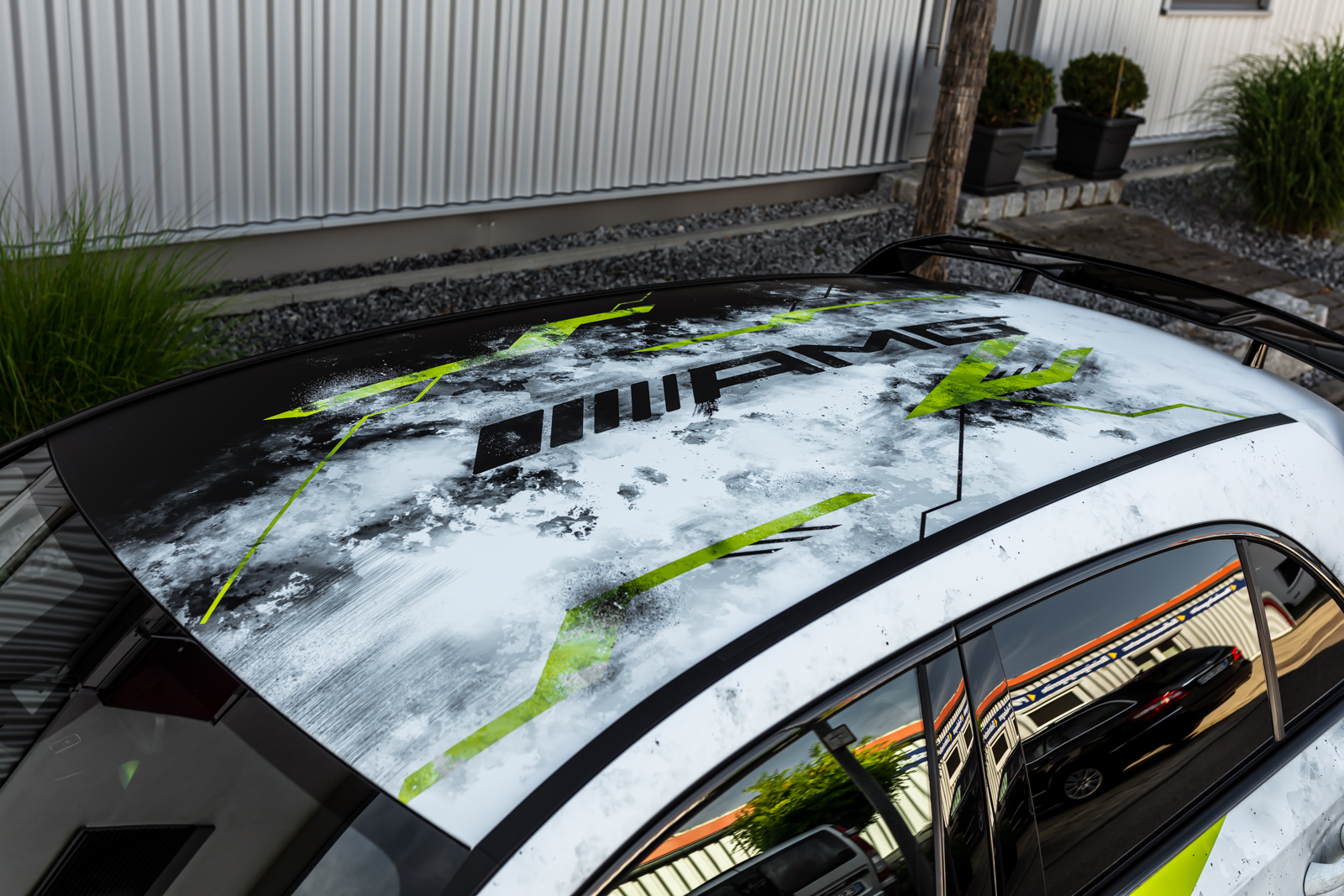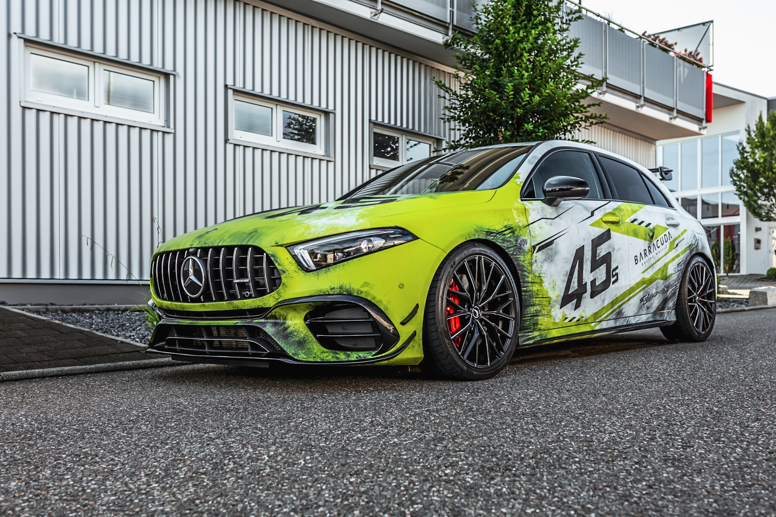 Als weiteres absolutes Highlight erhielt der A 45 S von Schwabenfolia eine aufsehenerregende Digitaldruck-Vollfolierung mit eine asymmetrischen Design in Weiß, Schwarz und Gelbgrün. Das Styling wurde durch Stuii Design entworfen.