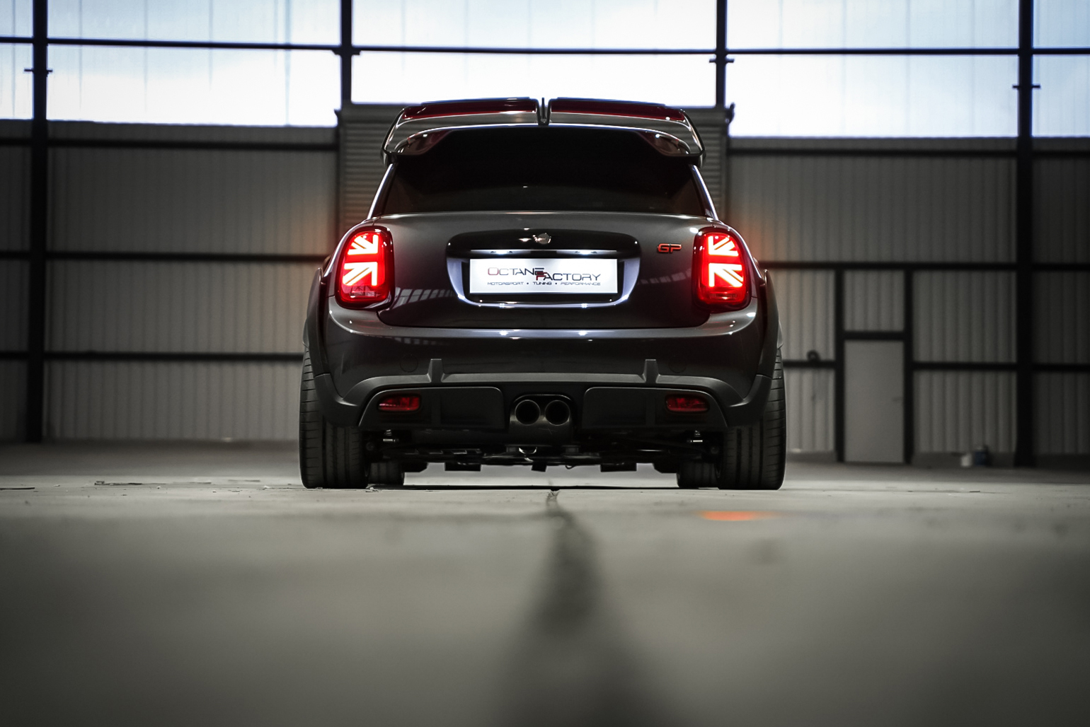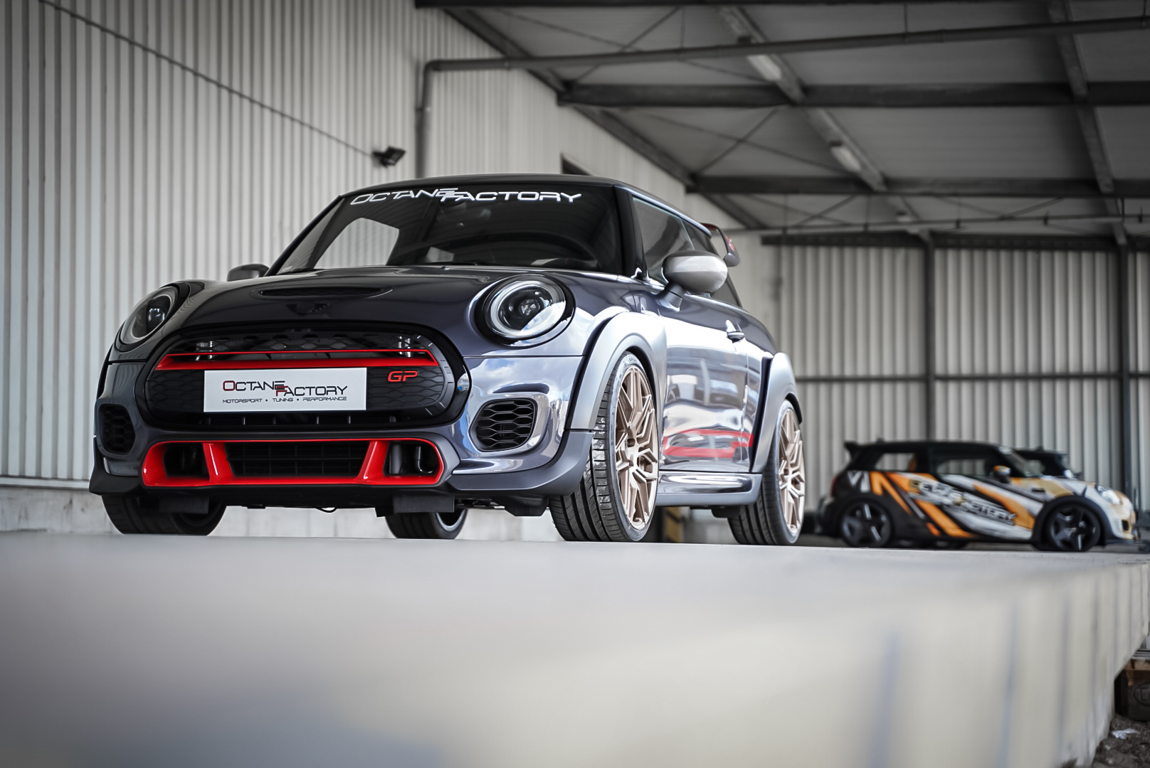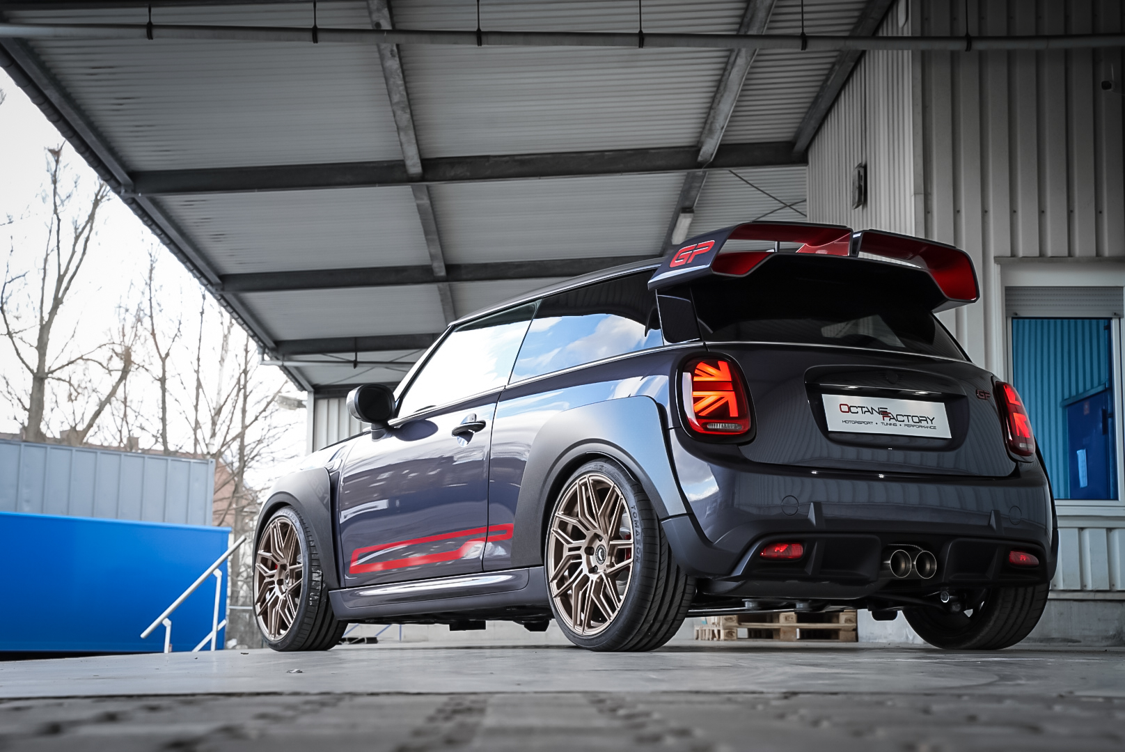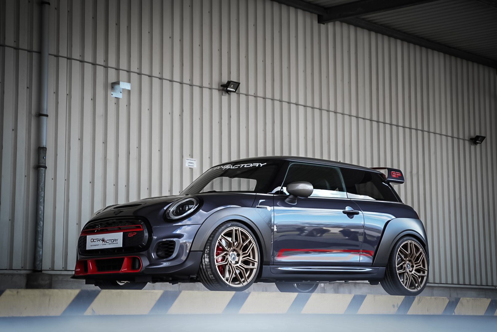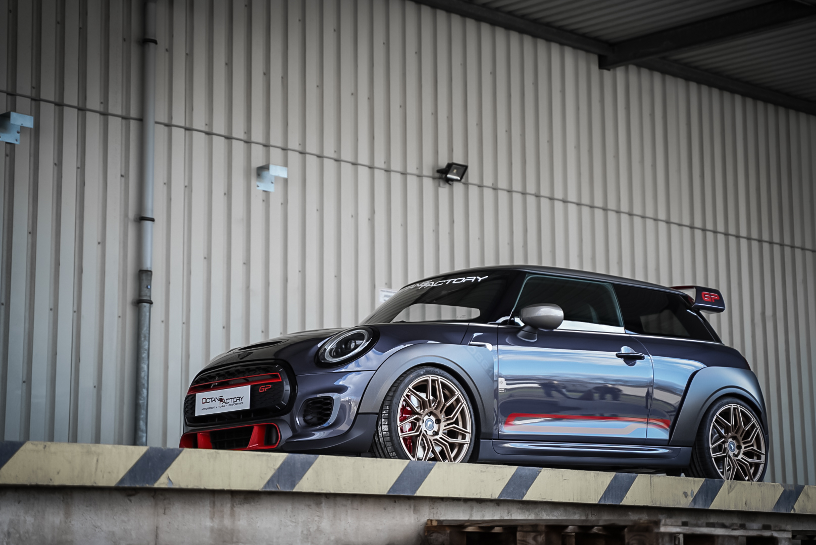 Für den Umbau des JCW GP zeichnen die MINI-Spezialisten der OCTANEFACTORY in Bochum in Kooperation mit JMS Fahrzeugteile verantwortlich. Letztere lieferten als exklusive EU-Vertriebler der Barracuda-Felgen die im Flow Forming-Verfahren hergestellten Dragoon-Räder aus der „Ultralight Series“. Sie haben ein Finish in Highloss Broze, besitzen die Dimensionen 8,5x19 Zoll und sind mit 225/35er Reifen bezogen. Die Tieferlegung der Karosserie führte ein perfekt eingestelltes KW Variante 3-Gewindefahrwerk herbei.
