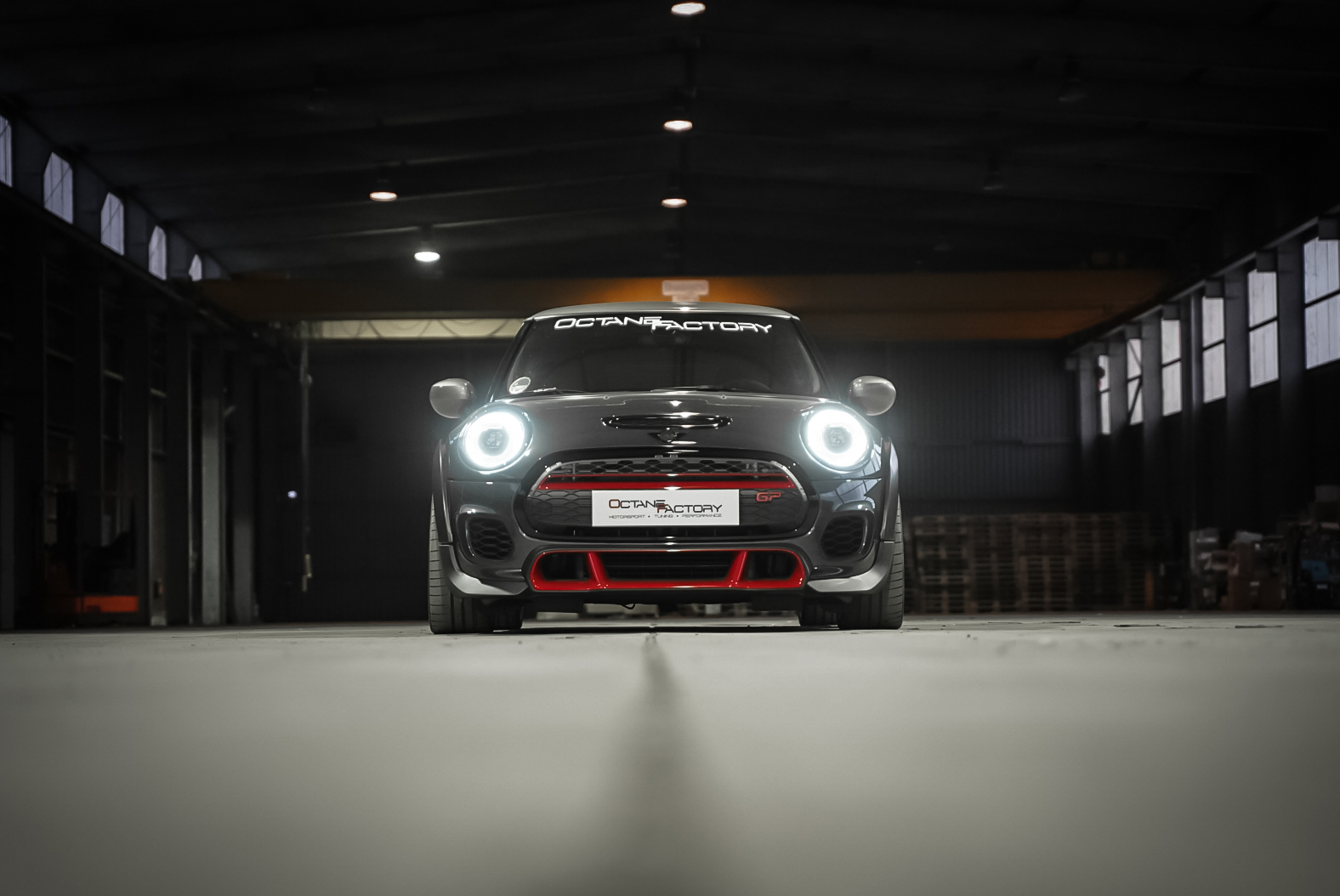 Auf weitere optische Anpassungen verzichtete die OCTANEFACTORY hat sich insbesondere technischen Anpassungen und widmete sich stattdessen der Optimierung von Motor und Bremsen: Mit Hilfe eines Wagner Motorsport-Ladeluftkühlers, einer HJS-200-Zellen-Downpipe sowie einer Software-Überarbeitung erstarkte der Turbo-Vierzylinder auf satte 370 PS. Das maximale Drehmoment beträgt fortan 555 Nm (Serie: 450 Nm). Die Bremsanlage erhielt ein Upgrade auf Stahlflex-Leitungen sowie eine optimierte Kühlung.