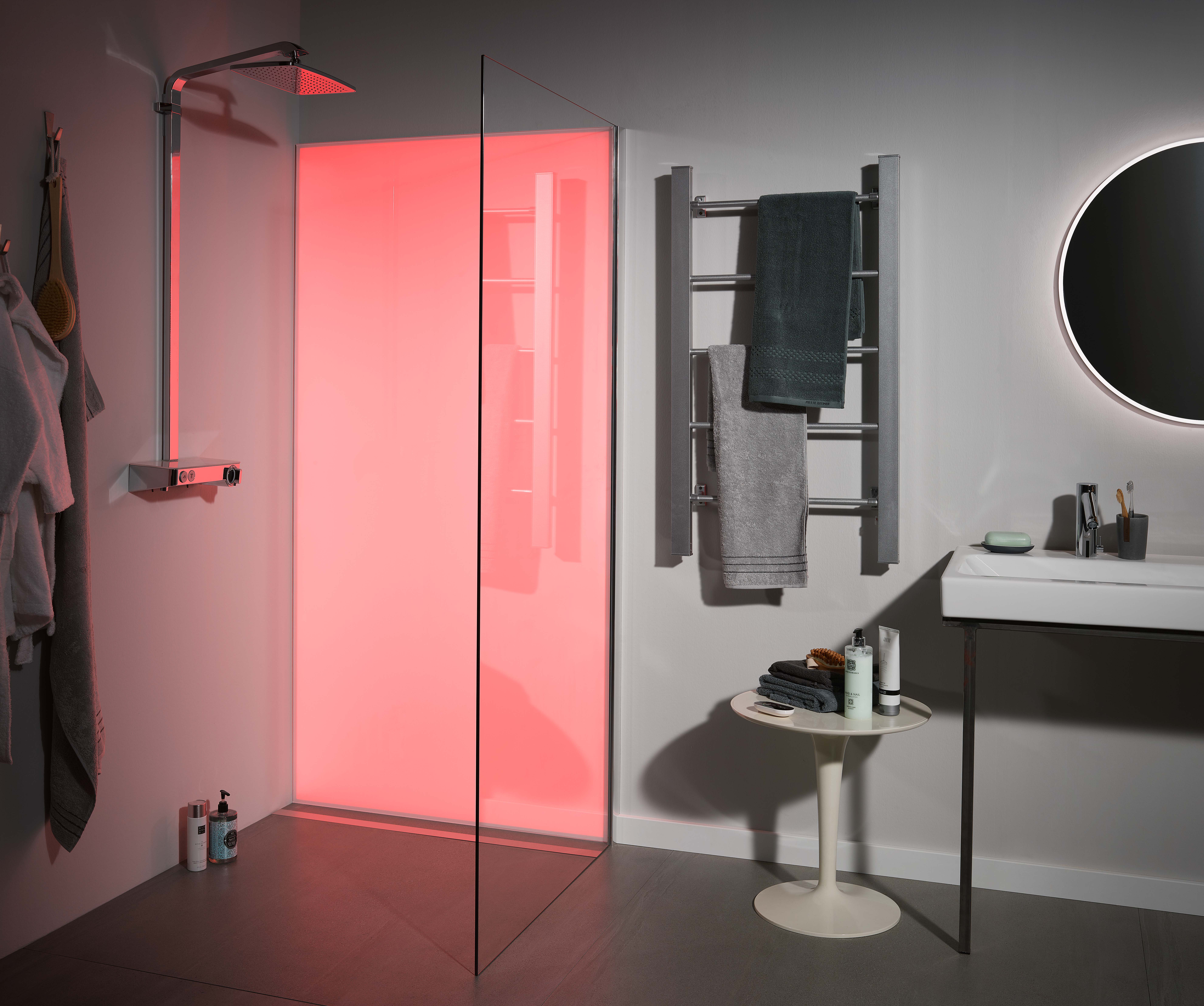 Die Wandverglasung System Premium LED von SPRINZ erstrahlt entweder in unterschiedlichen Weißtönen oder taucht Räume in stimmungsvolle Farbtöne des Regenbogens. Mit einer Fernbedienung lassen sich darüber hinaus bequem Lichtstärke, Farben oder Farb-Wechsel steuern.