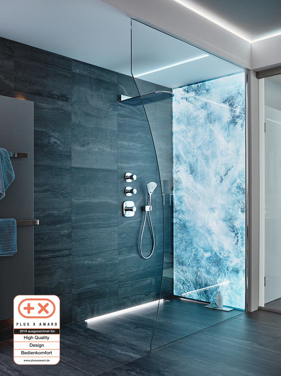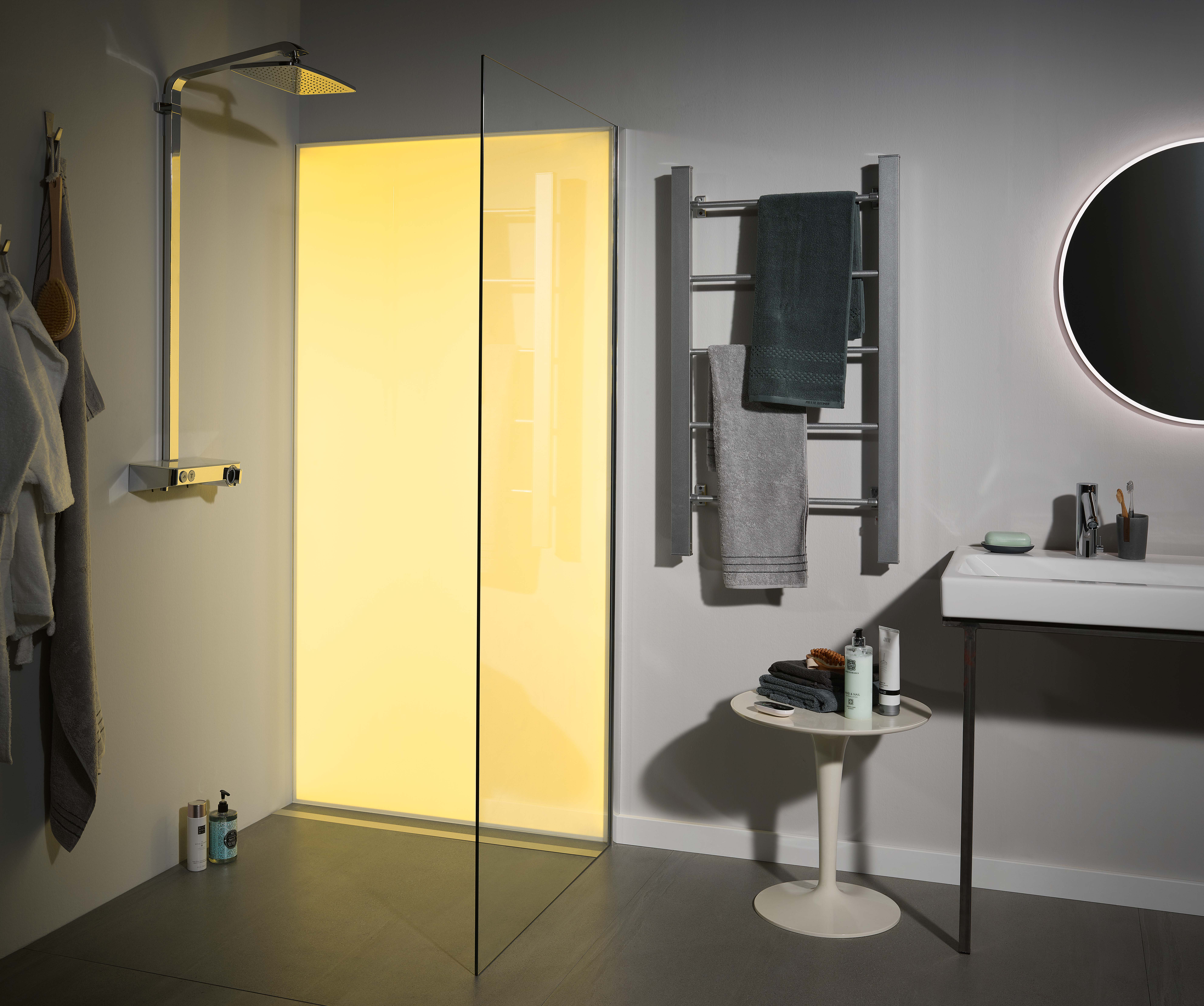 Die Elemente werden nach Maß gefertigt. Mit Maximalmaßen bis zu 1600 x 3200 mm bietet das System aus Einscheibensicherheitsglas eine ebene Fläche ohne Zwischenräume. Diese sorgt für mehr Hygiene im Bad und lässt sich leicht reinigen.