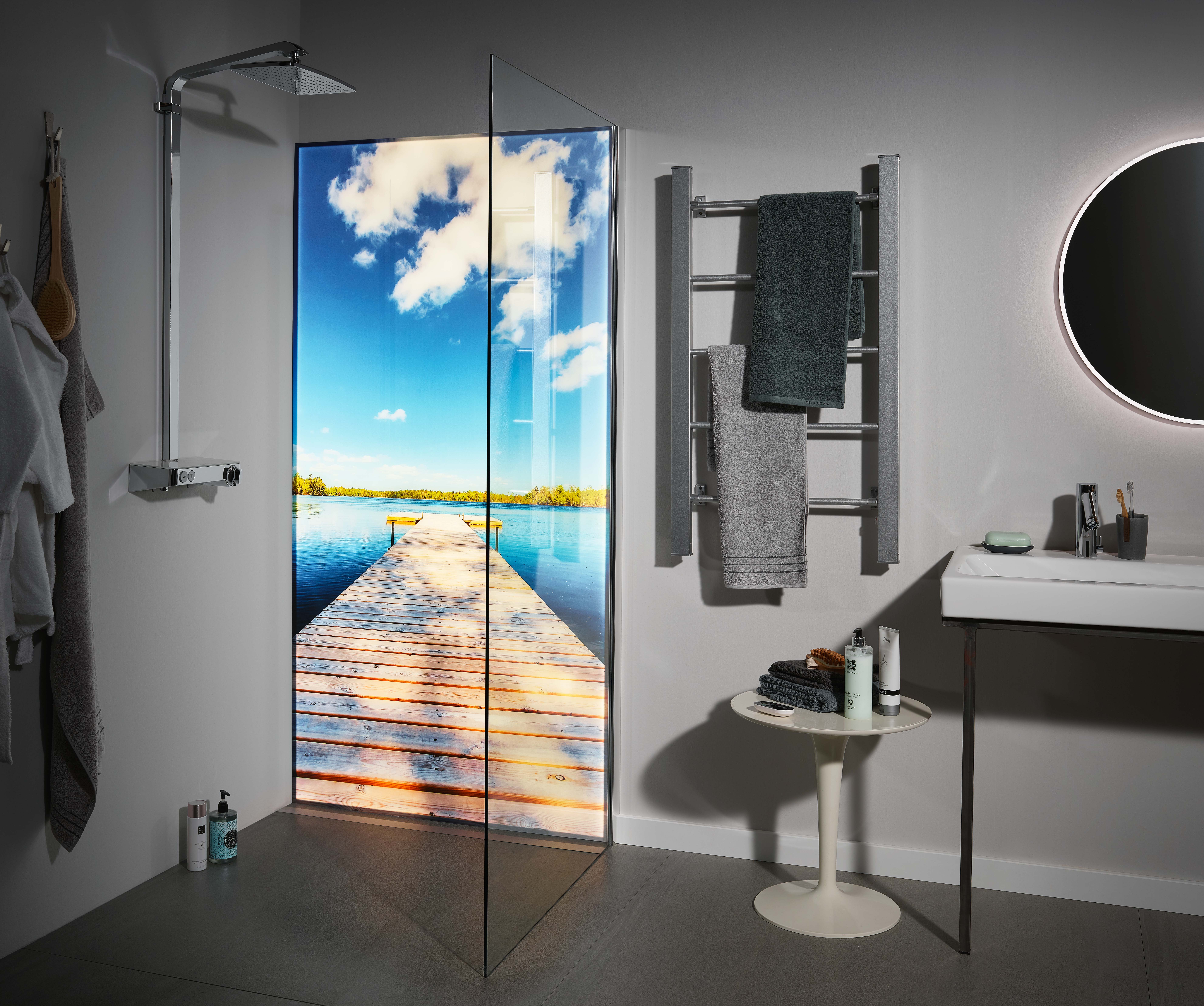 Genug von kahlen Fliesen und nervigem Schrubben zwischen den Fugen! Für ausgediente Fliesen im Bad gibt es eine leuchtende Alternative: bedruckte Glaspaneele mit LED. Diese sind besonders gut für Badrenovierungen geeignet und machen den Duschplatz zum Highlight. Ob Neubau oder Badrenovierung – das in sich geschlossene System montieren Spezialisten dort, wo es die Kunden wünschen.