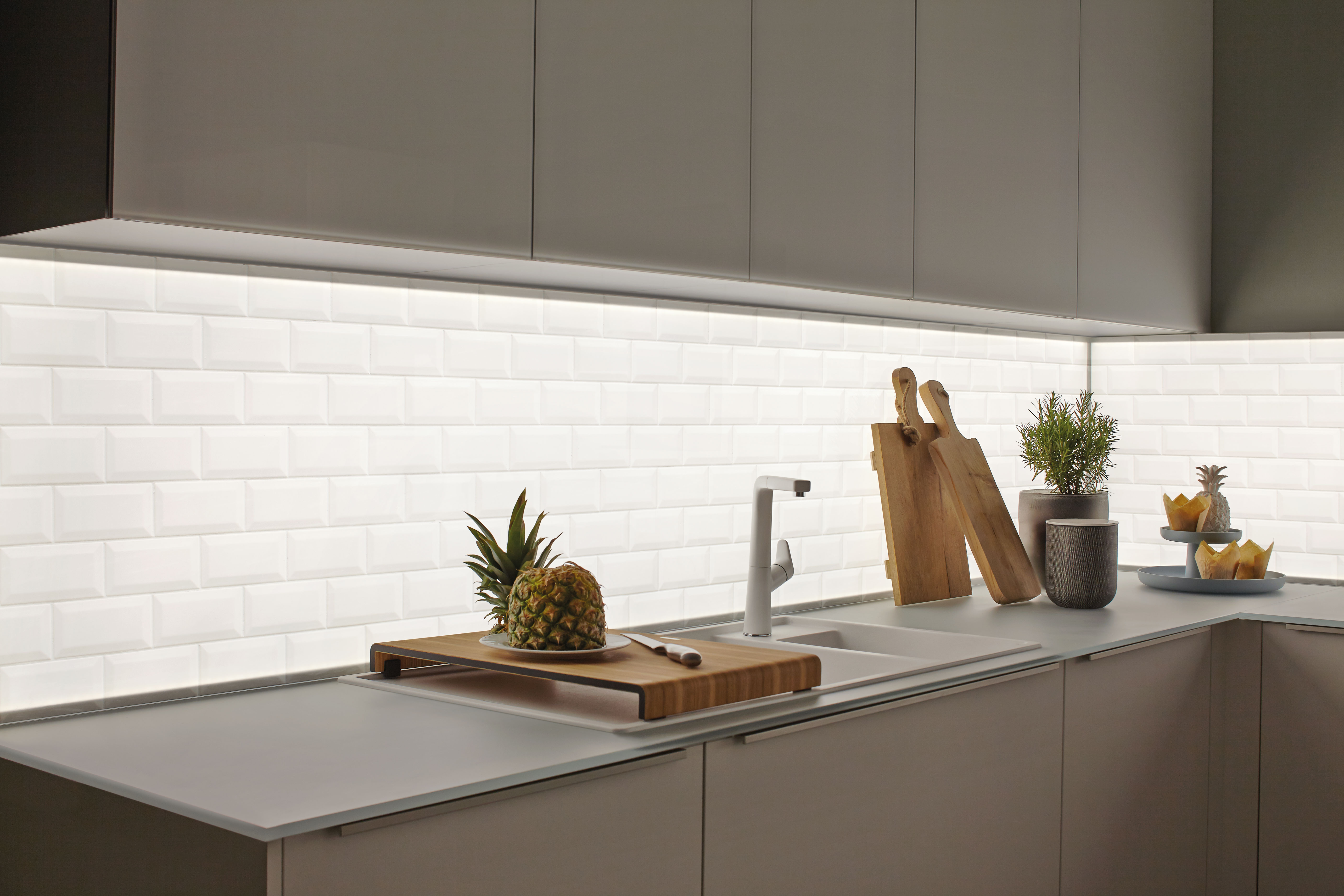 Ein lichtweißes Glaselement mit LED-Beleuchtung macht die Rückwand in der Küche zur Leinwand für Farbe, Helligkeit und individuelle Farbverläufe. Ganz nach Stimmung nutzt man ein wechselndes Farbspektrum, Mischweiß oder eine stete einzelne Farbe.