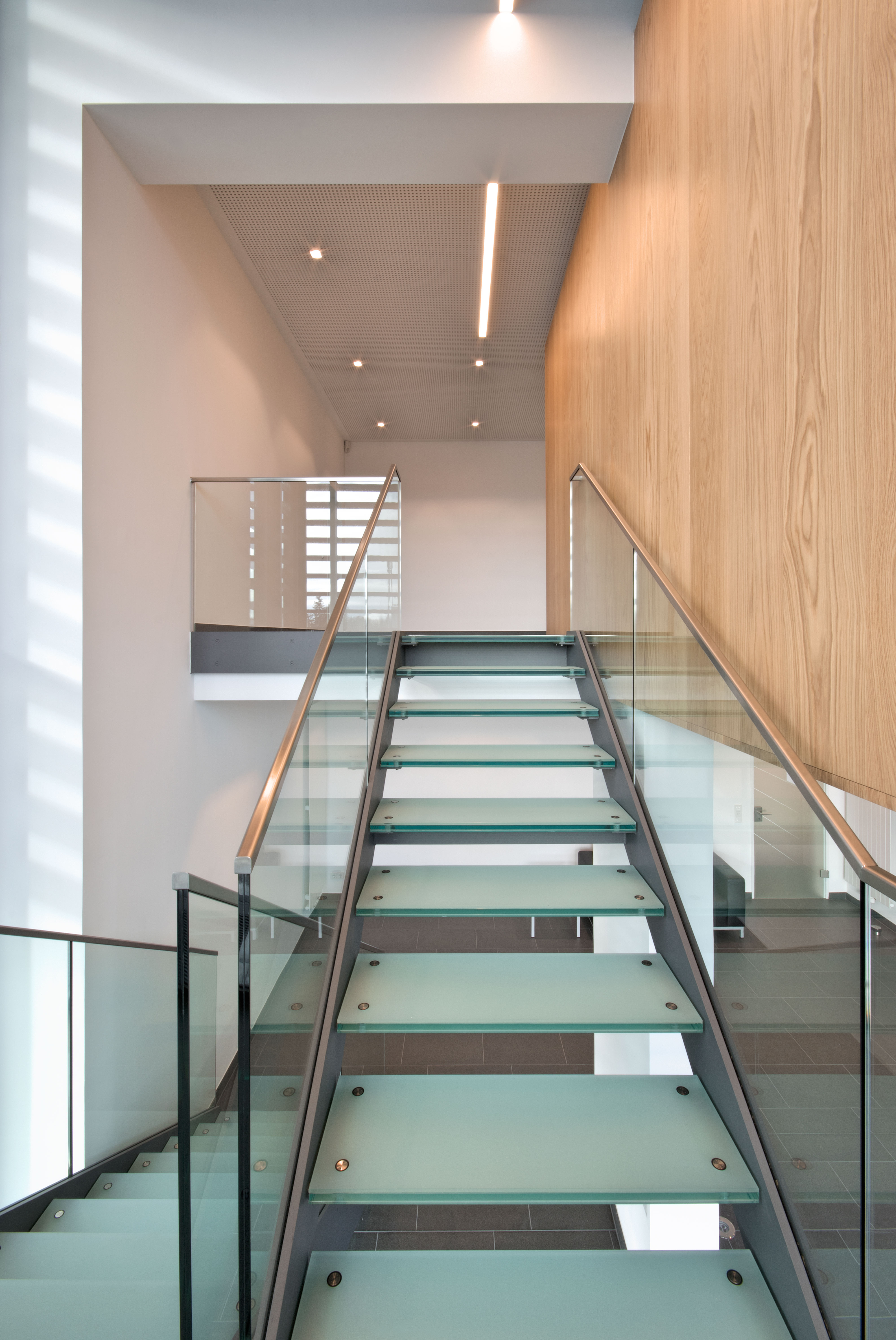 Der Aufbau der Treppenstufen setzt sich aus Einzelscheiben zusammen, die aus Verbundsicherheitsglas bestehen, um genügend Stabilität und Sicherheit zu bieten. Das Verbundsicherheitsglas besteht immer aus drei Einzelschieben in Verbindung mit PVB-Folien zwischen den einzelnen Scheiben. Die oberste teilvorgespannte Glasschicht dient als „Schutzschicht“ vor Beschädigungen und Stößen. Ihr Hauptnutzen besteht darin, die beiden unteren Gläser zu schützen, da diese die statisch tragenden Scheiben darstellen.