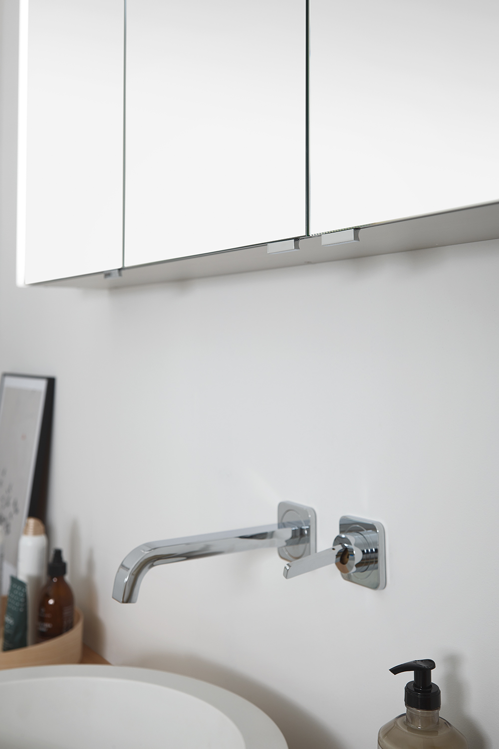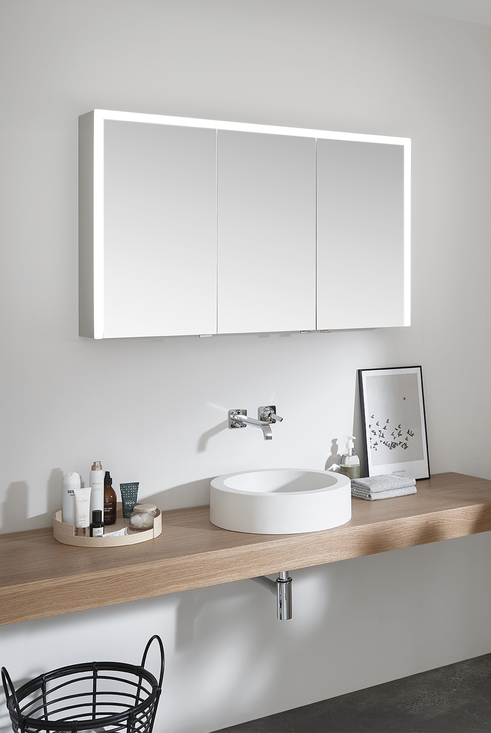 Dreiseitige Lichtbänder werden mittels LED Technik ebenmäßig hinterstrahlt. Die Weißlichtadaption mit Dimmung sorgt dabei für eine aufregende Intensität der Farben. Weitere optische Highlights sind optionale dimmbare Lichtlösungen wie Aufsatzleuchten oder die Waschplatzbeleuchtung, die dem Schrank räumliche Leichtigkeit verleihen.