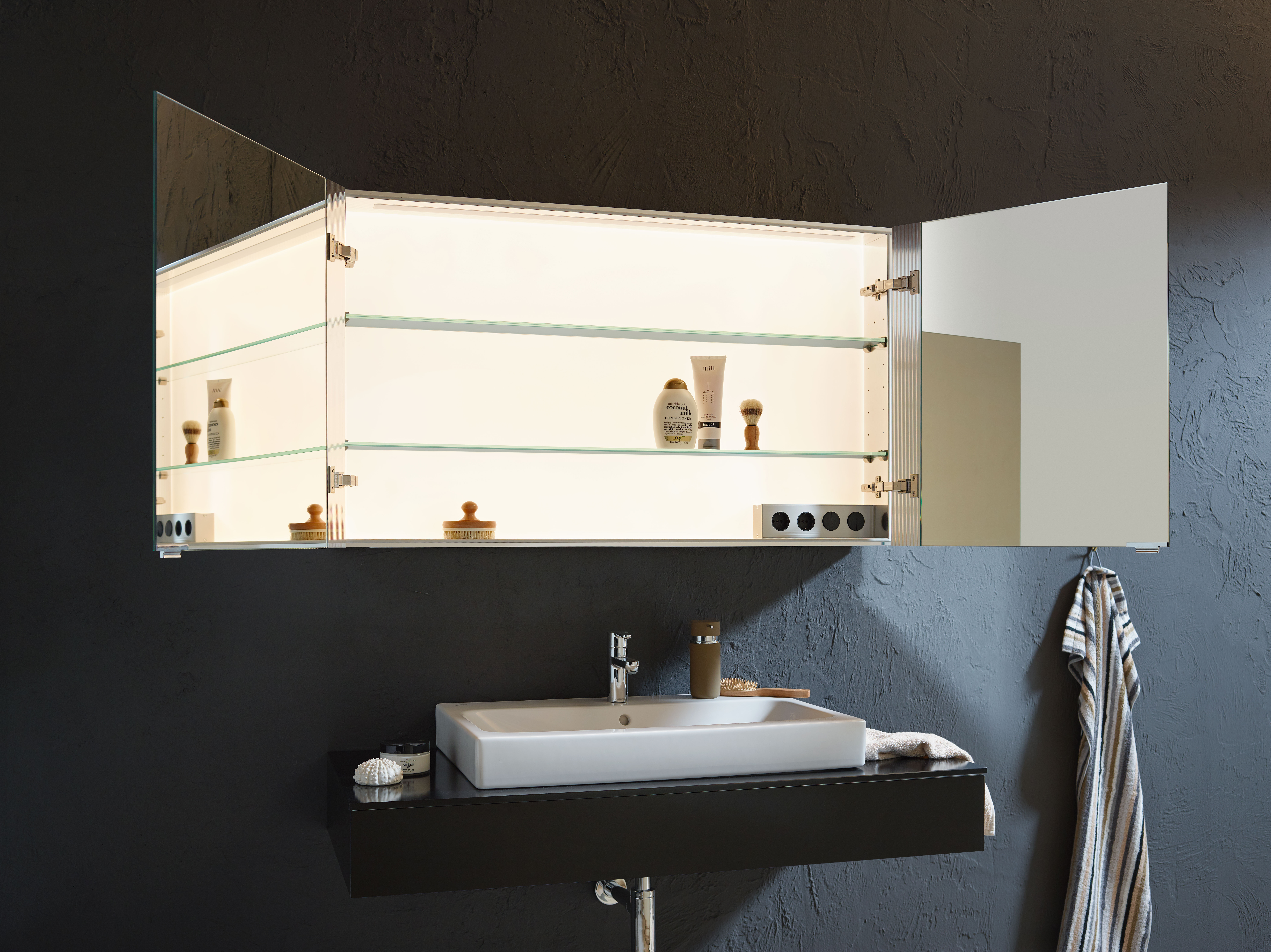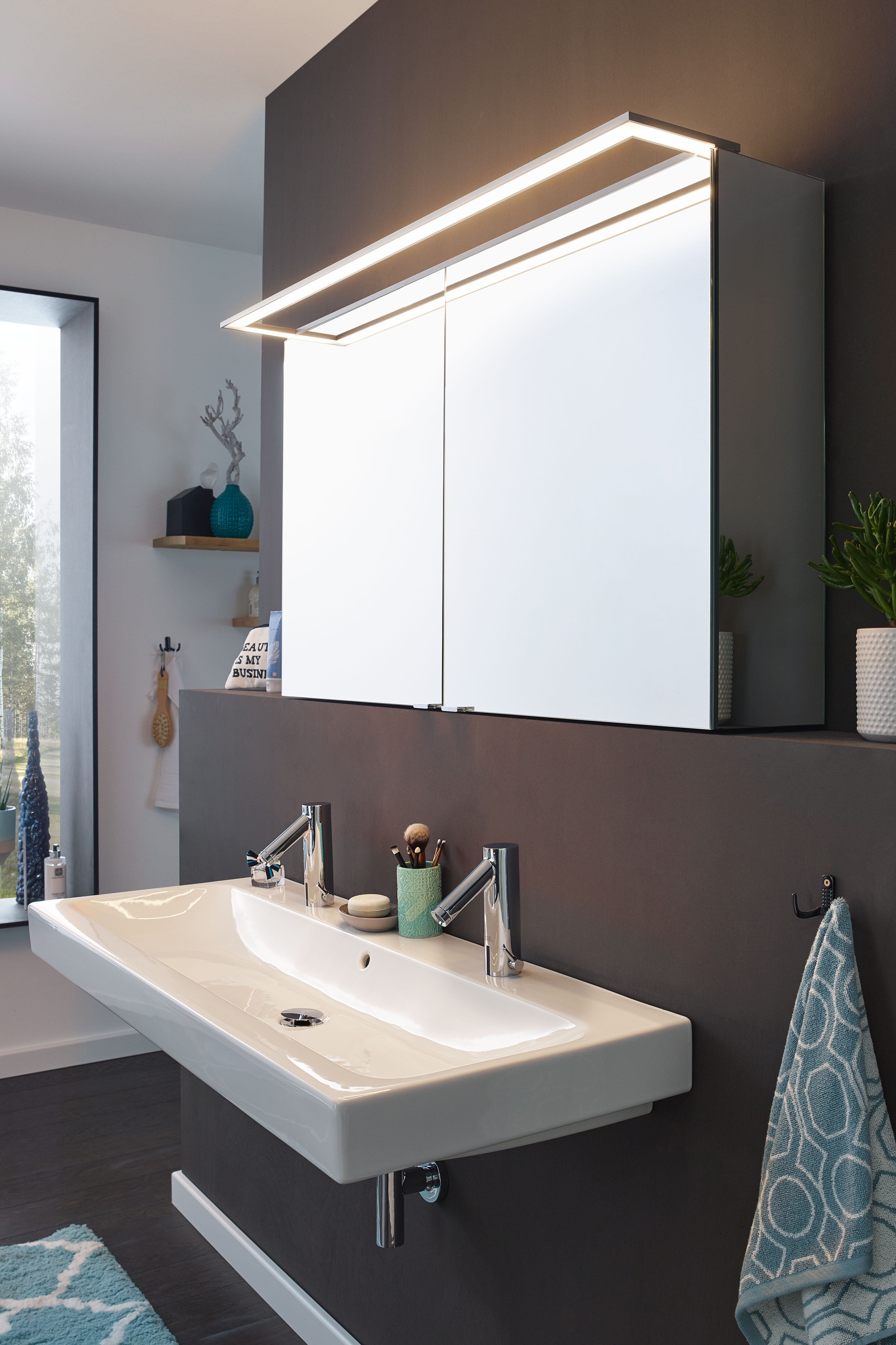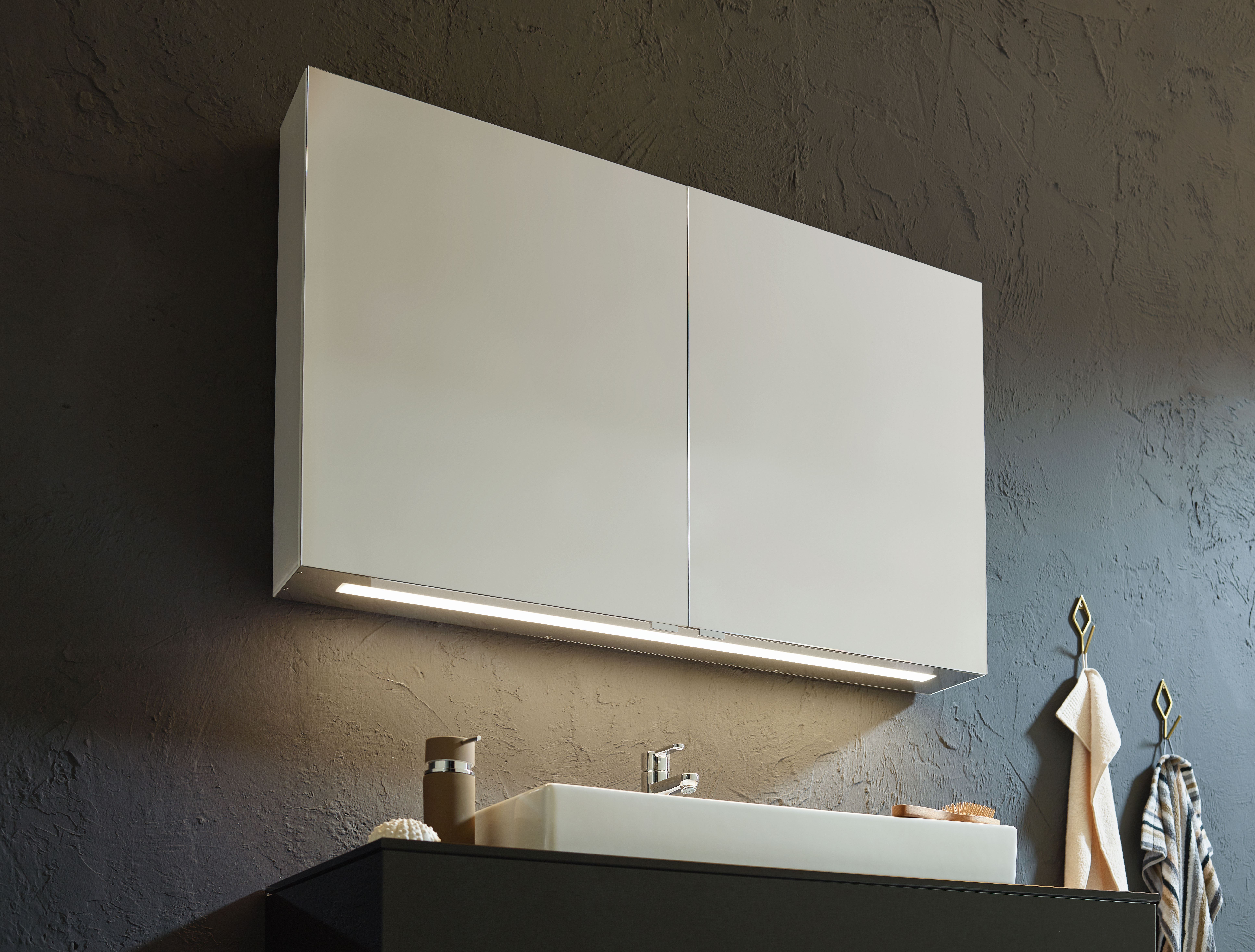 Die beleuchtete Rückwand setzt Flakons im Schrank in Szene und Licht von oben illuminiert auch bei geöffneten Türen. Licht, das den Waschplatz unter dem Spiegelschrank ausleuchtet, ist eine weitere Spielart von Licht im Bad. Die Auswahl ist so umfassend und unterschiedlich wie Platz und Einbausituationen in der Badestube.