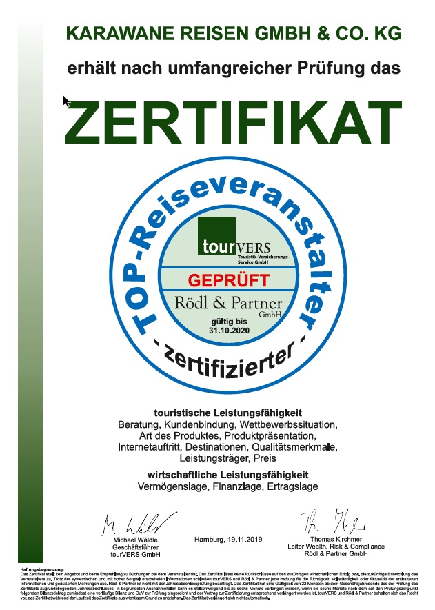 (lifepr) (Ludwigsburg, 22.11.2019) Bereits zum 7. Mal in Folge hat sich der in Ludwigsburg ansässige Reiseveranstalter Karawane Reisen GmbH & Co. KG der anspruchsvollen Prüfung zum „TOP-Reiseveranstalter“ durch die tourVERS GmbH als Anbieter der Insolvenzversicherung sowie der renommierten Beratungs- und Prüfungsgesellschaft Rödl & Partner gestellt und in nahezu allen Kategorien beste Ergebnisse erzielt. Neben den betriebswirtschaftlichen Kennzahlen wurden auch die touristischen Aspekte wie etwa die Qualität der Beratung, die Vielfalt der angebotenen Destinationen und die Produktpräsentation genau unter die Lupe genommen.