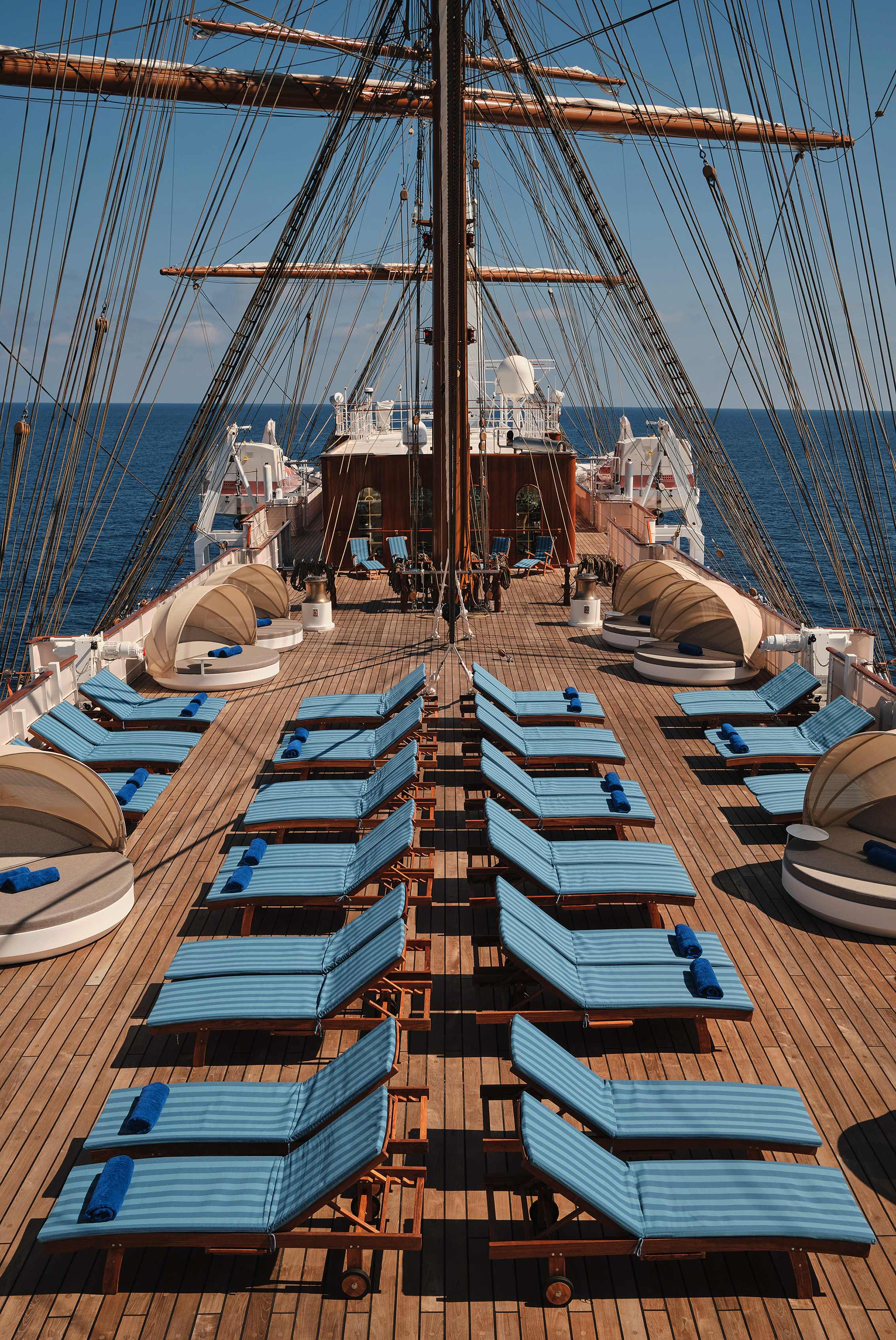 Die SEA CLOUD SPIRIT ist ein waschechter Großsegler. Dementsprechend folgt die Crew bei jeder Fahrt einem traditionellen Ritual und setzt die Segel komplett von Hand. Gäste bekommen einen Einblick in den Alltag der Besatzung, während sie an Bord Entschleunigung genießen. Maritimes Ambiente zieht sich durch alle Räumlichkeiten – vom Speisesaal bis in jede der Außenkabinen, von denen viele über einen Ausblick aufs Meer sowie einen Balkon verfügen. Insbesondere die Kulinarik macht das Reisen mit der SEA CLOUD SPIRIT zum echten Genuss: Die Küchenchefs bereiten Menüs aus lokalen Zutaten vor, die auch vor Ort eingekauft werden – vom marktfrischen Fisch bis hin zum exklusiven, landestypischen Qualitätswein als besonderes Schmankerl. Die Küche gestaltet sich damit sehr abwechslungsreich: Mal gibt es ein Barbecue an Deck, mal ein elegantes Dinner im Restaurant. Bis zu 136 Personen finden an Bord Platz.