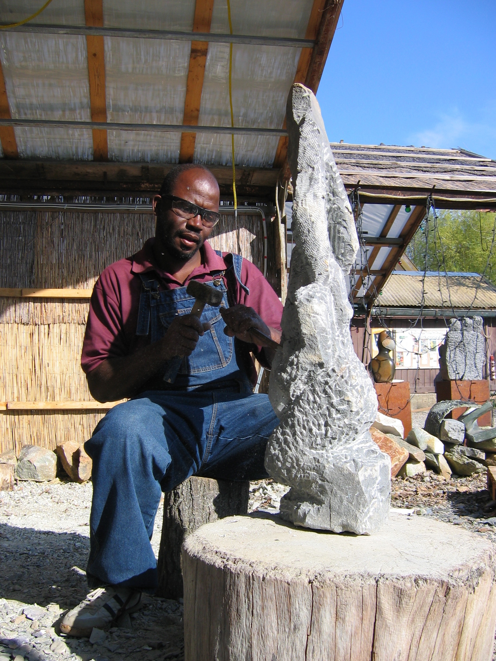 (lifepr) (Gundelfingen, 23.07.2009) Mitte Juli nahm der 43-jährige Bildhauer Washington Msonza aus Simbabwe im Bildhauerbereich des Kulturgewächshaus' Birkenried wieder Hammer und Meißel in die Hand, um seine kraftvollen Werke aus den Steinen herauszuarbeiten. Den figürlich und spirituell arbeitenden Künstler sieht man meist mit schwerem "Fäustel" und großem Spitzmeißel am Stein.