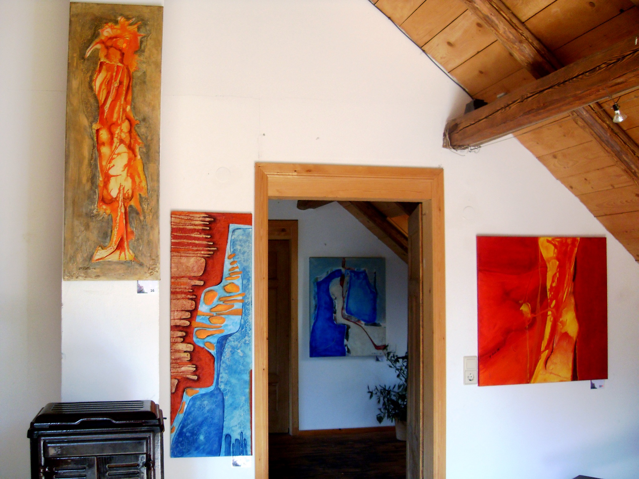 Die unterschiedlichen Formate bis zu einer Größe von 80x100cm fügen sich in die ursprünglich als Wohnhaus konzipierte Galerie hervorragend ein und erzeugen mit ihrer unterschiedlichen Farbigkeit immer wieder überraschende Effekte.