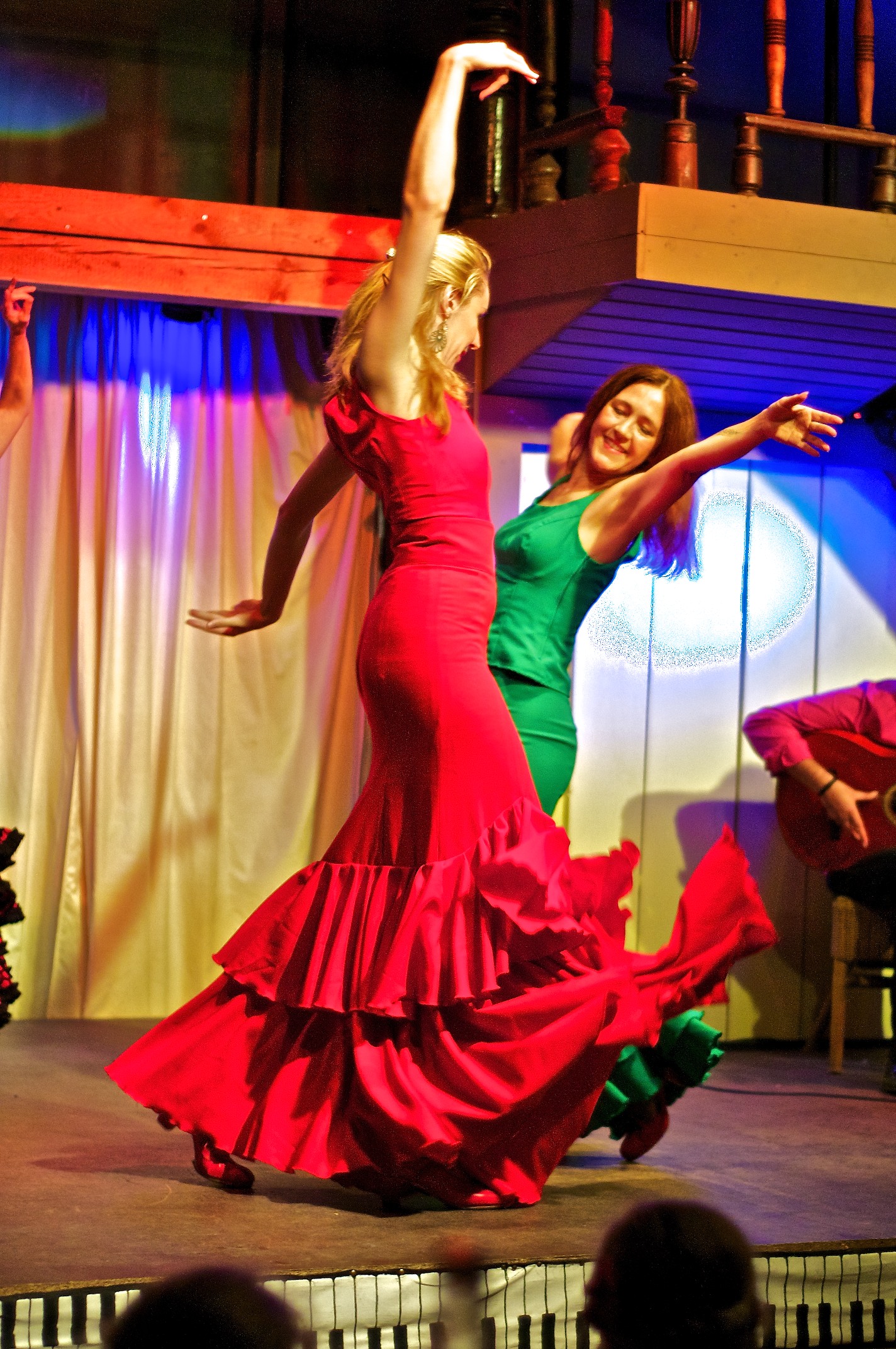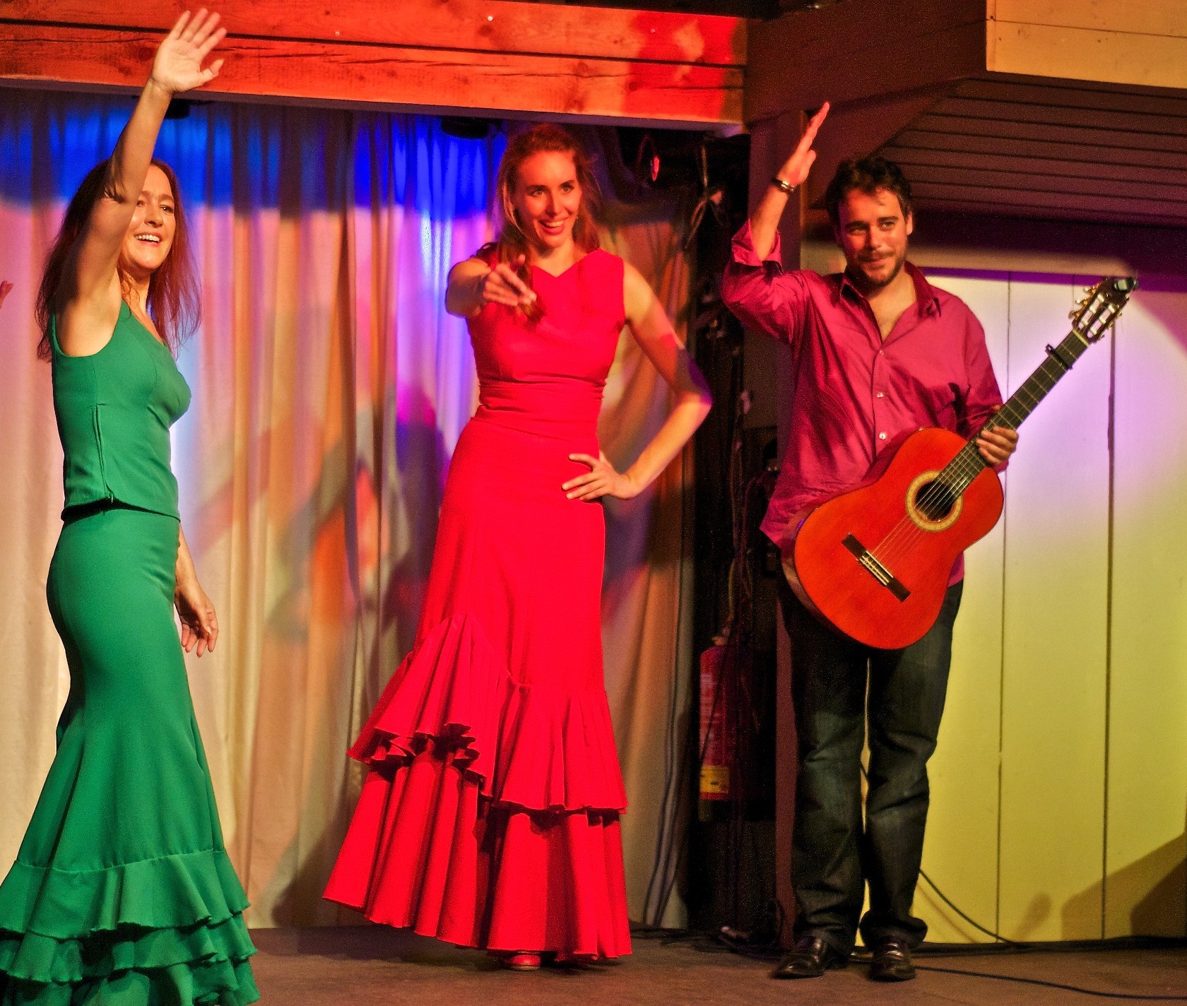 Mit einer kleinen Choreographie ernteten die Kleinen vom Kinderkurs (ab 4 Jahre) zu Beginn viel Applaus. Zusammen mit der Flamencolehrerin und Tänzerin Bella Paloma aus Berlin ergab sich mit den Kindern fast das Bild von Schneewittchen und den sieben Zwergen. Ebenso erntete der Auftritt der erwachsenen Flamencitas viel Beifall. Ari la Chispa, die diesen Kurs mit Gitarrenbegleitung von Valle Monje aus Jerez leitete, gehört schon lange zur professionellen Flamencoliga in Deutschland und wird von ihren Schülern regelrecht verehrt. Nicht aus Zufall hatte sie Carlos Saura vor rund 10 Jahren für Carmen an der Stuttgarter Oper engagiert.