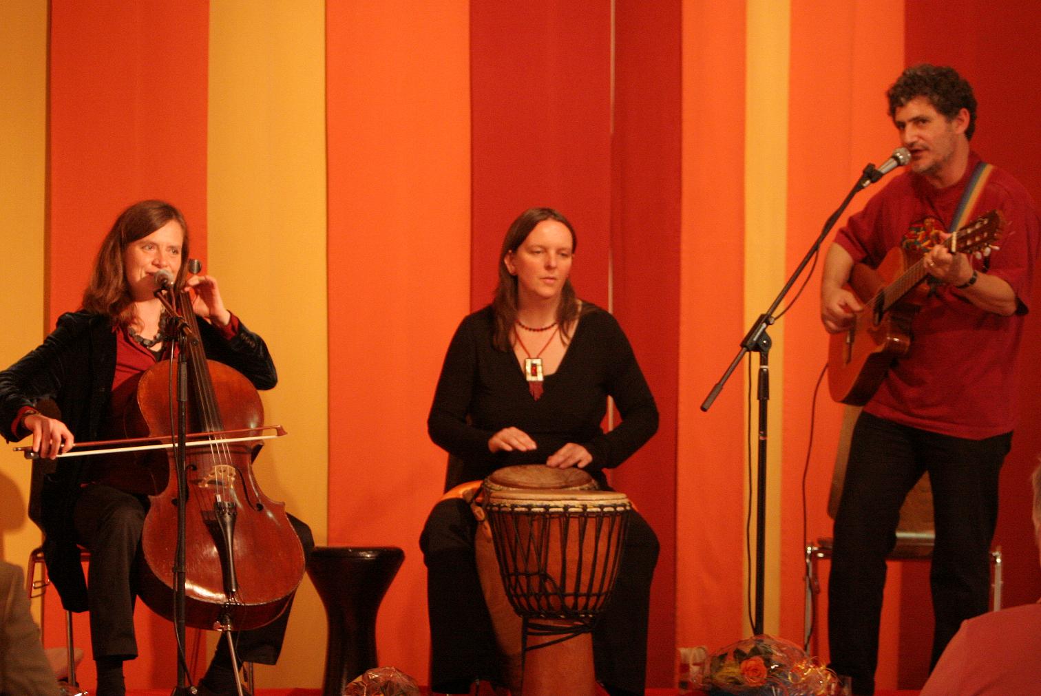 Dabei verwendet das Trio die Musik als universelle Sprache: Der jüdische Kriegsdienstverweigerer Ofer Golany aus Jerusalem, die fremdenfreundliche Cellistin Angelika Wagener aus dem Berliner Umland und die weltoffene Percussionistin Sonja Poland aus dem schwäbischen Kutzenhausen reisen mit einem spirituellen Kabarett durch die menschlichen Schwächen von Ego, Paranoia, Angst und Scham. Diese werden geheilt durch zeitweise meditative und viel humoristische durch Seelenmassage, gewürzt mit Klezmer, Flamenco, Jazz, Zappa auf russisch, Heiligem Franziskus auf englisch und a bissel jiddisch, gekocht auf einer Flamme mit Publikumsbeteiligung- bis der Geschmack von "musikalischem Kokain" sich entfaltet.