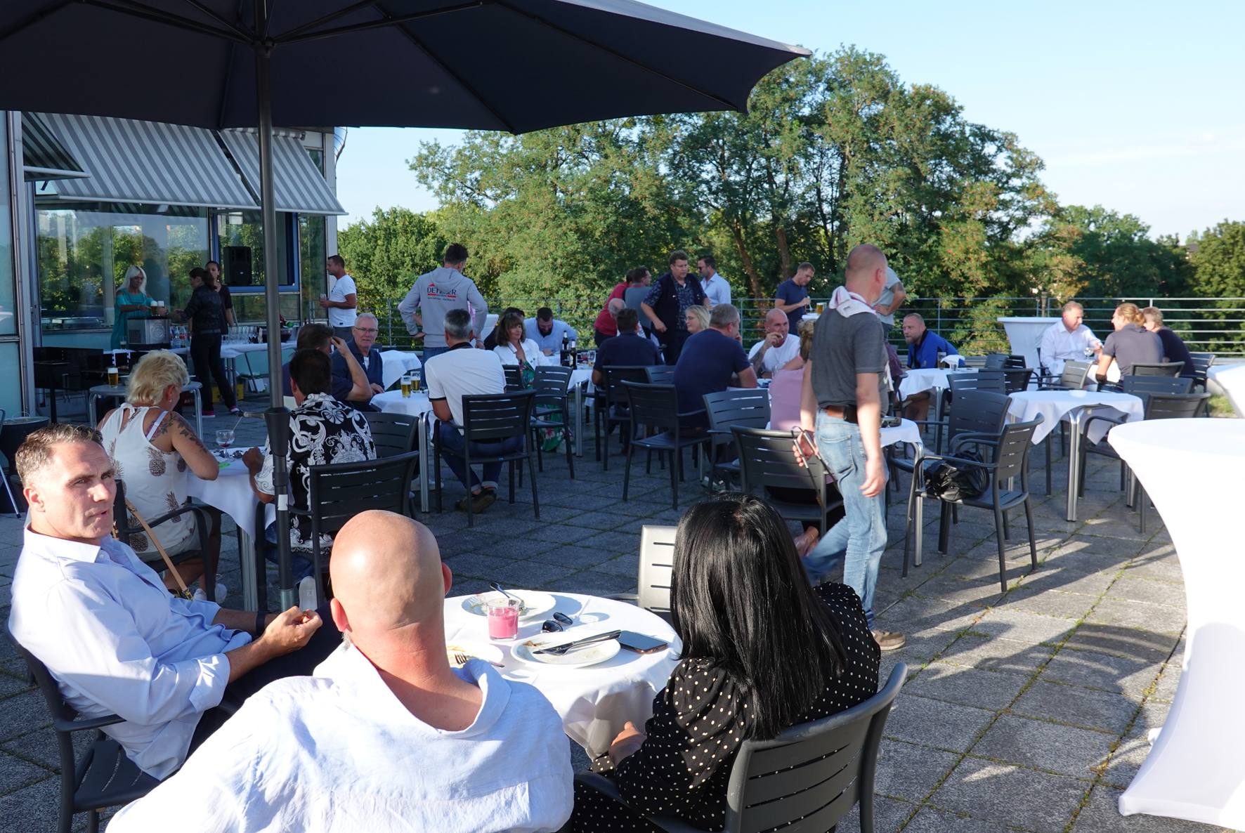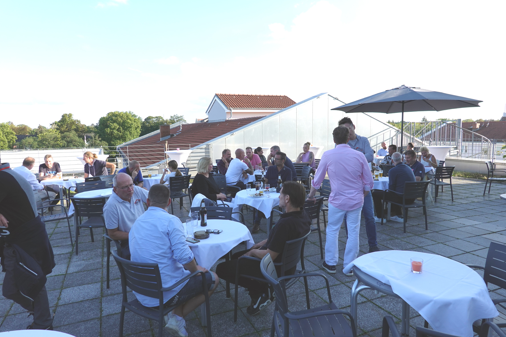 Bei sommerlichen Temperaturen genossen die Dachdecker, die teilweise mit Ehefrau gekommen waren, die abendliche Stimmung auf der Dachterrasse, die zu später Stunde noch durch brennende Fackeln verstärkt wurde. Die Cafeteria des Bildungszentrums sorgte dafür, dass alle ausreichend mit gegrillten Köstlichkeiten und Salaten sowie Getränken aller Art versorgt wurden.