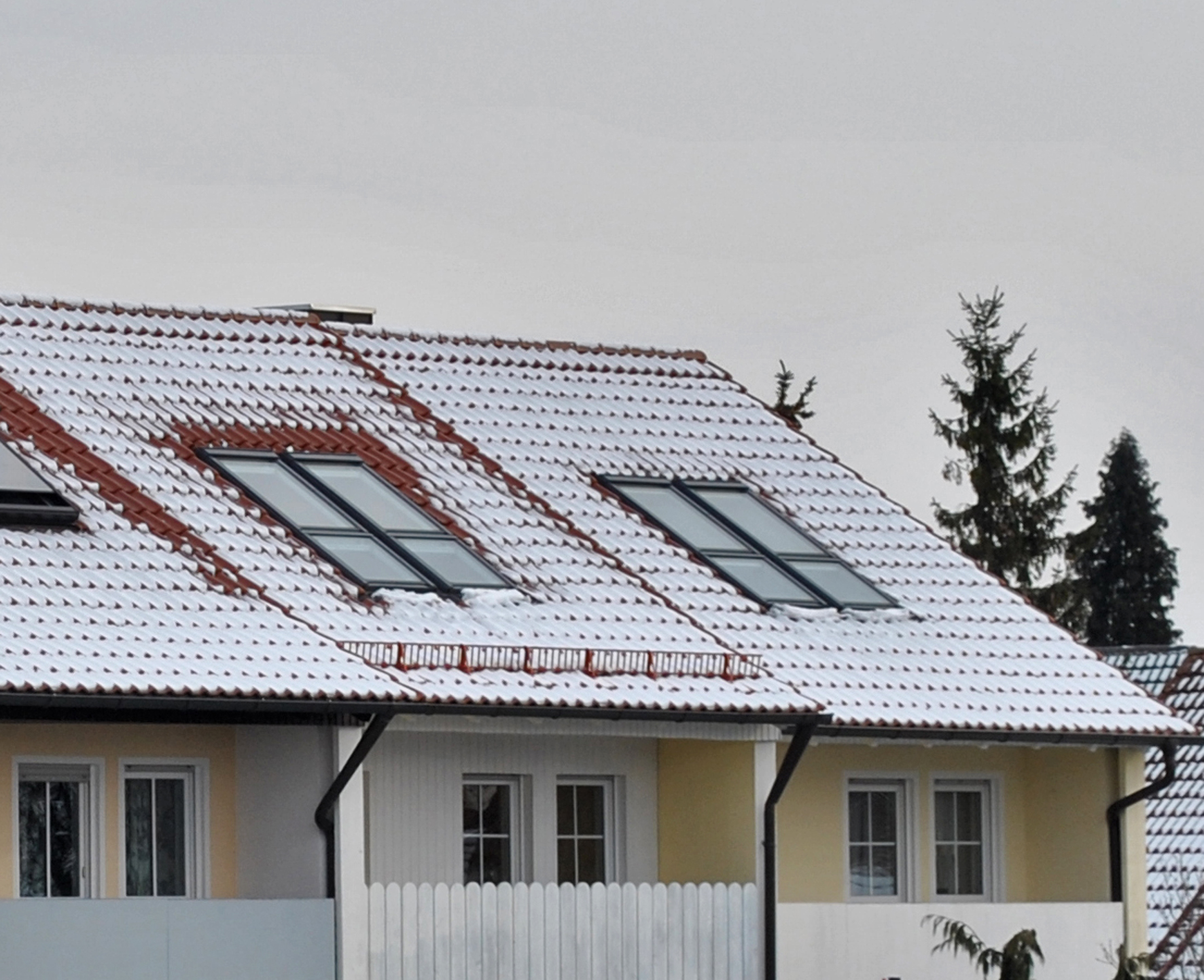 Eine geschlossene Schneedecke auf dem Dach – auch rund um die Dachfenster – zeigt, dass hier die Dämmung optimal ist und keine Wärmebrücken aufweist.