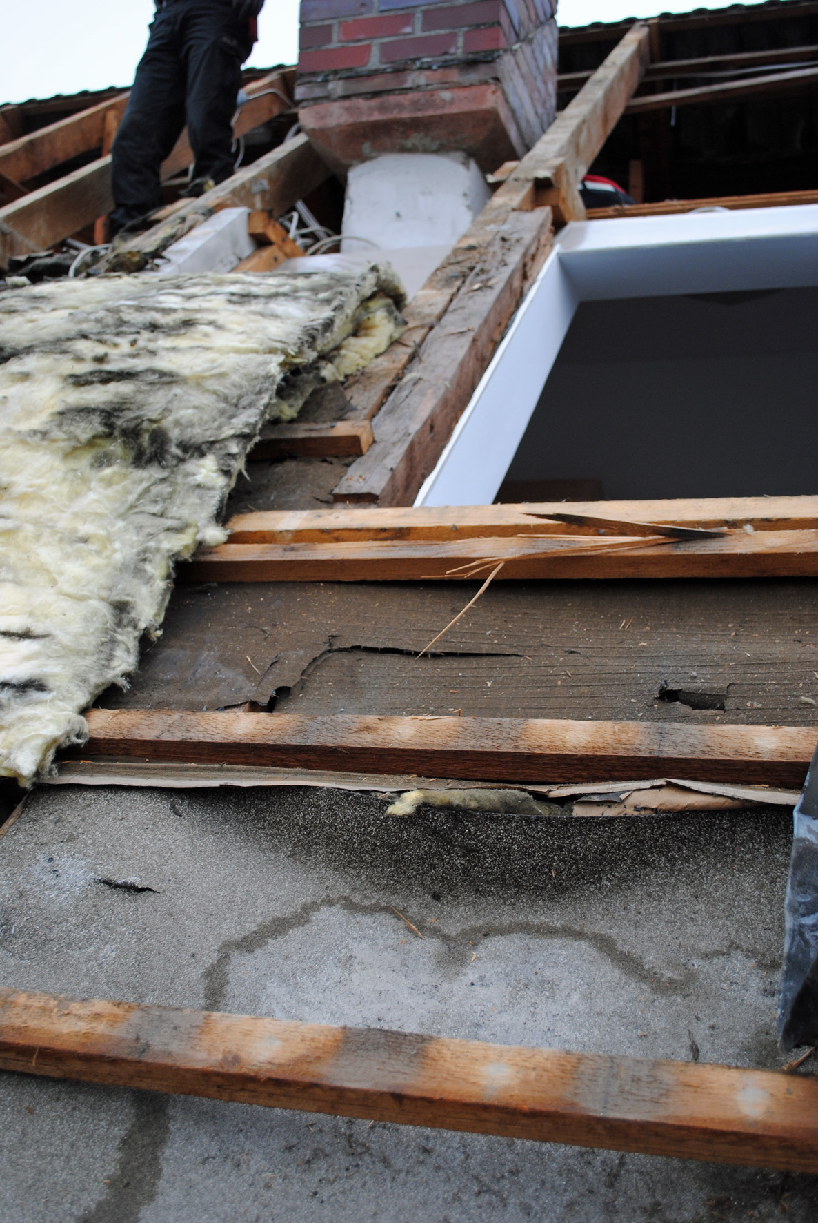 Von dieser Wärmedämmung und dem veralteten Dachfenster rechts ist ein Hitzeschutz im Sommer und kein Wärmeschutz im Winter mehr zu erwarten.