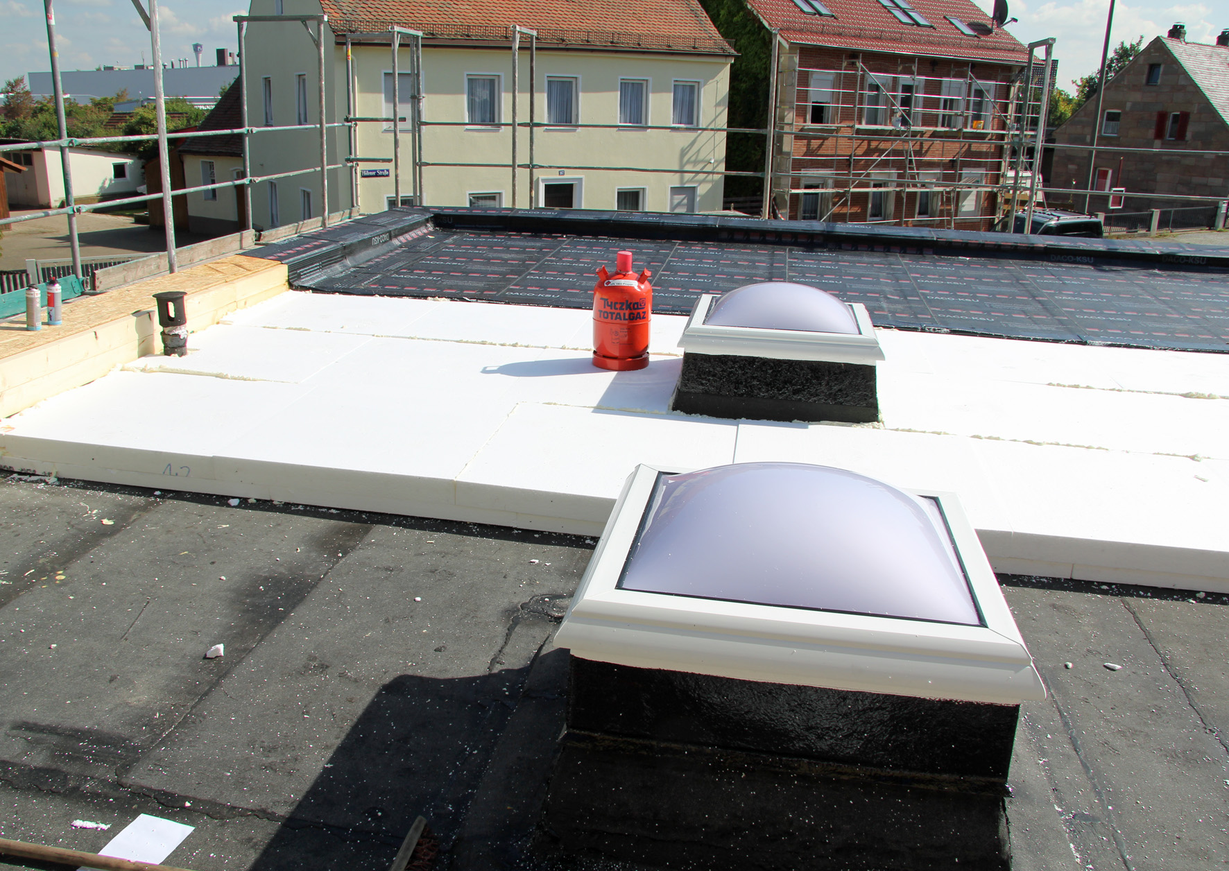 Die Flachdach-Abdichtung – ob mit Bitumen- oder mit Kunststoffbahnen - erfordert entsprechendes Fachwissen über die Materialeigenschaften, das richtige Temperaturfenster beim Verschweißen und die Sicherheit. So sind bei Arbeiten mit offener Flamme zwingend Feuerlöscher auf der Baustelle vorgeschrieben.