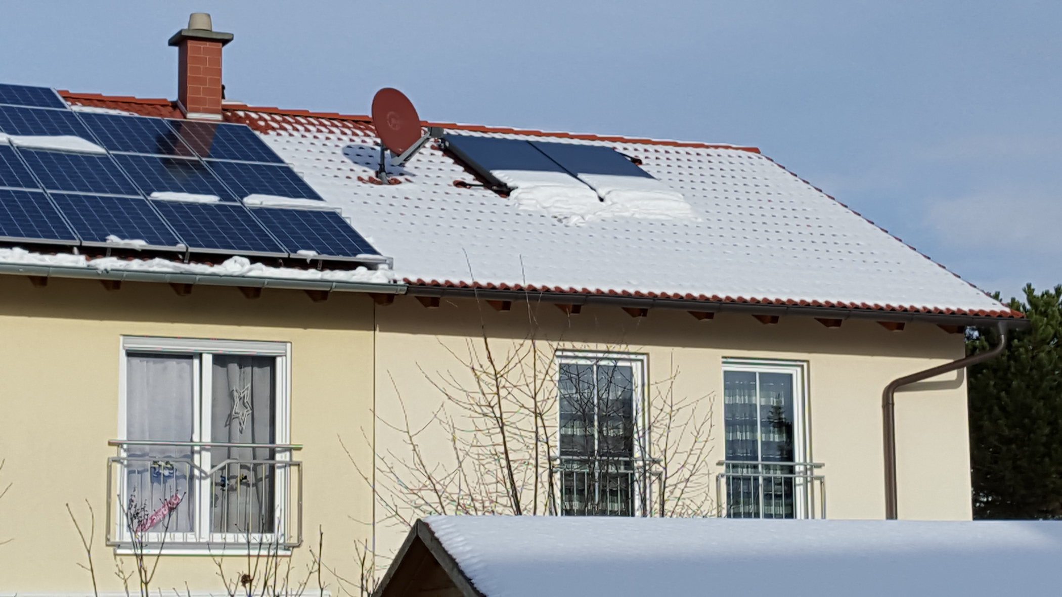 Auch schneebedeckte Solaranlagen stellen die Stromproduktion nicht vollständig ein. Meist erledigt sich das Problem je nach Dachneigung binnen weniger Stunden oder Tage durch das Abrutschen der Schneelage.
