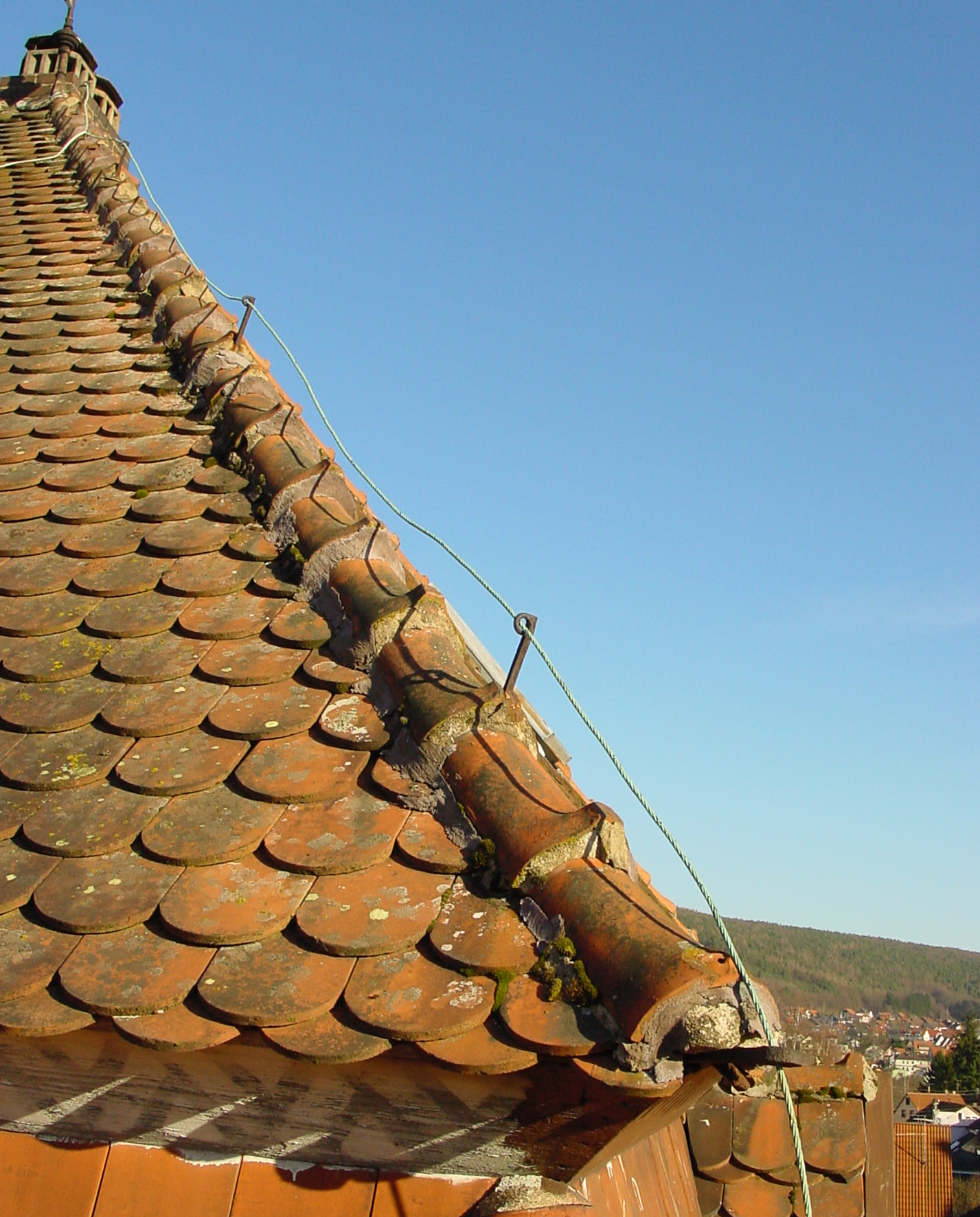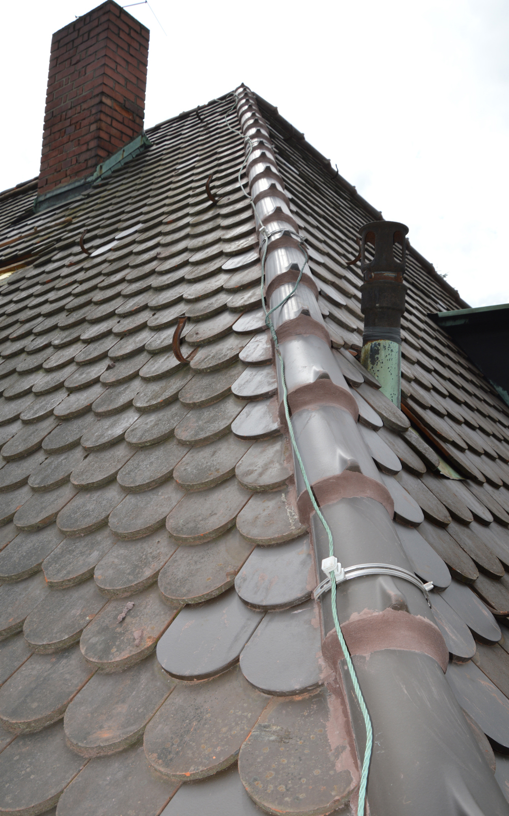 Blitzschutz, Lüfterrohre und Kamineinfassungen haben hier ihre besten Zeiten schon hinter sich und stellen große Gefahrenquellen dar.