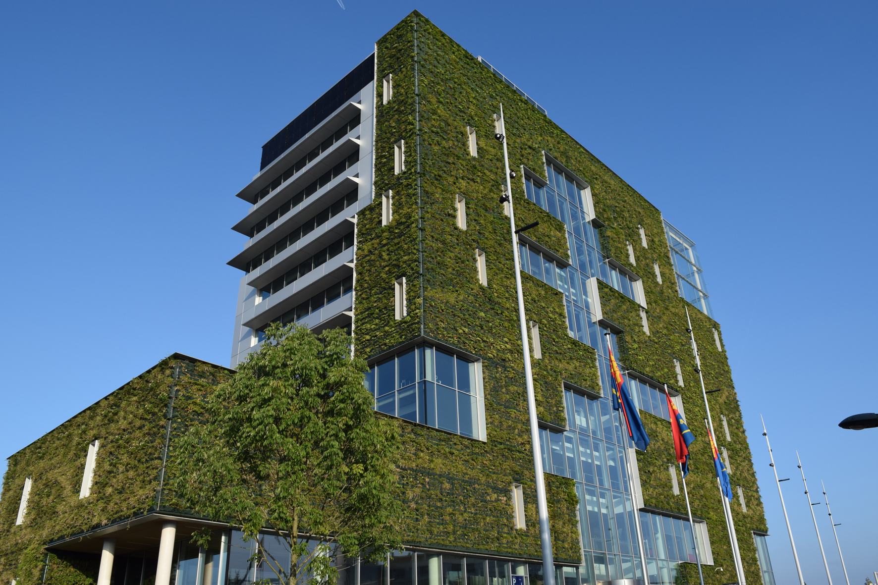 An speziellen Kassetten mit eigenem Bewässerungssystem an der Fassade begrünt eine wahre Pflanzenvielfalt das Haus. Foto: Bundesverband GebäudeGrün e. V.