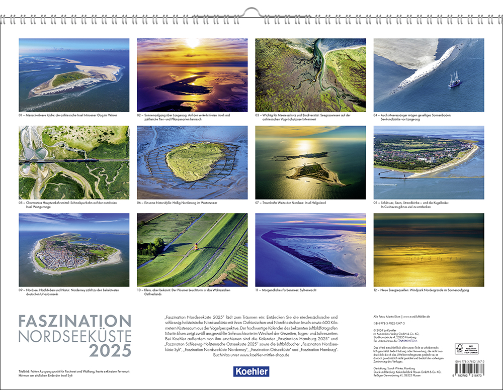 Außerdem erscheinen die neuen Wandkalender von Martin Elsen mit überraschenden Blickwinkeln auf die Nordseeküste, die Stadt Hamburg sowie erstmals die schleswig-holsteinische Ostseeküste. Die Werke präsentieren je zwölf ausgewählte Sehnsuchtsorte aus der Vogelperspektive, facettenreich eingefangen in einem eindrucksvollen Spiel von Licht und Farbe.