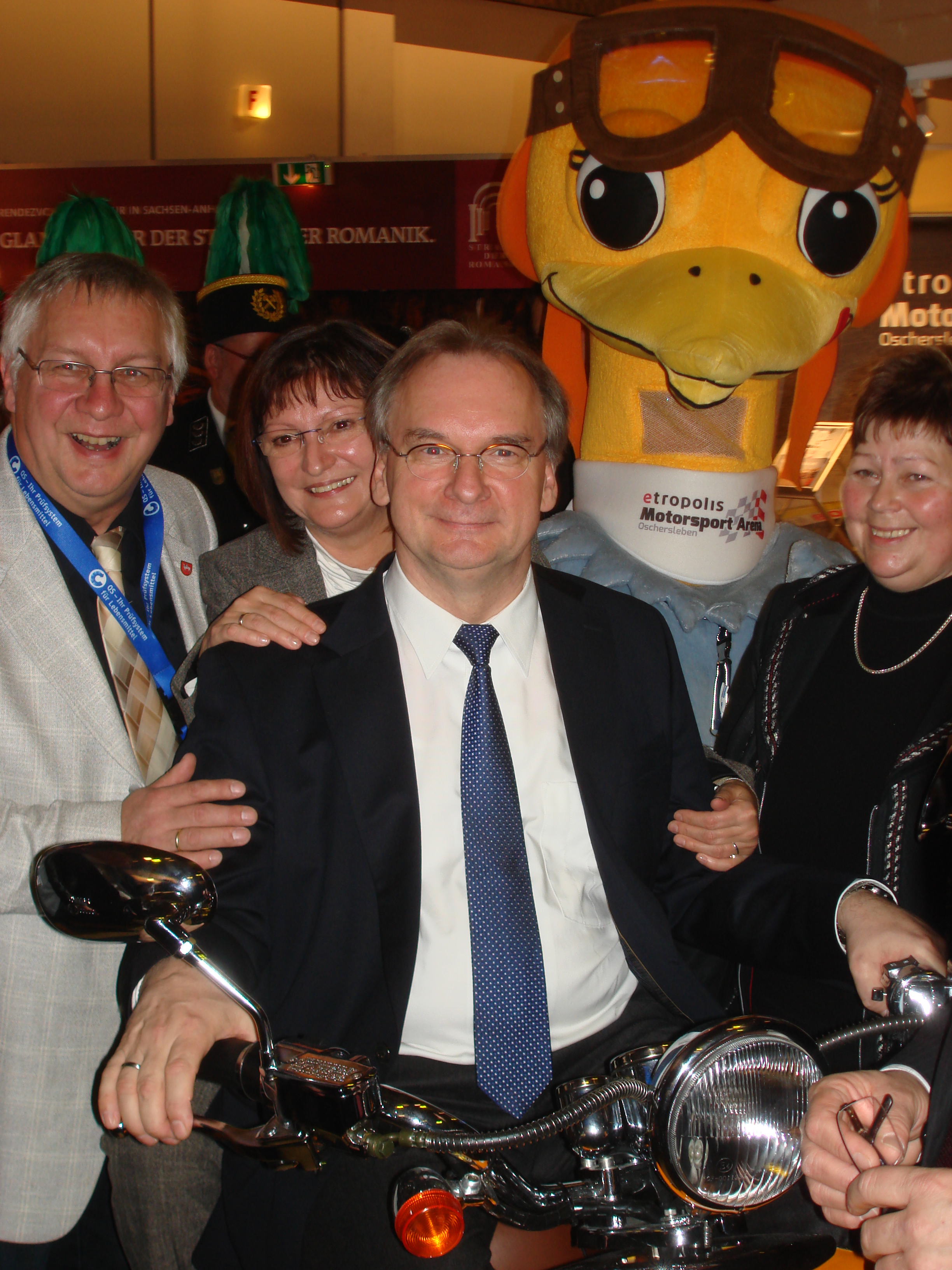 Am Sachsen-Anhalt Tag schaute auch Ministerpräsident Dr. Rainer Haseloff mit Frau Gabriele am Stand der Rennstrecke vorbei und nahm auf einem Elektroroller von etropolis, dem neuen Namensgeber des Rundkurses in der Magdeburger Börde, Platz. Die etropolis Motorsport Arena Oschersleben präsentiert auf dem Gemeinschaftsstand der Region Elbe-Börde-Heide die Termine und Angebote der Saison 2013. Dies ist unter anderem die DTM vom 13. bis 15. September, bei der der Ministerpräsident des Landes Sachsen-Anhalt auch in diesem Jahr Schirmherr sein wird.