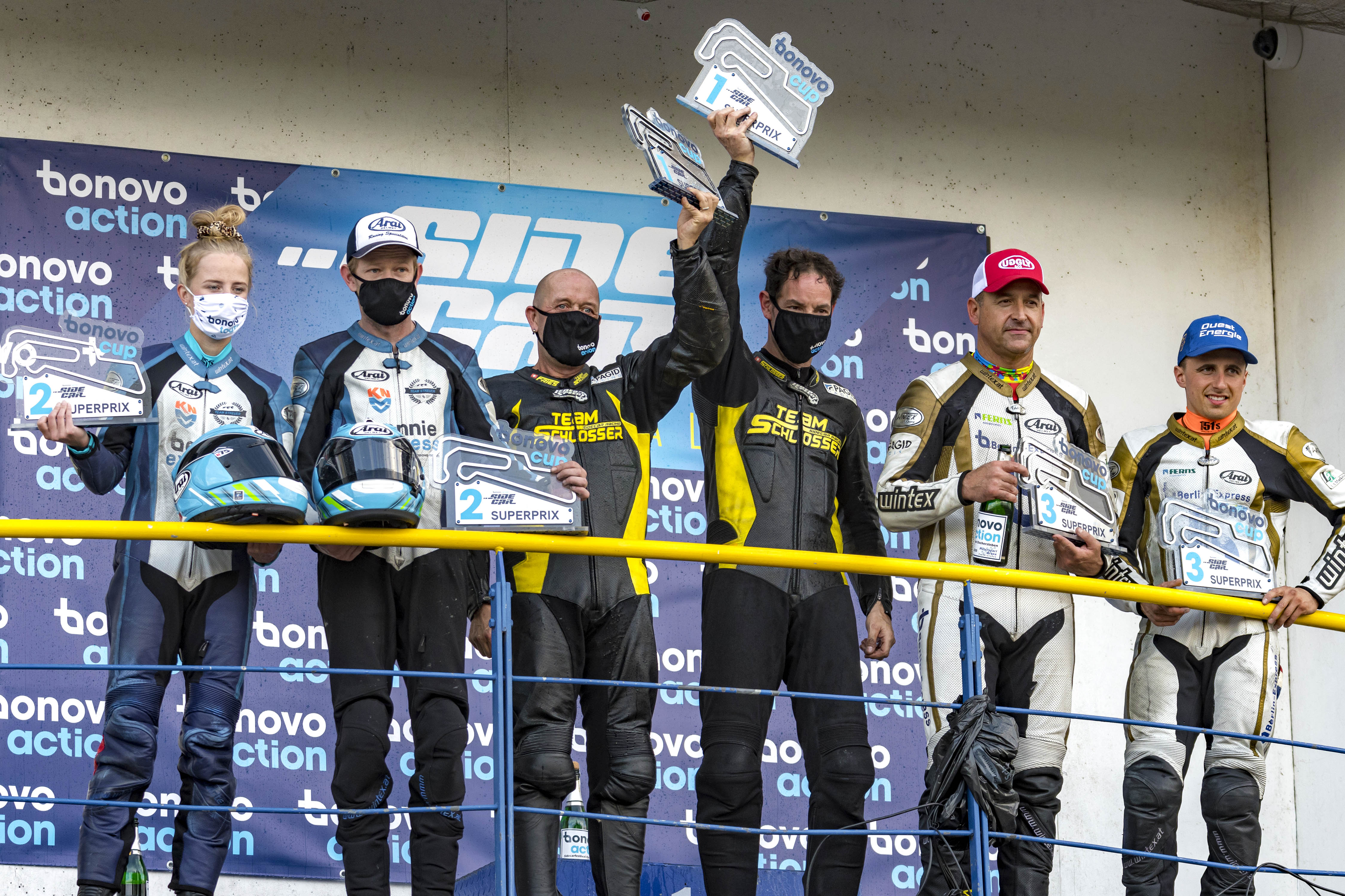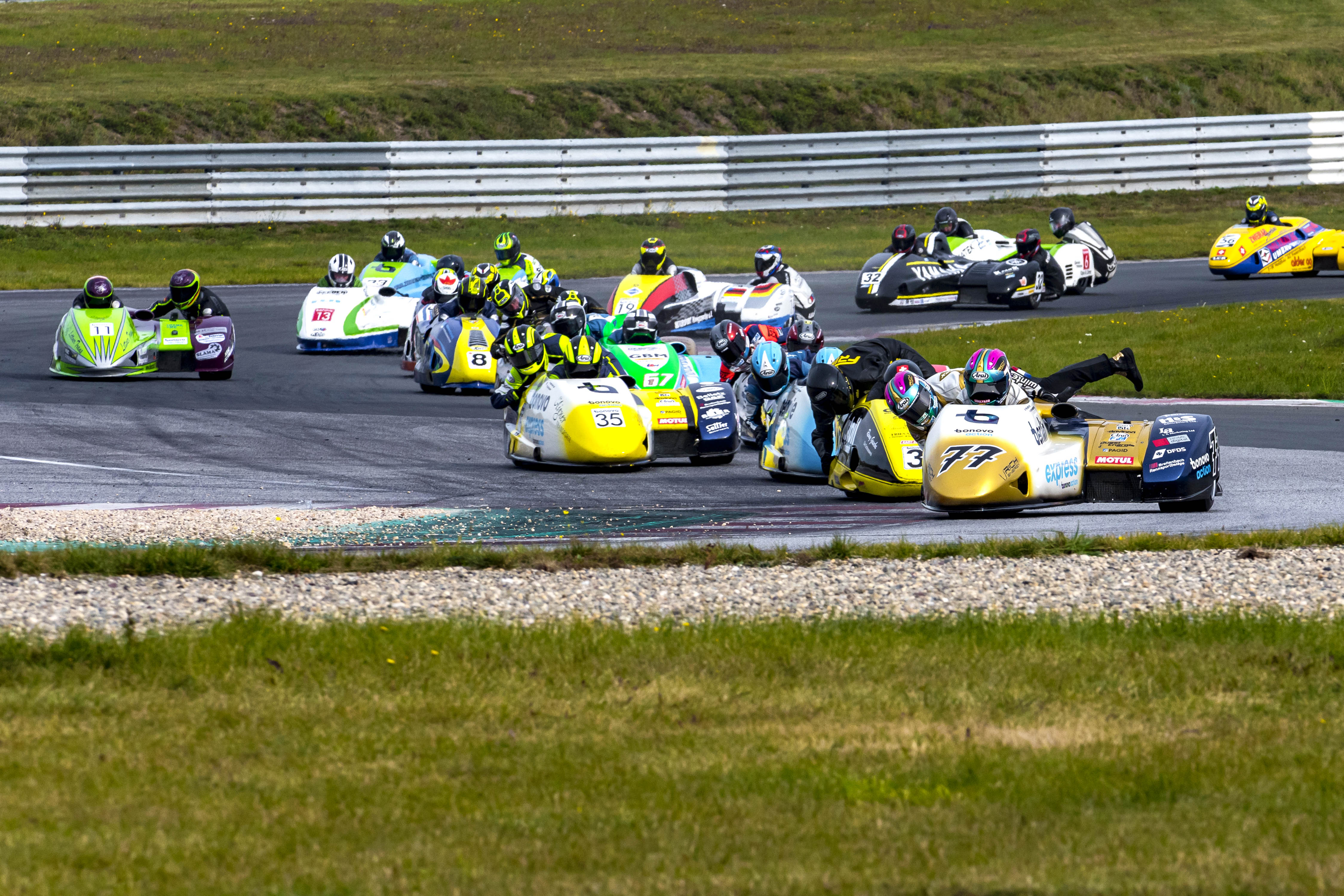Auch das Sidecar-Einladungsrennen förderte fahrerische Brillanz zu Tage. Nach beiden Rennen erklang die Schweizer Nationalhymne für das Team Schlosser mit Markus Schlosser und Copilot Marcel Fries auf der obersten Podeststufe. Nachdem Tim Reeves und Kevin Rousseau für beide Rennen die Poleposition innehatten, nutzte Schlosser im ersten Lauf den Überrundungsverkehr und im Zweiten einen besseren Start, um in Führung zu gehen. Diesen Start verpatzte Reeves, fiel einige Plätze zurück und musste sich bis auf Rang vier wieder nach vorne kämpfen. Unterm Strich verloren Reeves und Rousseau dadurch den zweiten Gesamtrang an Benni Streuer und Ilse de Haas vom Schwesterteam, das im ersten Durchgang Dritter und im Zweiten Zweiter wurde. Schlosser und Fries holten sich die Pokale für den Gesamtsieg und ein Preisgeld von 5.000,- Euro beim ersten „Sidecar Superprix by Bonovo Action“.
