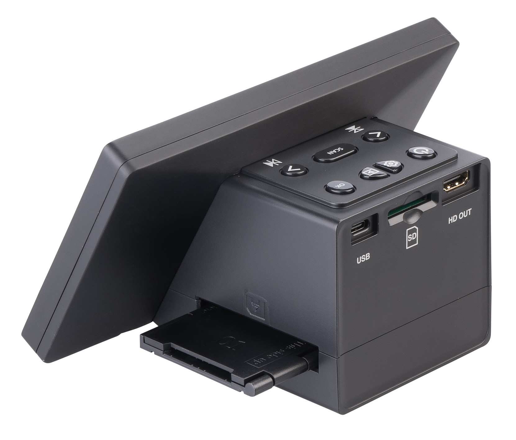 Flexible Anschlussmöglichkeiten: Die Speicherung der digitalisierten Bilder erfolgt auf einer Speicherkarte mit einer Kapazität von bis zu 128 GB. Über den HDMI-Ausgang können die Bilder auch direkt auf einem Fernseher oder Monitor wiedergegeben werden.