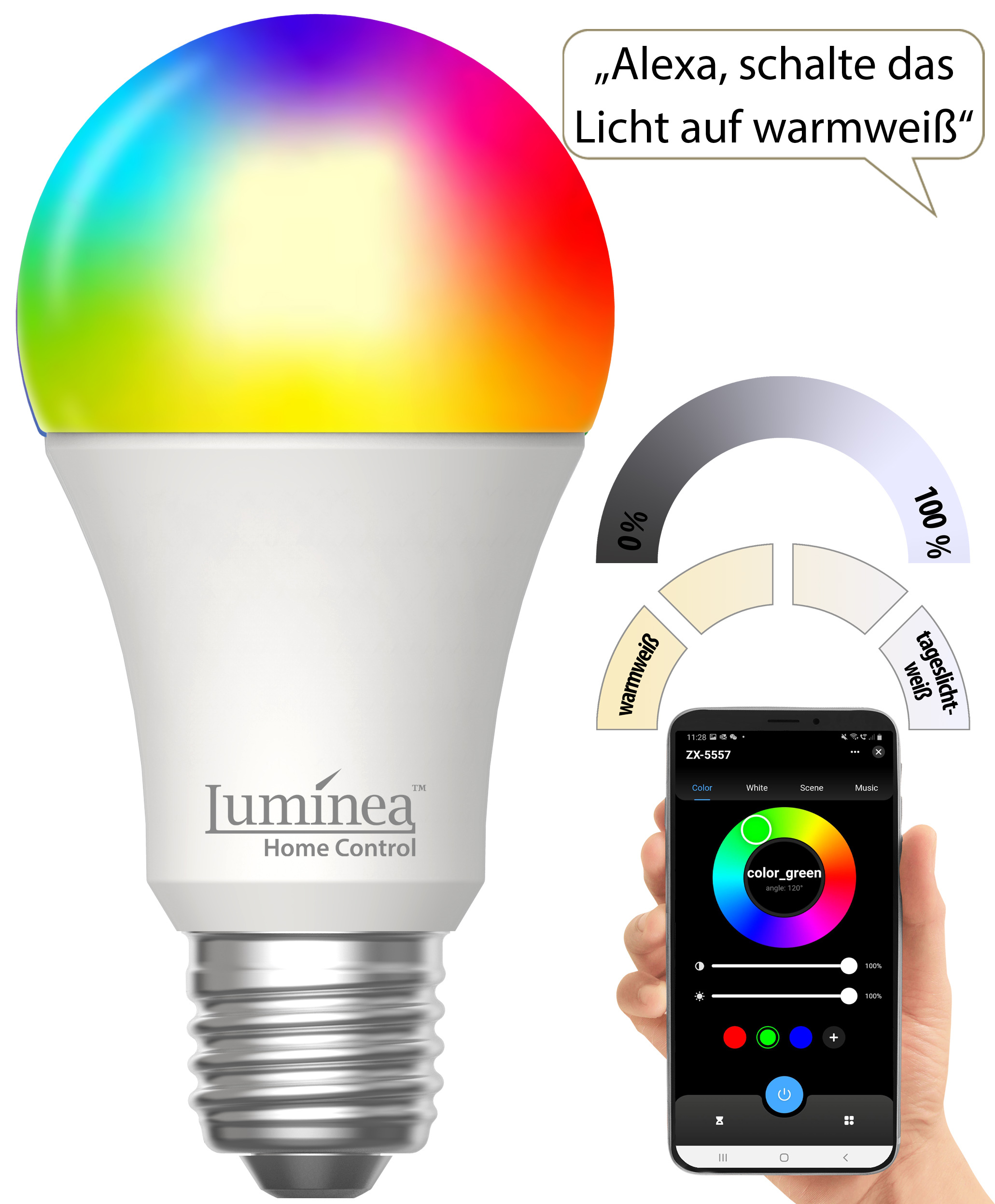Mit der WLAN-LED-Lampe E27 von Luminea Home Control lässt sich die Beleuchtung individuell anpassen. Helligkeit, Farbtemperatur und Lichtfarbe lassen sich per iPhone, Android-Smartphone oder Tablet-PC steuern. Das Licht erstrahlt wahlweise in Warmweiß bis Tageslichtweiß oder in einer von 16 Millionen verfügbaren Farben.
