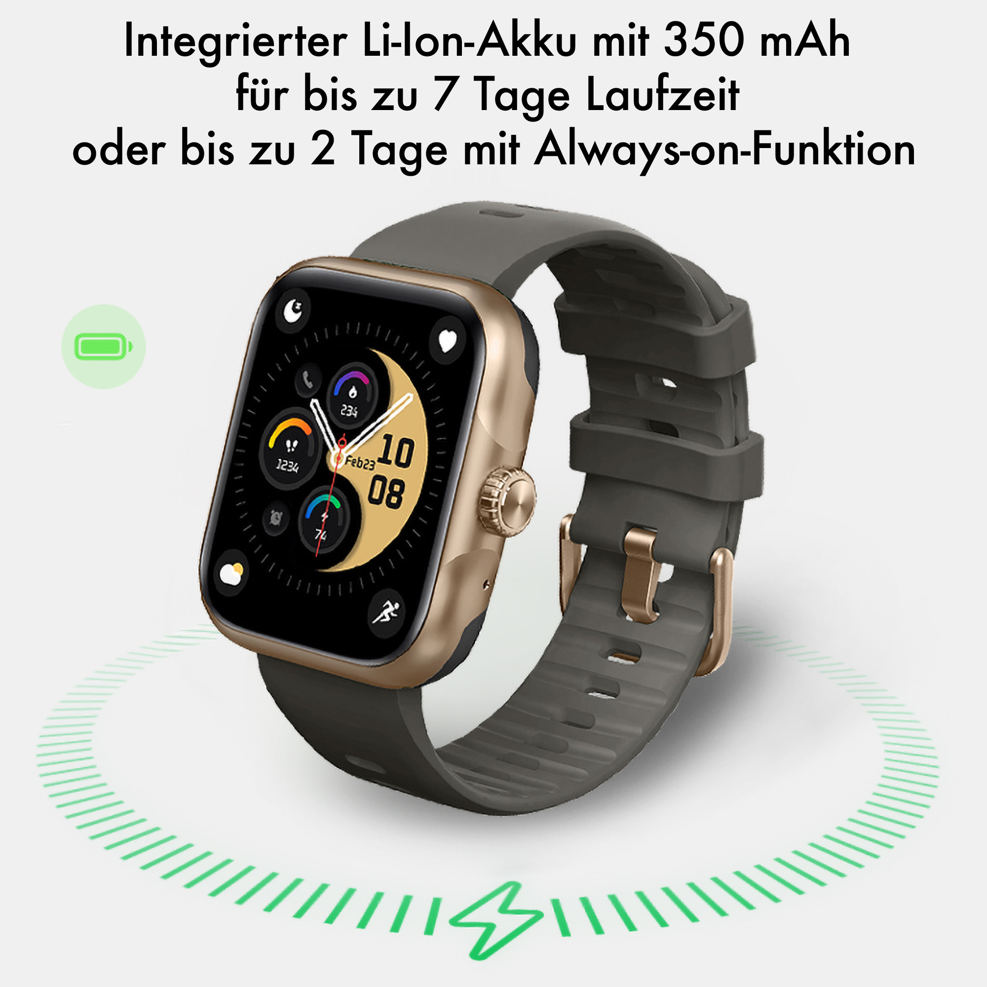 Die Fitness-Smartwatch mit GPS, Herzfrequenzs- und SpO2-Sensor von newgen medicals verfügt über ein schwarzes Aluminiumgehäuse mit mattgoldenem Rahmen. Die hochwertigen Materialien werden mit einem 1,78 Zoll großen AMOLED-Touch-Farbdisplay kombiniert, das eine Auflösung von 368 x 448 Pixeln bietet. Auf Wunsch kann das Display dauerhaft eingeschaltet bleiben, so dass Informationen wie die Uhrzeit immer sichtbar sind. Zur individuellen Gestaltung stehen verschiedene Watchfaces zur Verfügung.
