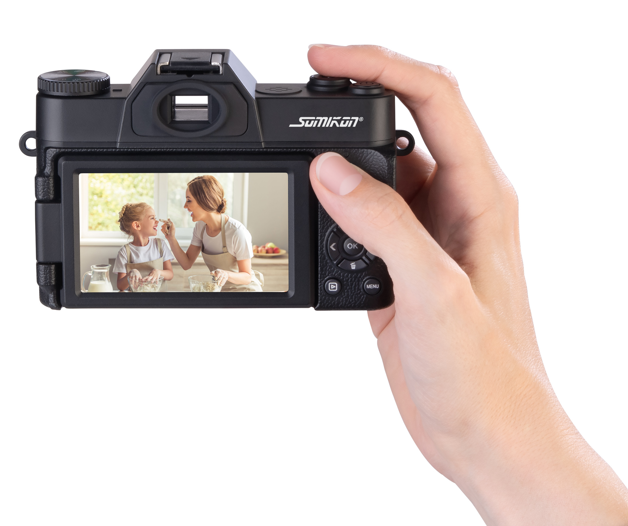 (lifepr) (Buggingen, 25.11.2024) Die Somikon 4K-UHD-Digitalkamera mit 3"-Flip-HD-Display, Makroobjektiv und WLAN bietet mit einem nativen 13-Megapixel-CMOS-Sensor eine beeindruckende Bildqualität. Der 16-fache Digitalzoom und die Makrolinse ermöglichen detailreiche Nahaufnahmen. Drei Fokus-Modi - Autofokus, manueller Fokus und Fixfokus - bieten Flexibilität für unterschiedliche Aufnahmesituationen. Die Anti-Shake-Funktion sorgt für scharfe Bilder auch bei Bewegungen, die integrierte LED für optimale Ausleuchtung bei schlechten Lichtverhältnissen. Die WLAN-Konnektivität ermöglicht die einfache Übertragung der Aufnahmen. Das ausklappbare 3"-Display erleichtert Selfies und Aufnahmen aus verschiedenen Winkeln. Ideal für Vlogs und Makro-Aufnahmen.