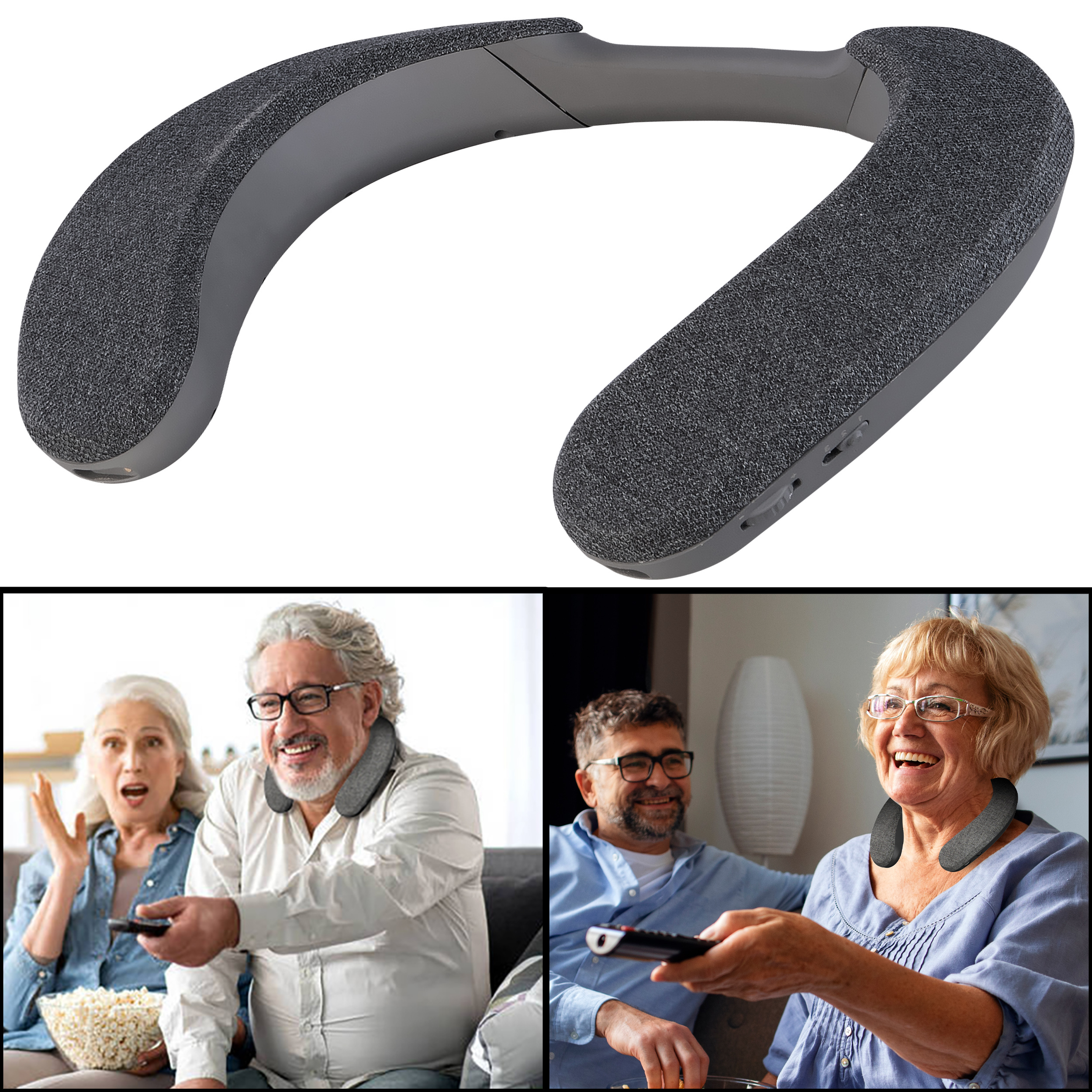 Hoher Tragekomfort auch mit Brille: Der ergonomisch geformte Nackenlautsprecher schmiegt sich sanft um den Nacken, ohne Druck auf die Ohren auszuüben. Im Gegensatz zu herkömmlichen Kopfhörern liegt der Nackenlautsprecher auch nicht auf den Brillenbügeln auf. Das ermöglicht stundenlanges Tragen, ohne dass die Brille stört oder Druckstellen hinter den Ohren entstehen.