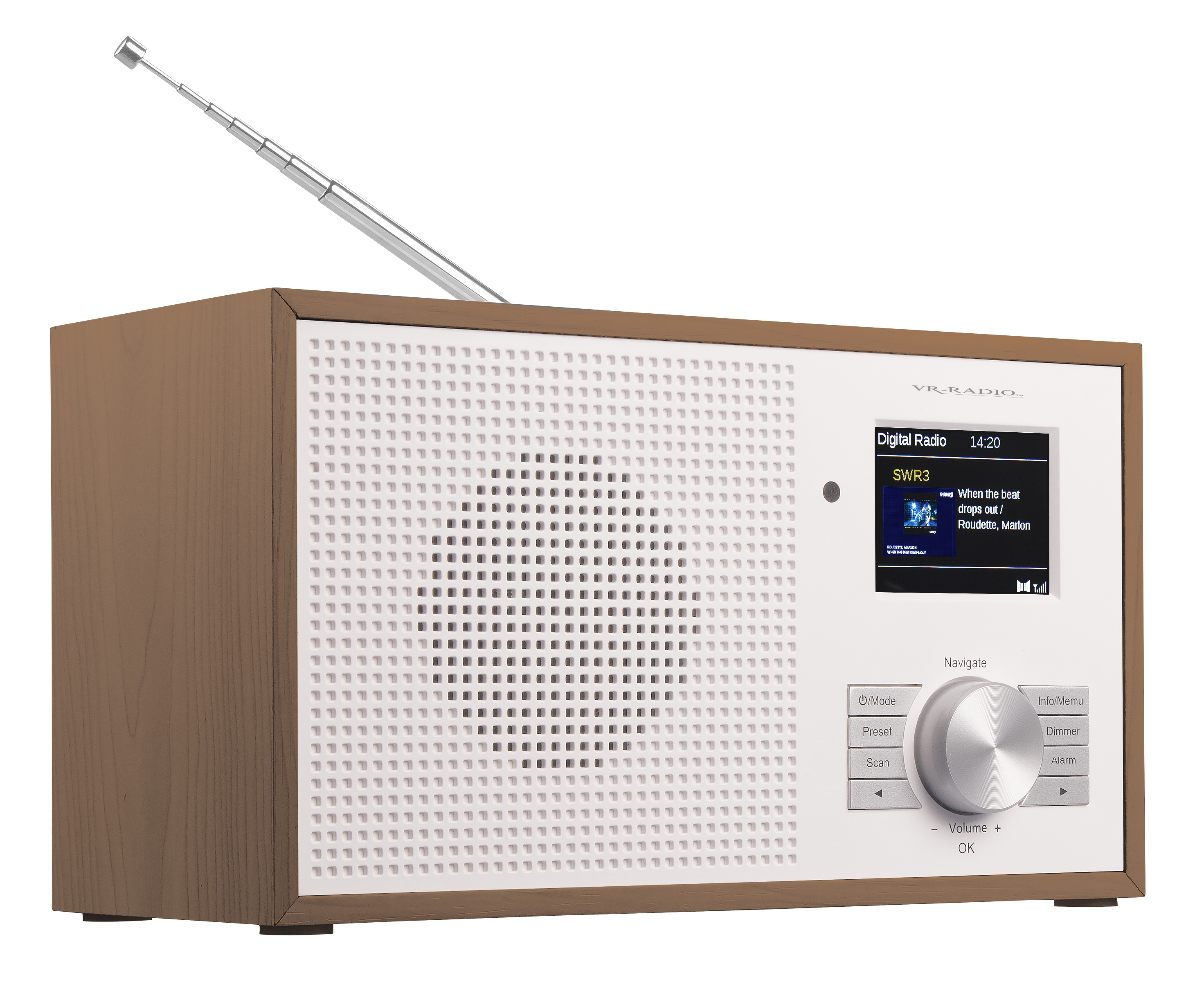 Das DAB+ Radio im nostalgischen Retro-Design in Walnuss-Optik von VR-Radio verbindet klassische Ästhetik mit modernster Technik. Das Gerät vereint ein hochwertiges Äußeres mit einem leistungsstarken Innenleben, das für hervorragenden Klang und umfangreiche Funktionen steht. Ein integriertes Farbdisplay stellt wichtige Informationen wie Sendername, Titel und Interpret übersichtlich dar.