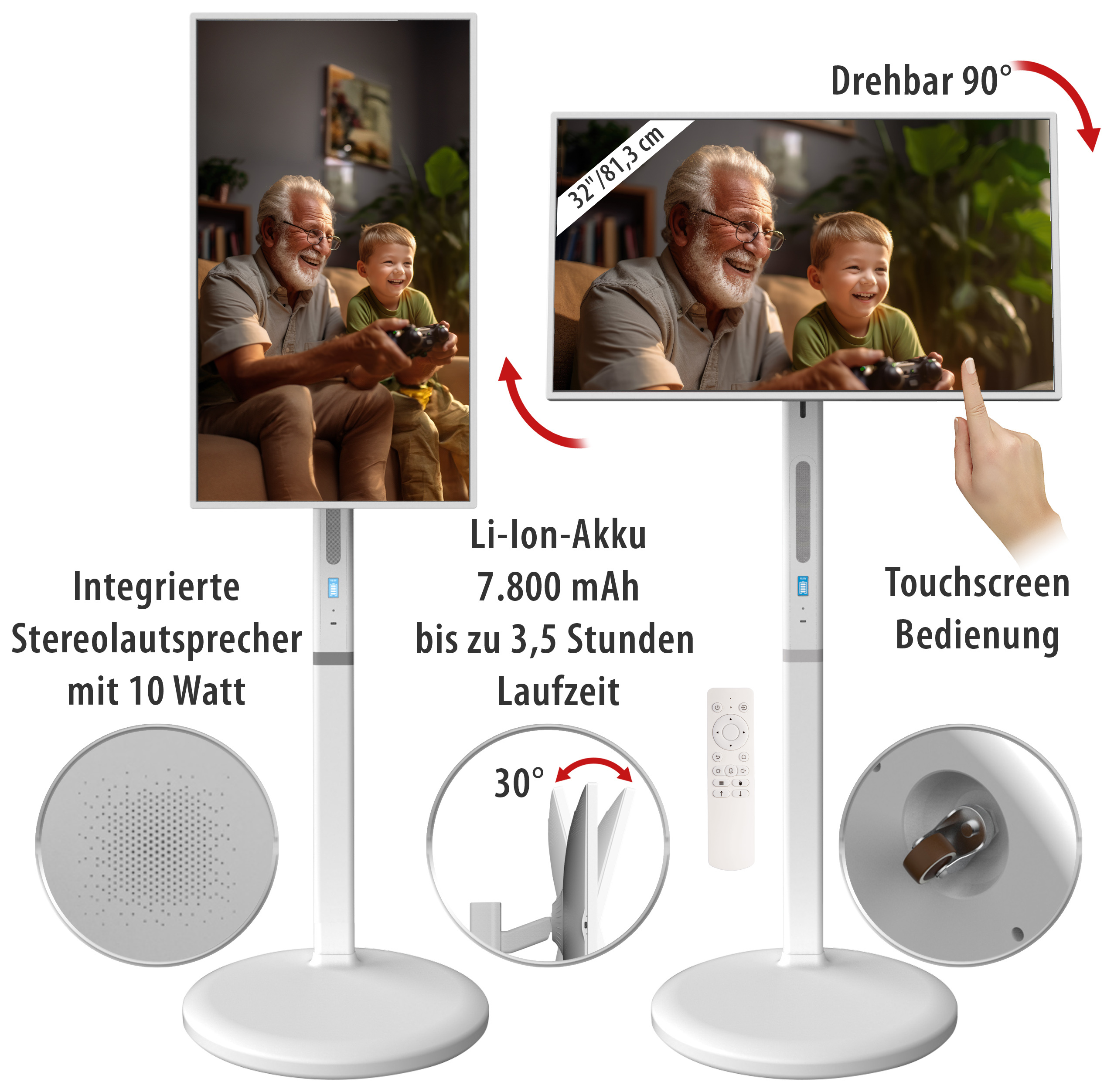 (lifepr) (Buggingen, 10.12.2024) Der mobile Smart-Bildschirm ST-320 von auvisio mit 32 Zoll bietet maximale Flexibilität und modernste Technologie. Das Full-HD-Display überzeugt mit einer hohen Helligkeit von 300 cd/m² und verfügt über einen integrierten Akku mit 7.800 mAh, der eine Laufzeit von bis zu 3,5 Stunden ermöglicht. Integrierte Stereo-Lautsprecher mit einer Spitzenleistung von 10 Watt sorgen für einen kraftvollen Sound. Die Bedienung erfolgt wahlweise über die Fernbedienung oder direkt am Multitouch-Display. Das Gerät eignet sich hervorragend zum Streamen von Inhalten wie YouTube, Netflix oder Amazon Prime. Dank Android 13, WLAN- und Bluetooth-Konnektivität präsentiert sich der Smart Screen als vielseitiges Multimediagerät.