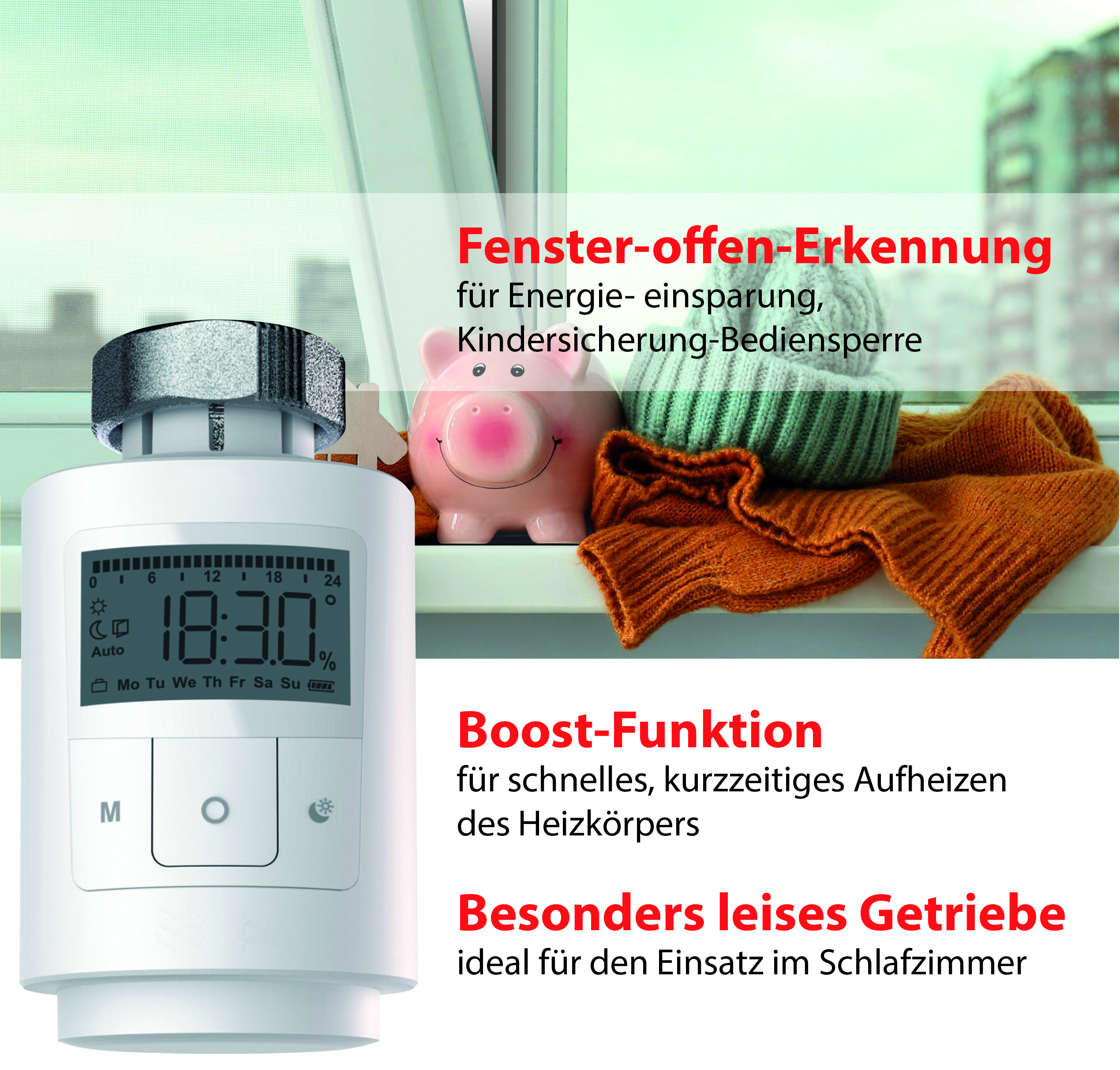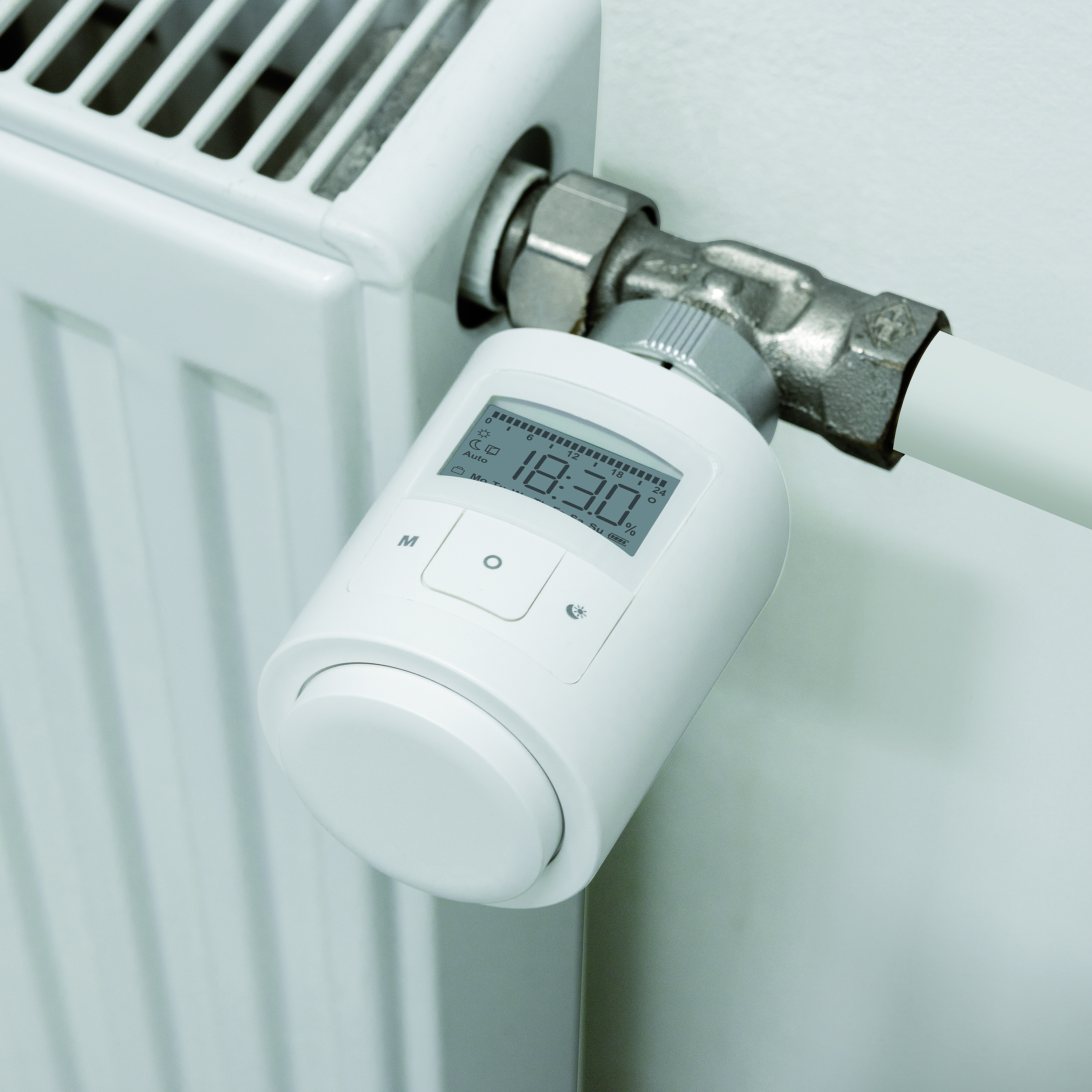 Der programmierbarer Heizkörperthermostat von revolt bietet die Möglichkeit, Heizkosten zu senken und den Energieverbrauch effizienter zu gestalten. Vor allem in Gebäuden mit älterem Energiestandard sind Einsparungen von bis zu 30 Prozent möglich.
